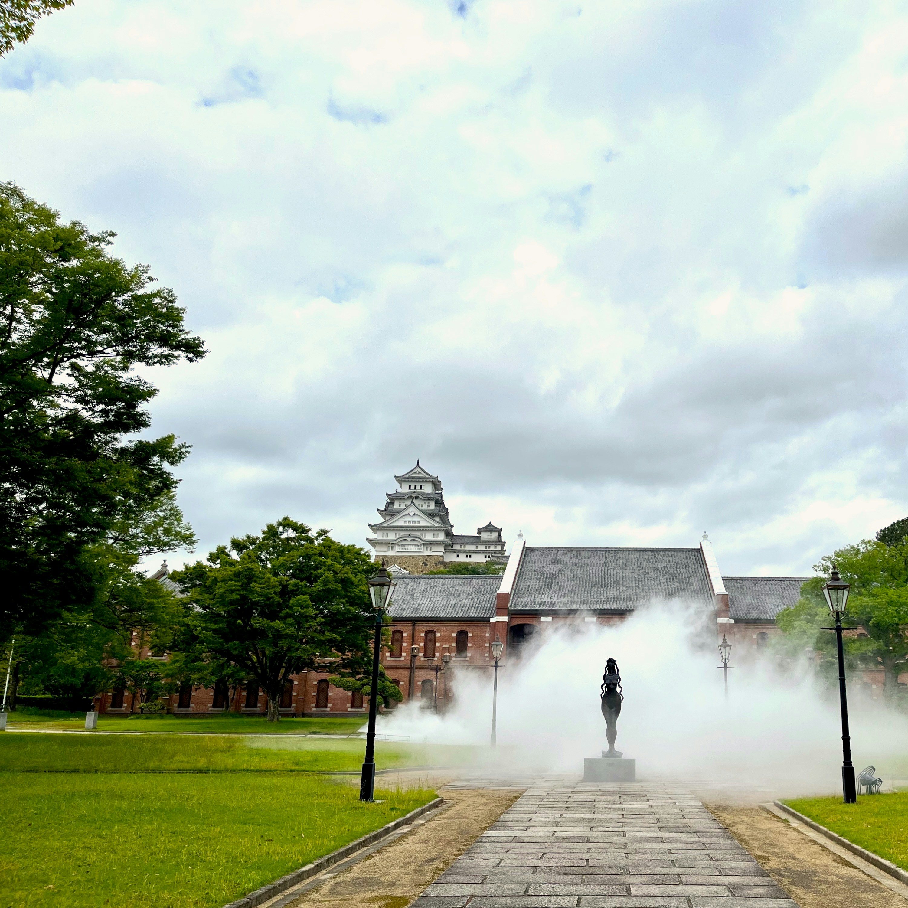 庭園に広がった霧の向こうからは、明治時代末の建築である旧陸軍第10師団の兵器庫、被服庫を活用した、姫路市立美術館の歴史的な建築が顔をのぞかせる。さらにその屋根の向こうには、世界文化遺産・姫路城の威容を望むことができる。タイトルには「原初の地球」とあるが、本作はこうした作品を取り囲む歴史的建造物が建つよりはるか前、この地にあった原初的な風景を創出しているようにも感じられる。