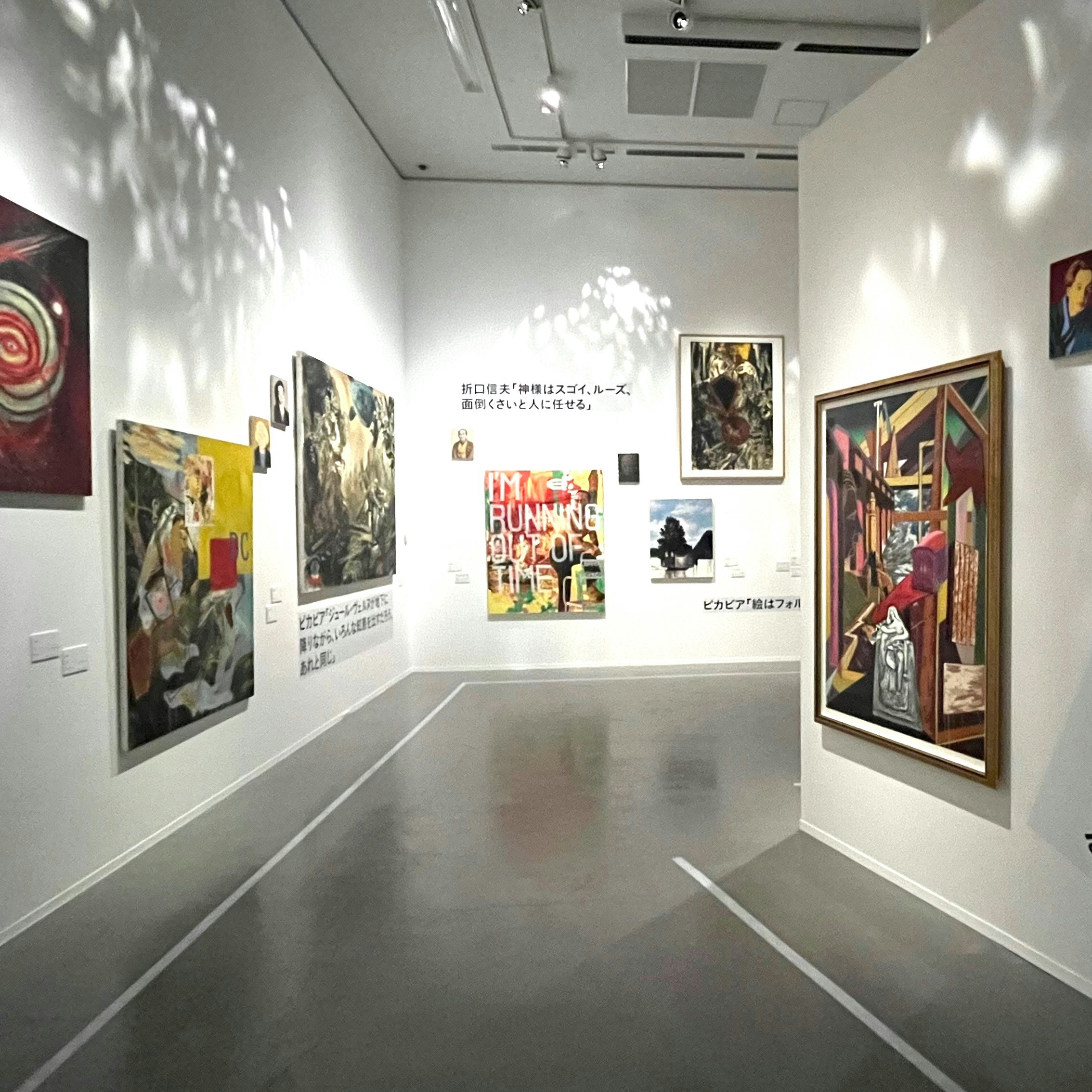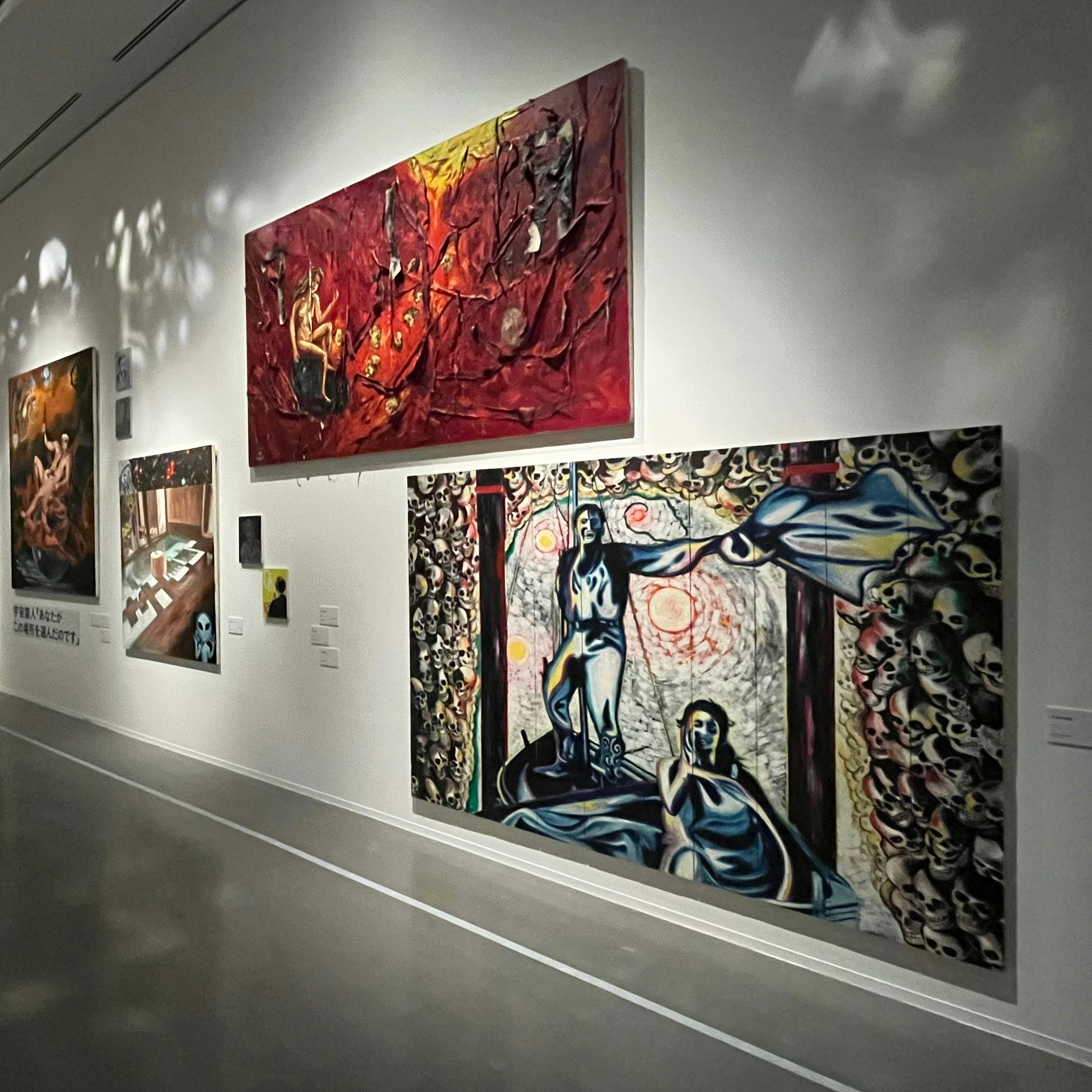 2階の「原郷の森への誘い」の展示室内に入ると、膨大な数の横尾の絵画とともに、小説に登場する誰もが知る歴史的な人物の言葉が来場者を迎える。