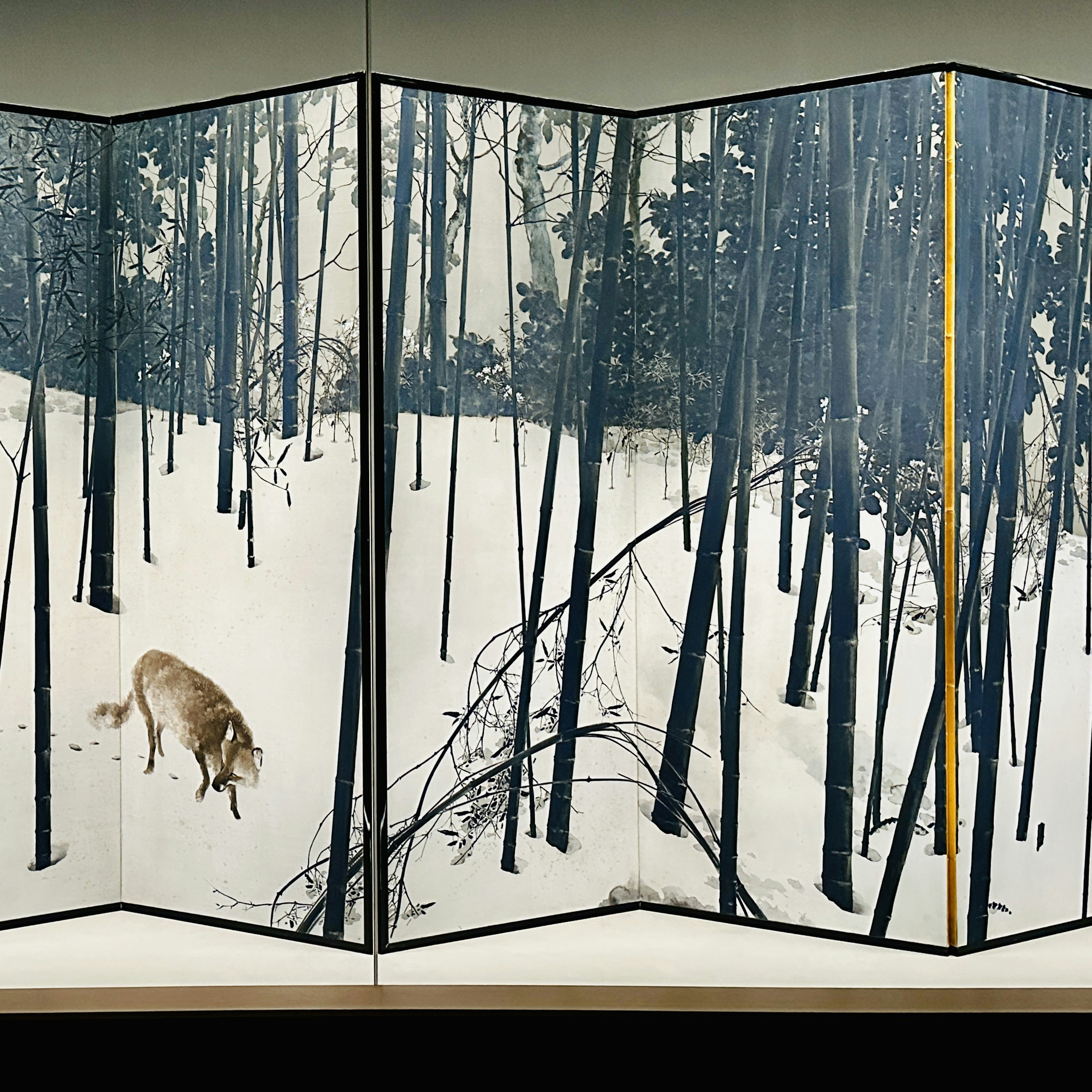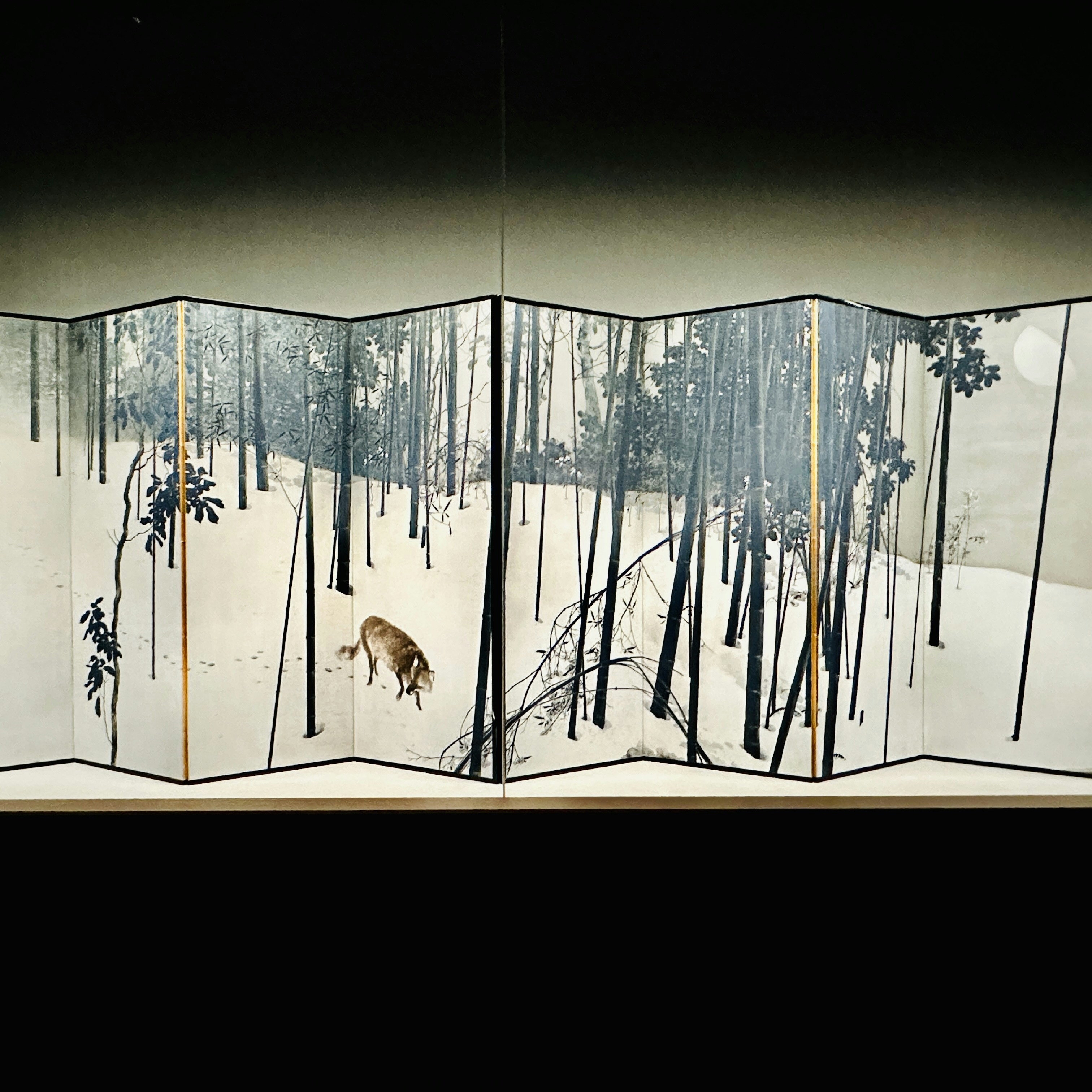 雪が積もった竹林に1頭の狐、そして空に浮かぶ月。月夜の鞍馬で残雪にのこされた獣の足跡を見た経験から生まれたというこの代表作は、一見水墨画のように見える。しかし実際は雪には白の胡粉が、空にはシルバーグレーの絵具が、丈には群青や緑青が使用されており、ざらついた質感と輝きが作品に一層の奥行きをもたらし、鮮やかさを与えている。