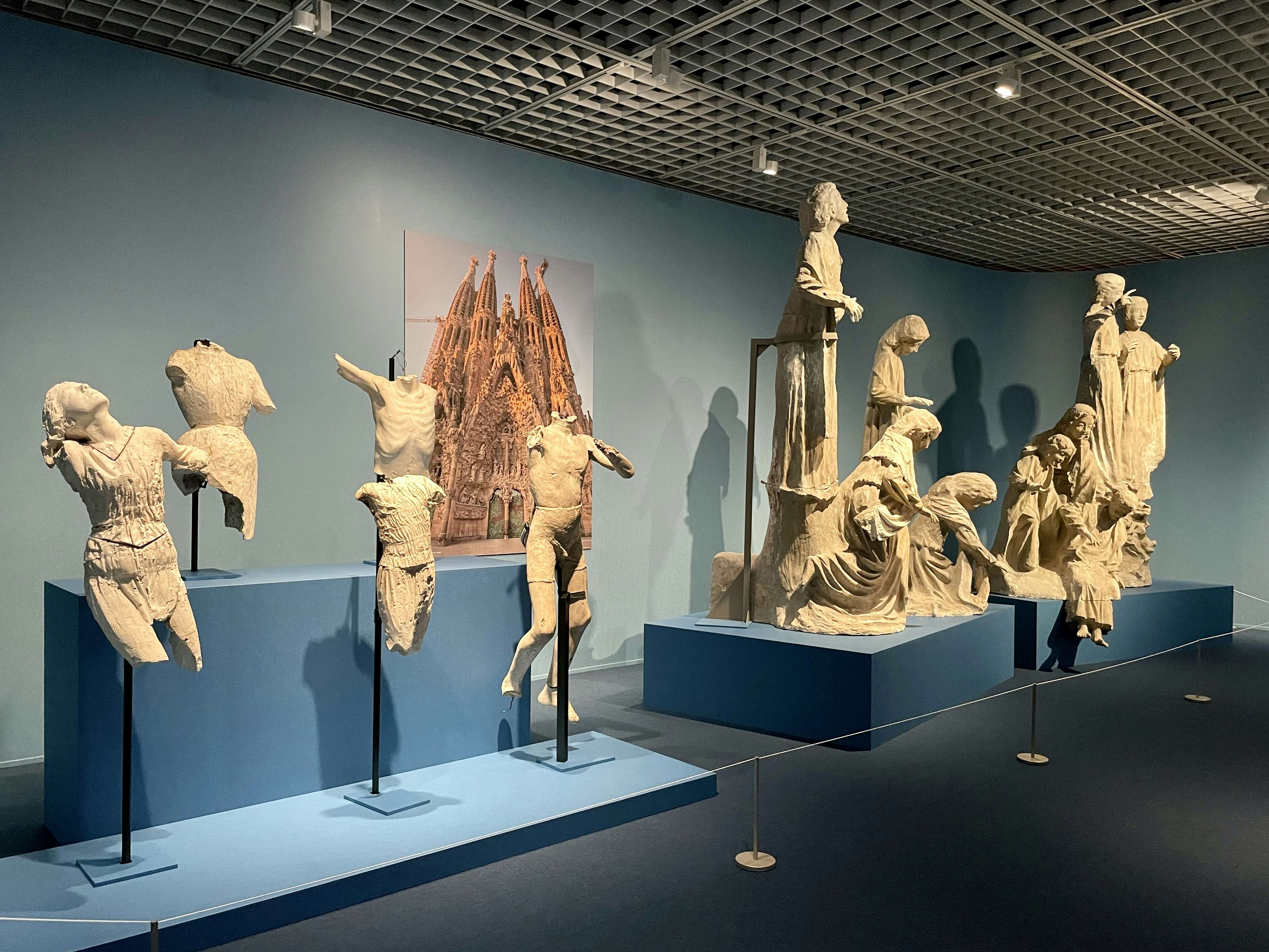 第3章の展示風景より、左の彫刻4体は「降誕の正面」に配置されたガウディによる彫刻群(1898-1900)