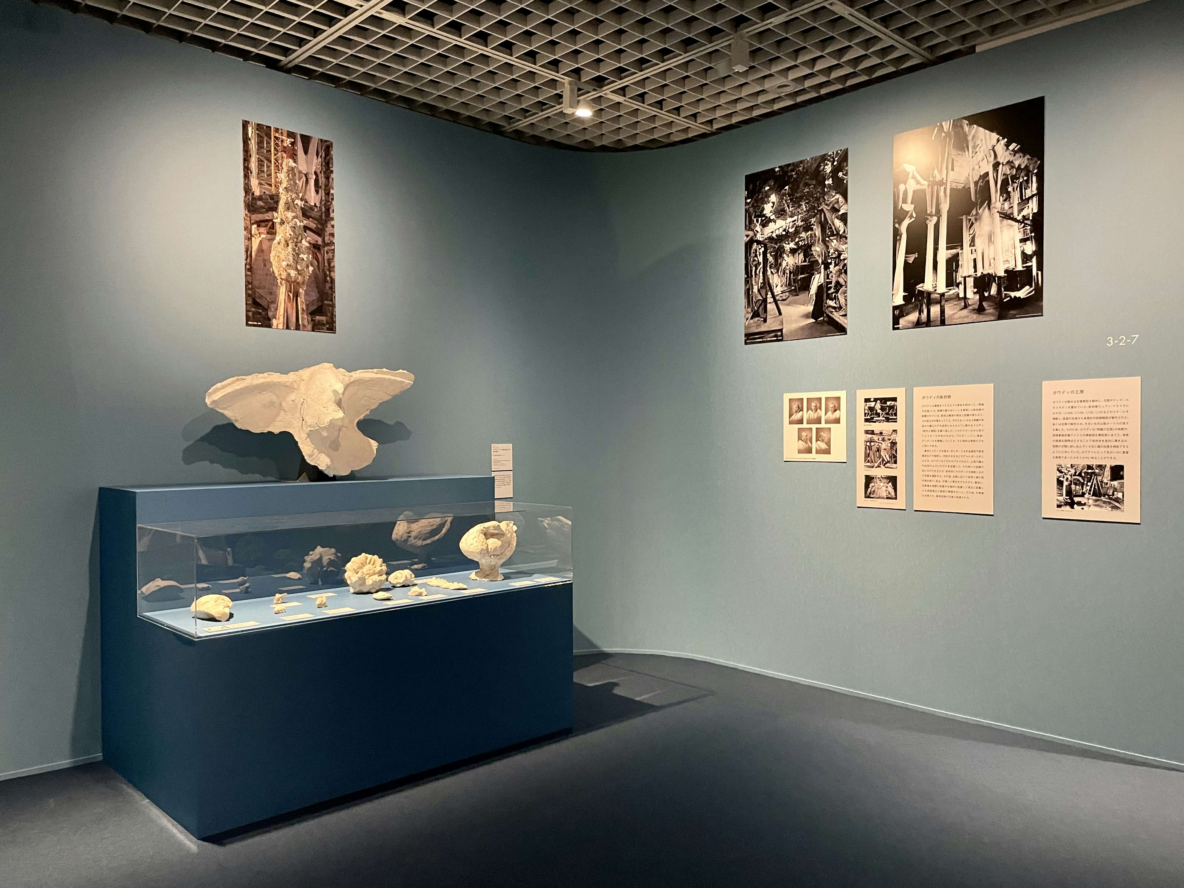 第3章の展示風景より、中央は《サグラダ・ファミリア聖堂、身廊部模型》(2001-02、制作=サグラダ・ファミリア聖堂模型室、西武文理大学)
