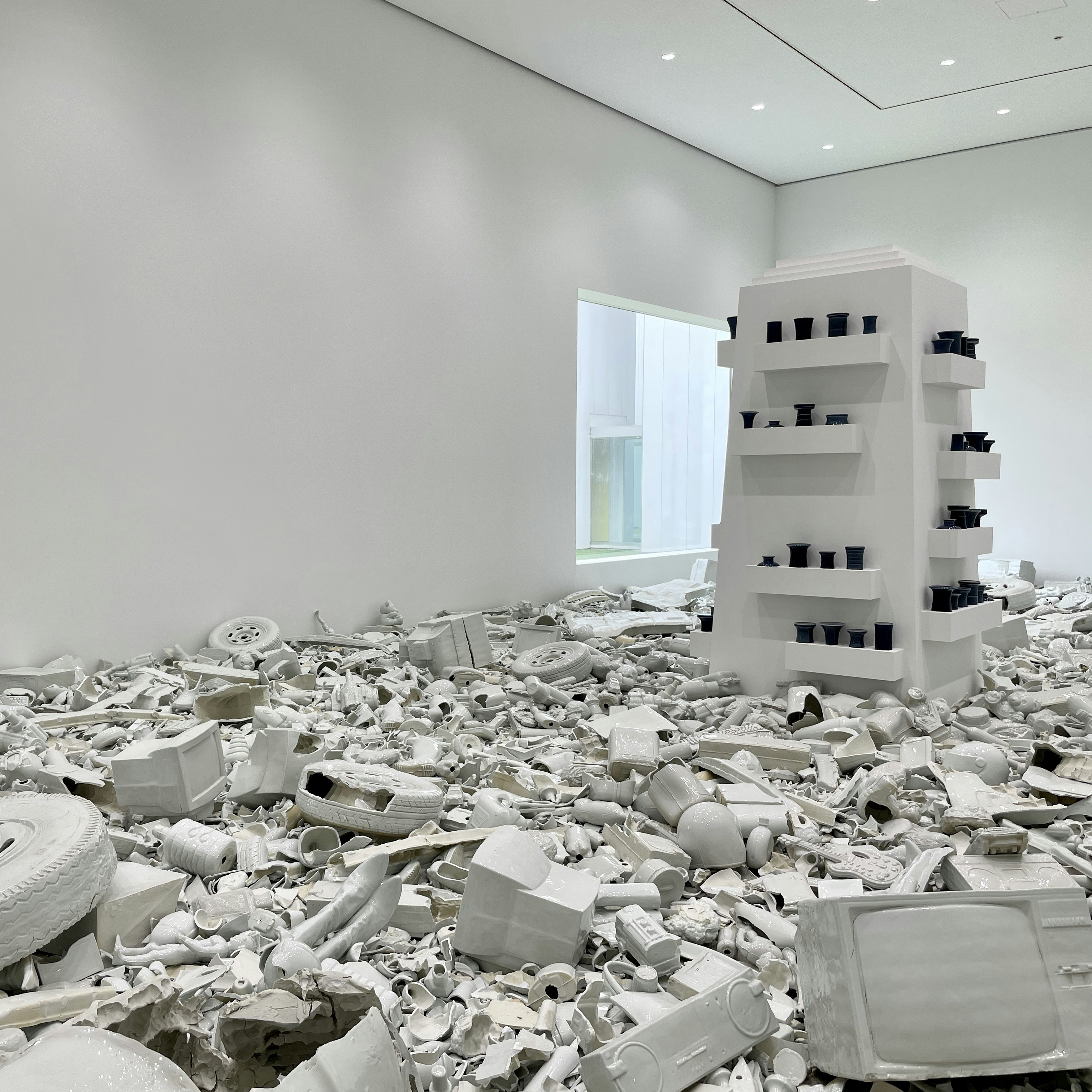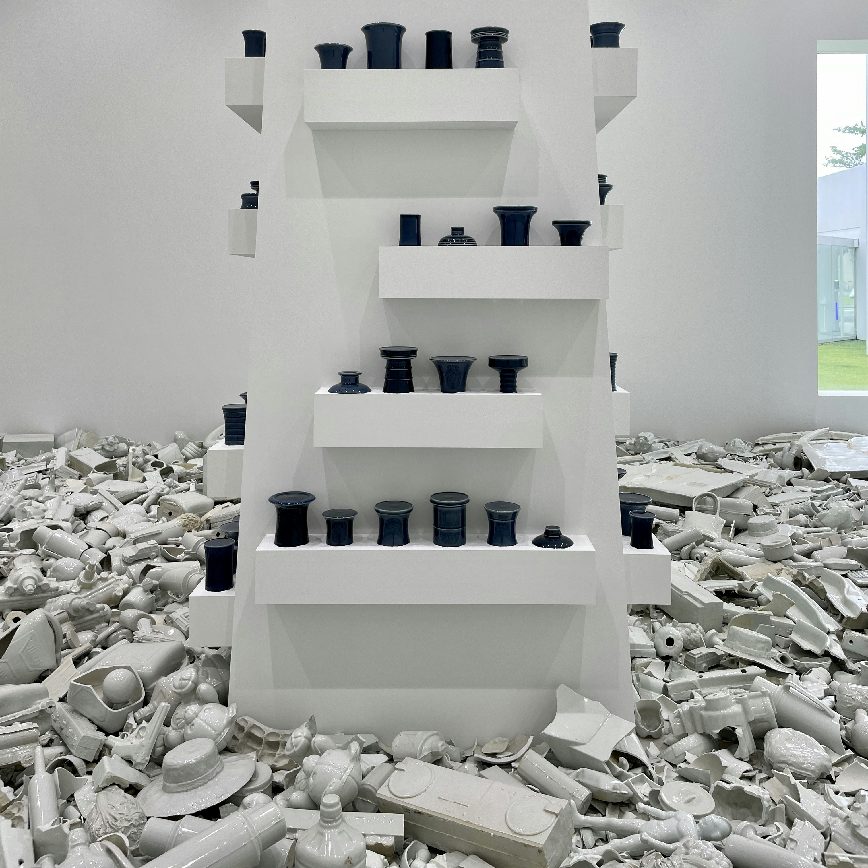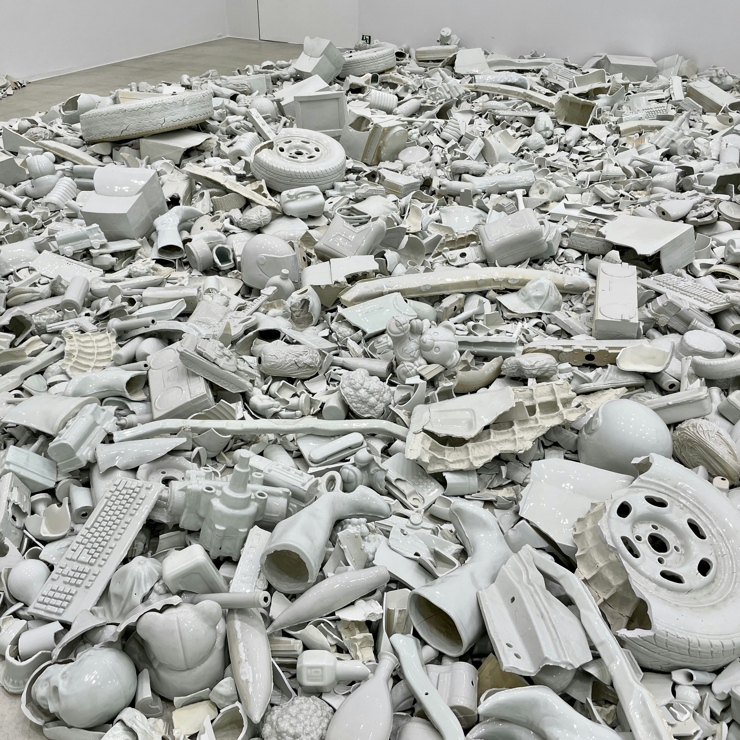 最初の展示室では、本展の中核をなす作品にも言える《遺棄》(2001-15)と、昨年上海復星芸術センターでの個展に際して発表された新作《塔器》(2021-22)が大きな存在感を放つ。床一面を埋め尽くす《遺棄》は、テレビや靴、ペットボトル、タイヤなど様々な日用品をかたどった磁器が打ち棄てられ散らばっている。表面は硬いが、じつは壊れやすい磁器の脆さが日常生活の儚さを示し、現代社会の廃墟のようにも見える作品だ。