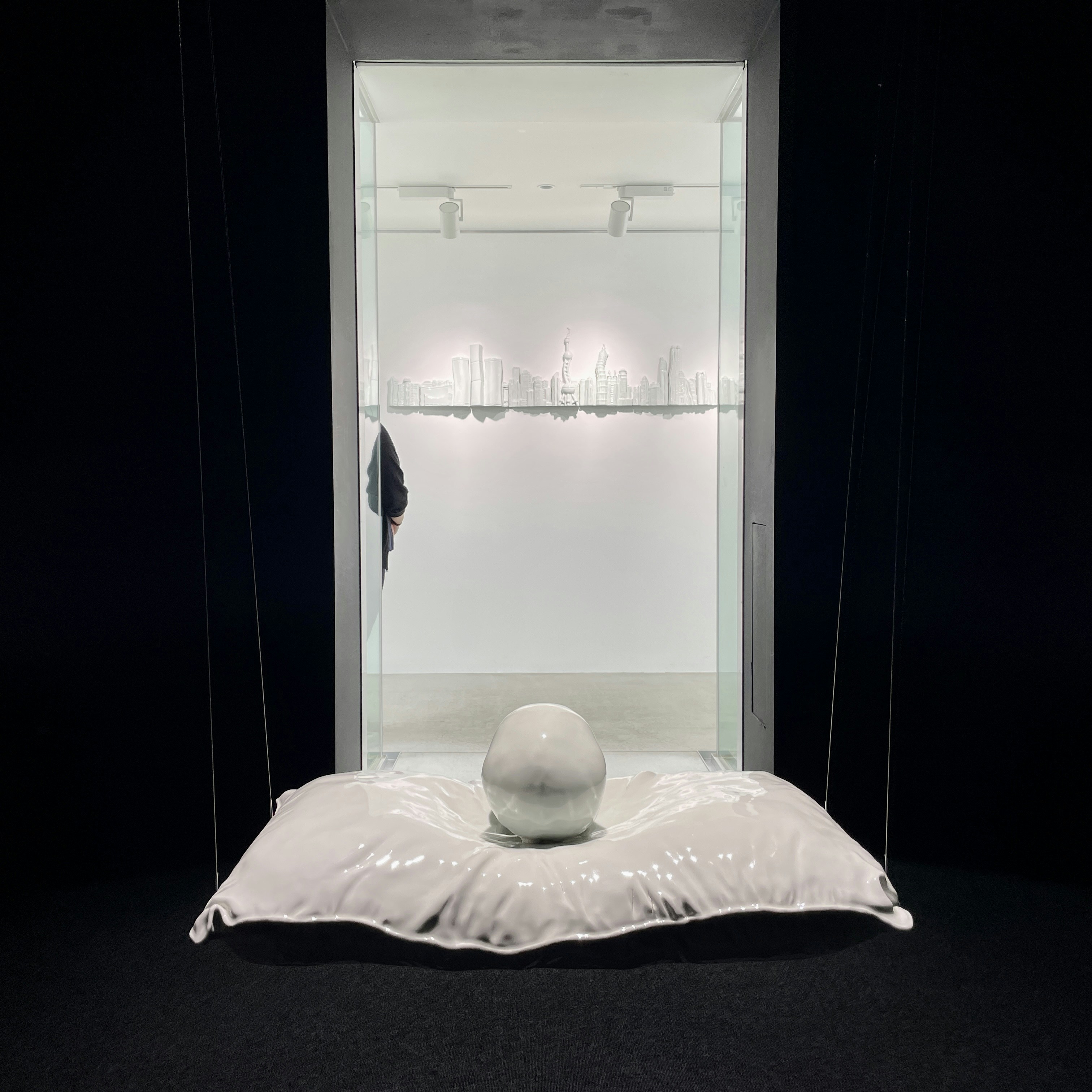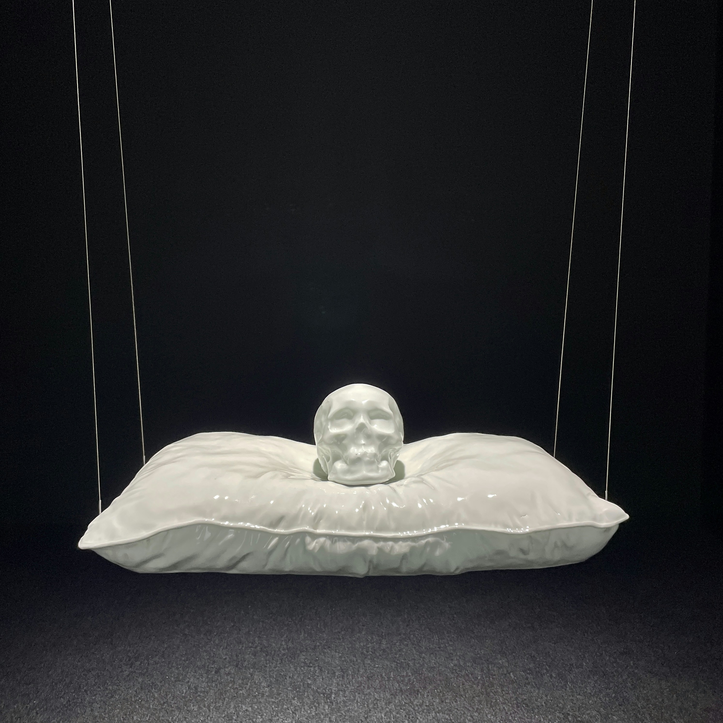 隣の展示室で展示されている《儚い日常》(2001-03)は、磁器でつくられた枕が暗い空間に浮遊するような作品。枕のうえに骸骨の頭部が置かれており、死や人間の脆弱を思わせる。また、この作品を後ろから見ると、骸骨が《水中投影》の建物群を注視するように見え、現代社会の問題について考えることを促すという意図も込められている。