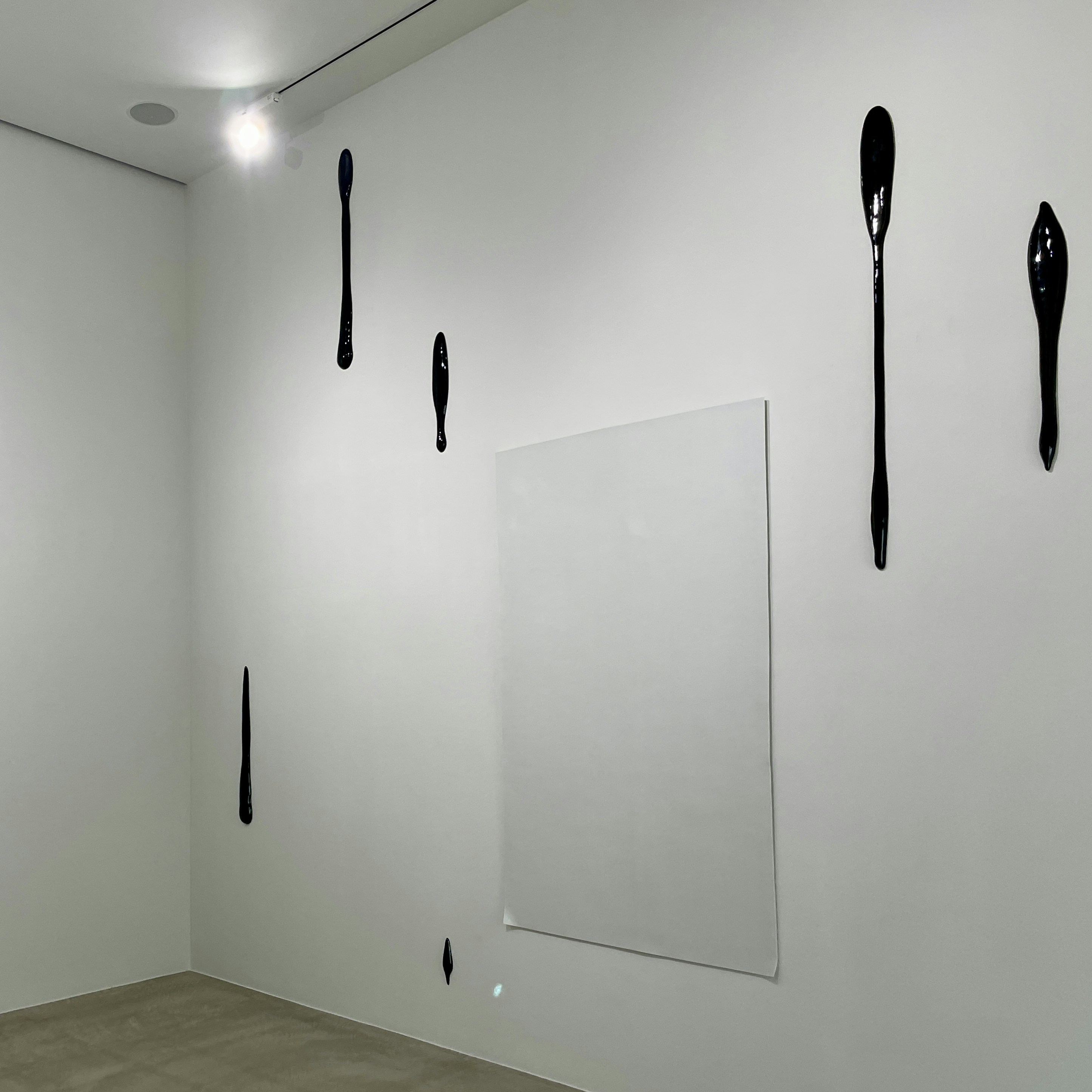最後の展示室は、「白紙」と「墨汁」の作品によって構成されている。壁に墨汁が天井から流れ落ちてくるよう見える《兆候》(2011)は、雨が壁につたった痕跡を意味する「屋漏痕」という唐の時代から続く用筆法を参照したもの。つくり手の様々な情緒が込められた個々の「墨汁」を拡張させて展示することで、白い紙を彷彿とさせる展示室の壁に何かしらを書くようにとらえることもできる。
