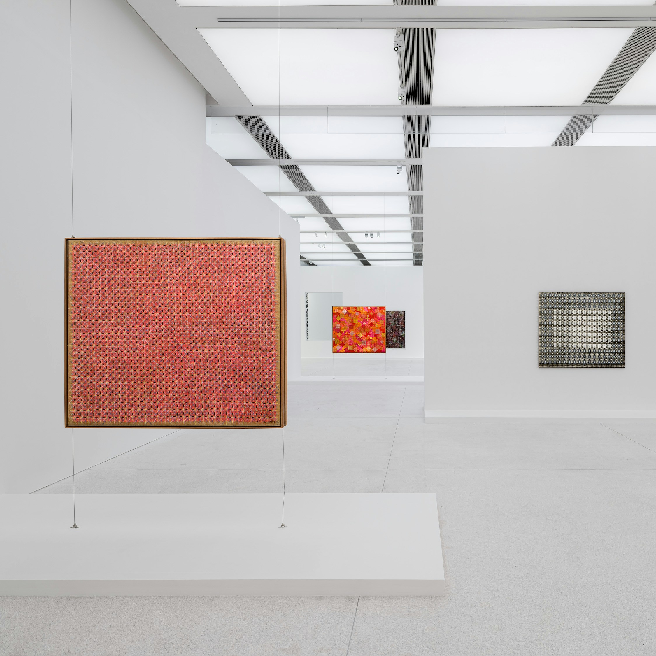 ひとつは、四角のグリッド上にクロスを組み合わせたパターンを機械的な手書きで繰り返し、層状の構成を重ねる方法により全面一様な空間がつくり上げられるが、「それをじっと見ていると、微妙なバイブレーションや違い、あるいは均質ではない独特の揺らぎの感覚を画面全体にはらませ、様々なコノテーションや感情的な内容を観る者のなかで浮かび上がらせる」ということ。
