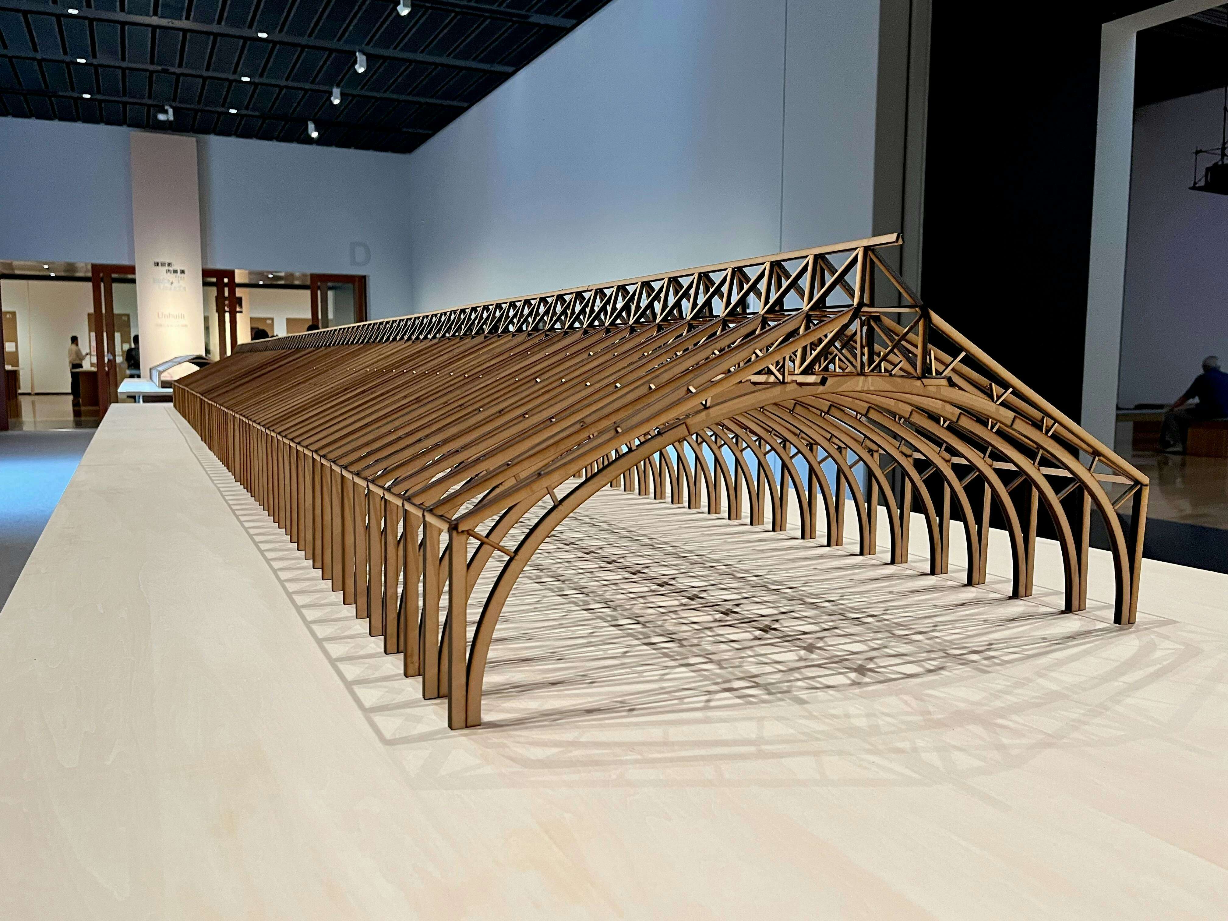 展示風景より、《海の博物館 展示棟 架構反復模型》 1/30サイズ ※実際の約5倍の長さ(150メートル)に拡張したインスタレーション