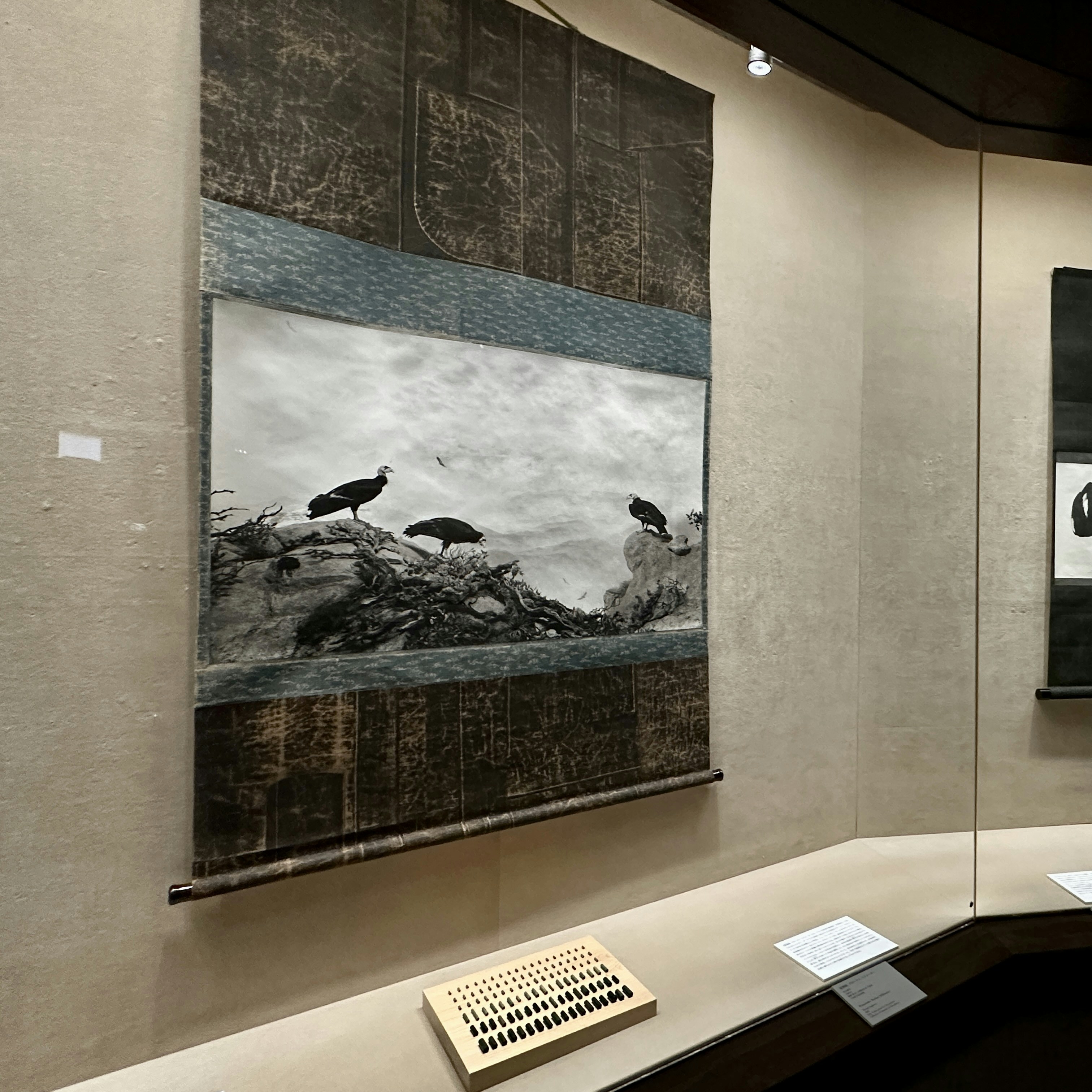本展ではこうした作品に加え、中国南宋~元時代の画家・牧谿の水墨画技法を本歌とした《カリフォルニア・コンドル》や、数式を本歌とする「数理模型」シリーズの最新作《数理模型 025 クエン曲面:負の定曲率曲面》などが、杉本の本歌取りの代表的作品として並ぶ。