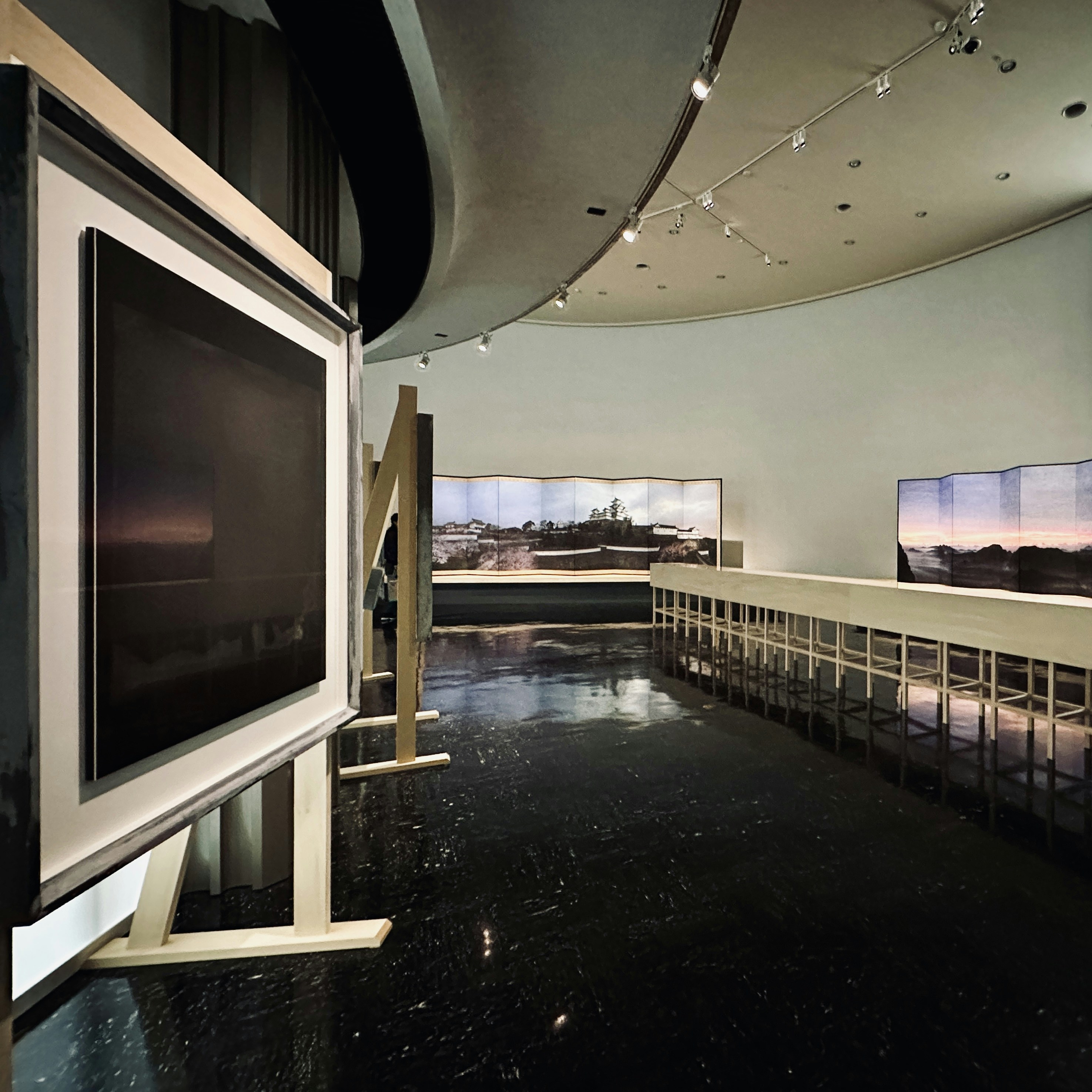 同作の両脇にも屏風作品が並ぶ。向かって左の《狩野永徳筆 安土城図屏風 想像屏風風姫路城図》は、22年の姫路展の際に制作されたもの。狩野永徳が描いた《安土城図屏風》を思い、安土城を想像しながら姫路城を撮影したという構造を持つ。その反対側には、「杉本博司ー春日神霊の御生(みあれ) 御蓋山そして江之浦」(春日大社、2022)で初披露された《春日大社藤棚図屏風》を見ることができる。