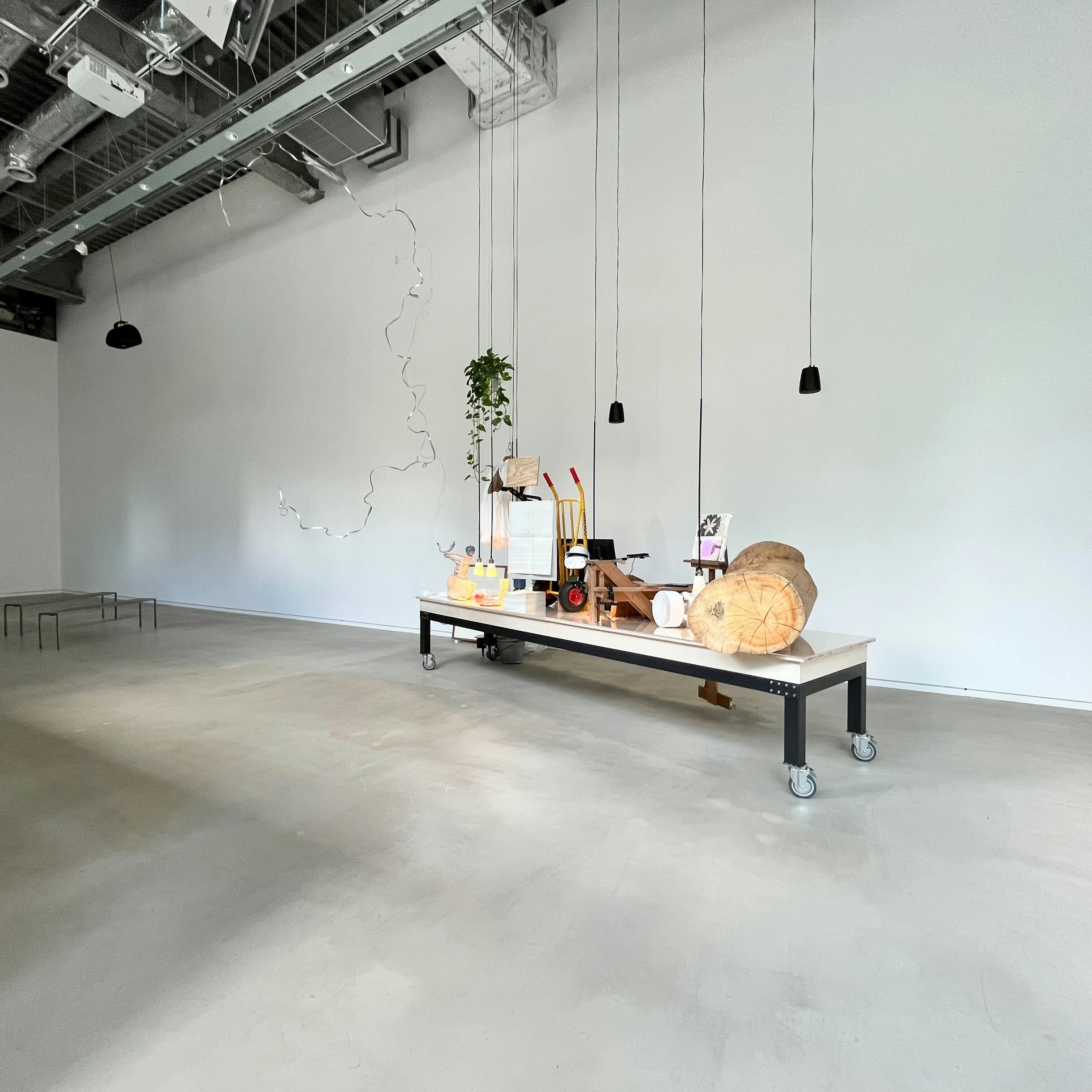 会場では、2001年頃の作品から最新作までがインスタレーションという形式で展示されている。テーブルに再構成されるのは、活動初期から制作されているりんごの彫刻作品シリーズ「apple」をはじめ、Reborn-Art Festival 2021-22で発表された《石巻13分》の記録映像、2014年より開始されたプロジェクト「1300年持ち歩かれた、なんでもない石」などだ。