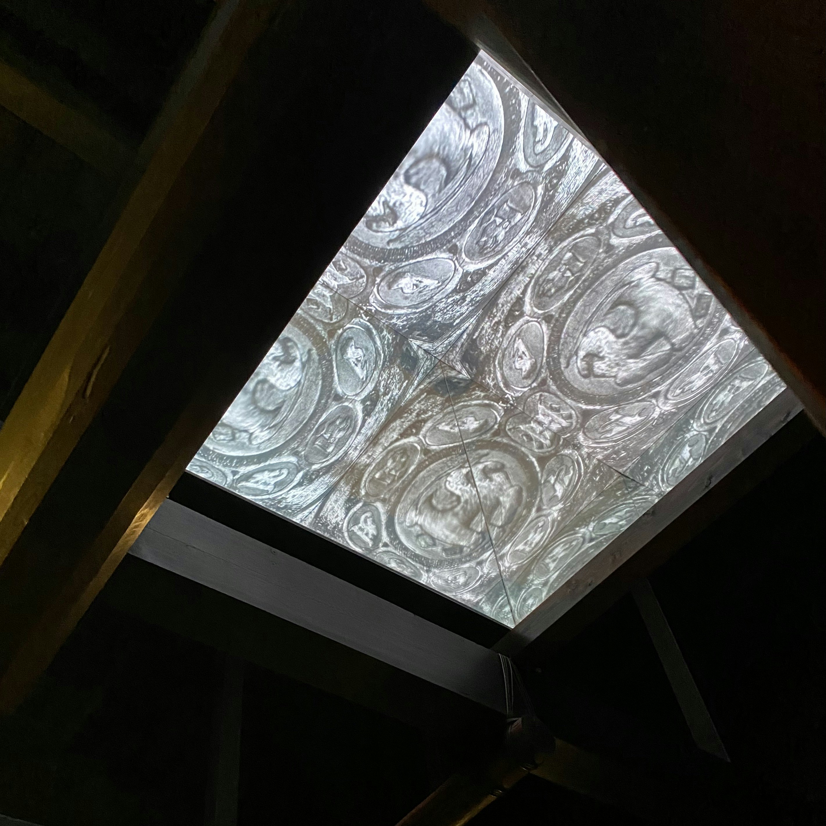 この映像の元となった静止画は、「撮像曼荼羅考」シリーズとして、邸内各室の床の間に掛けられている。京都・醍醐寺収蔵の曼荼羅を、落合が高解像度デジタル撮影し、手ずから古典技法のプラチナプリントで再現した作品だ。
