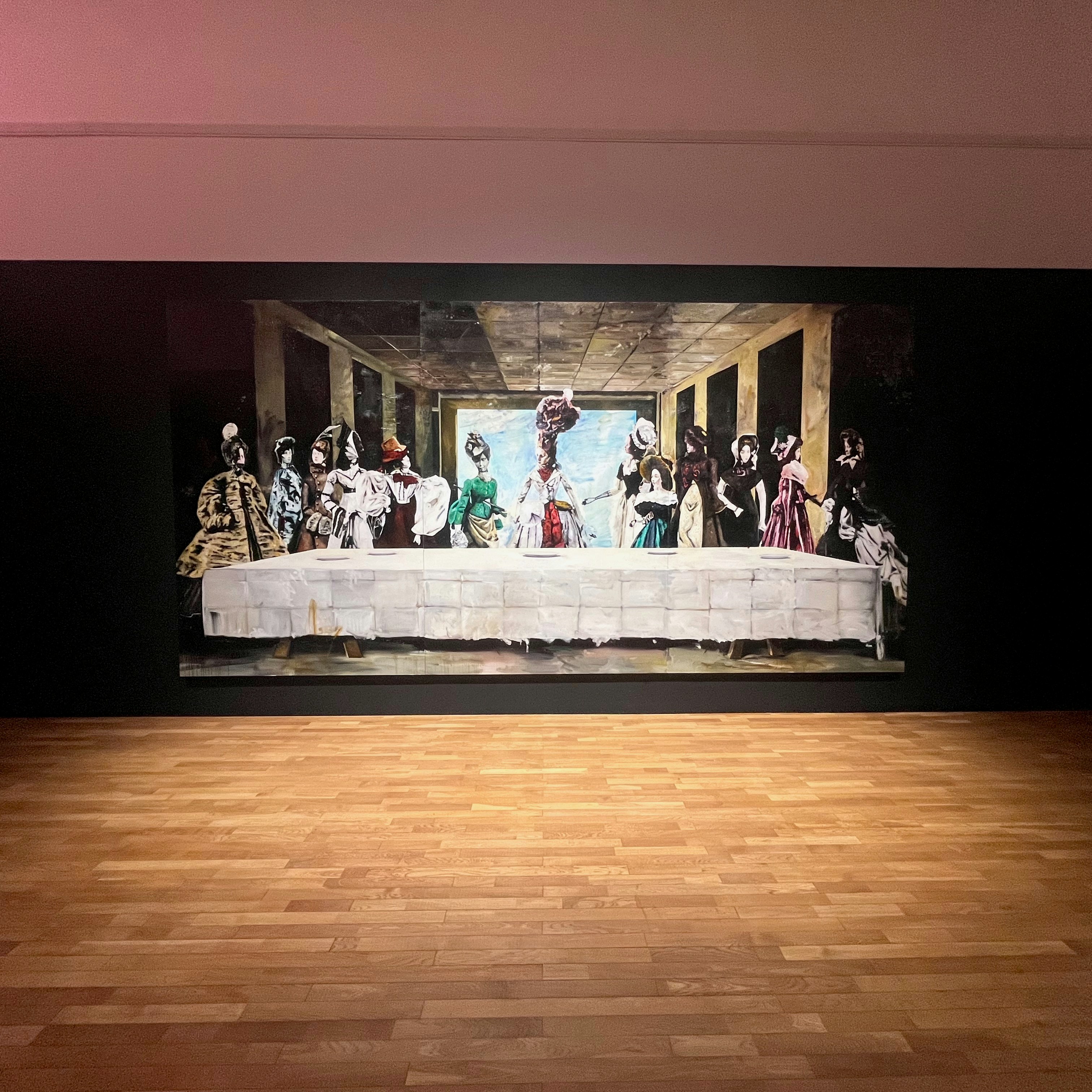 最後となるRoom7は、大作《Last Supper》(2023)が1点、展示室に鎮座している。過去に多くの作家がモチーフとして選んできたレオナルド・ダ・ヴィンチの《最後の晩餐》に、井田もまたいまを生きる現代の作家として向き合った。人々がスマートフォンのイメージをつねに目にし、AIによって自動生成された絵画が次々に生まれる現代という時代を、アイロニカルな食卓として表現。かつてダ・ヴィンチは空気遠近法という技術によって絵画を革新したとされるが、現代の技術は絵画をどのように革新していくのか。そんな問いも本作には込められている。