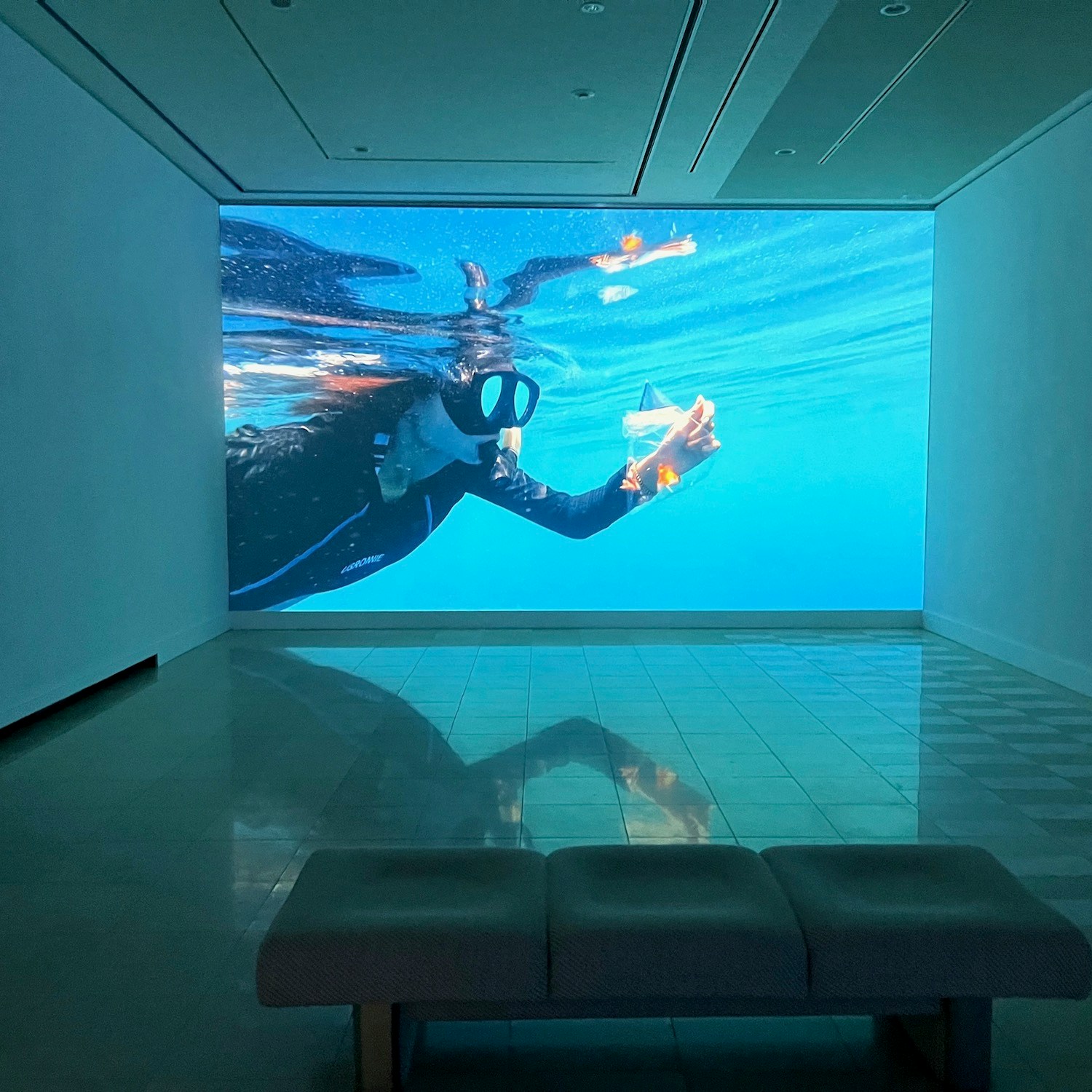 《海の中に祈りを溶かす》は(2022-2023)は、ホンマが海中に沈みながら祈りの言葉を唱える映像作品。水中では祈りの言葉を口にしても聞こえることはないが、その声は泡となって水面へと上昇していく。富山の立山信仰をはじめ、世界中の人々が古くから色々なところで祈ってきたことにも思いを馳せた本作は、縦長の大型ディスプレイ会場内に海をつくりだすようだ。