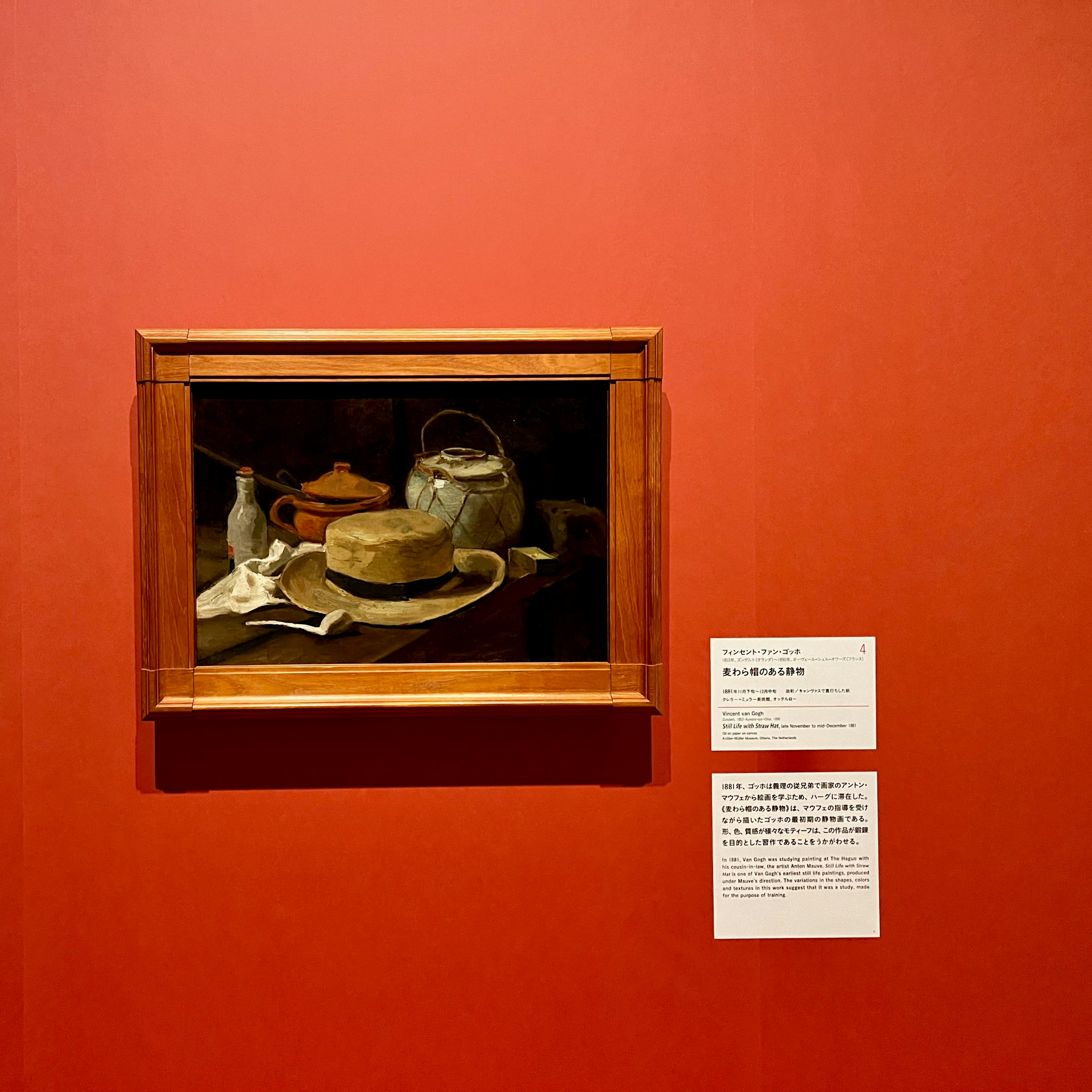 第1章となる「伝統/17世紀オランダから19世紀」でまず紹介されるのが、ゴッホがオランダ・ハーグで従兄弟の画家、アントン・マウフェに絵画を学んでいた頃の作品、《麦わら帽のある静物》(1881)だ。かたちや色、質感などが異なるモチーフを描くことで、ゴッホが鍛錬を重ねていたことがうかがえる。