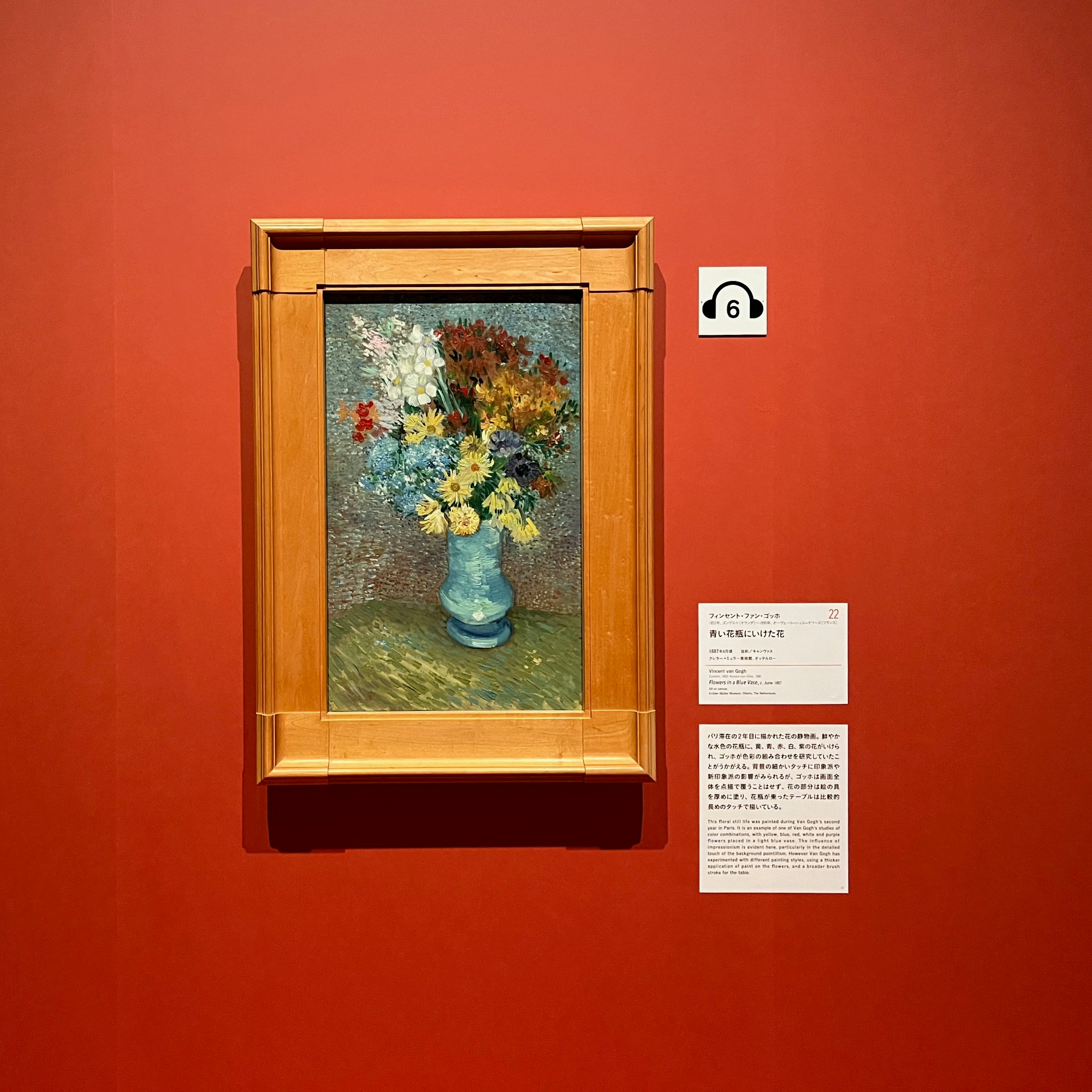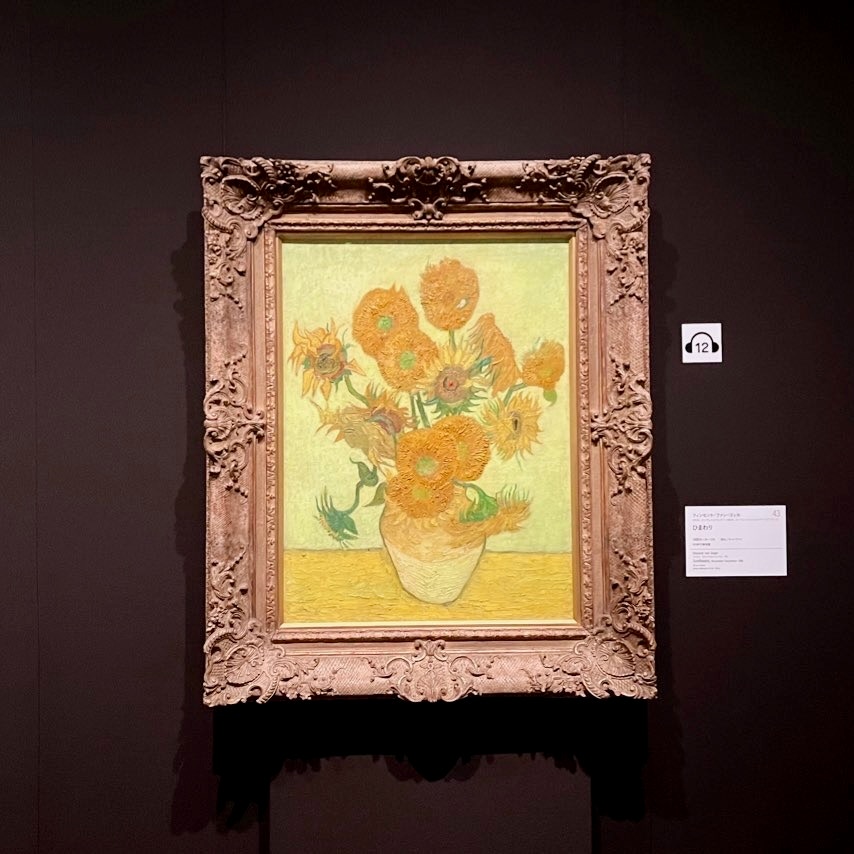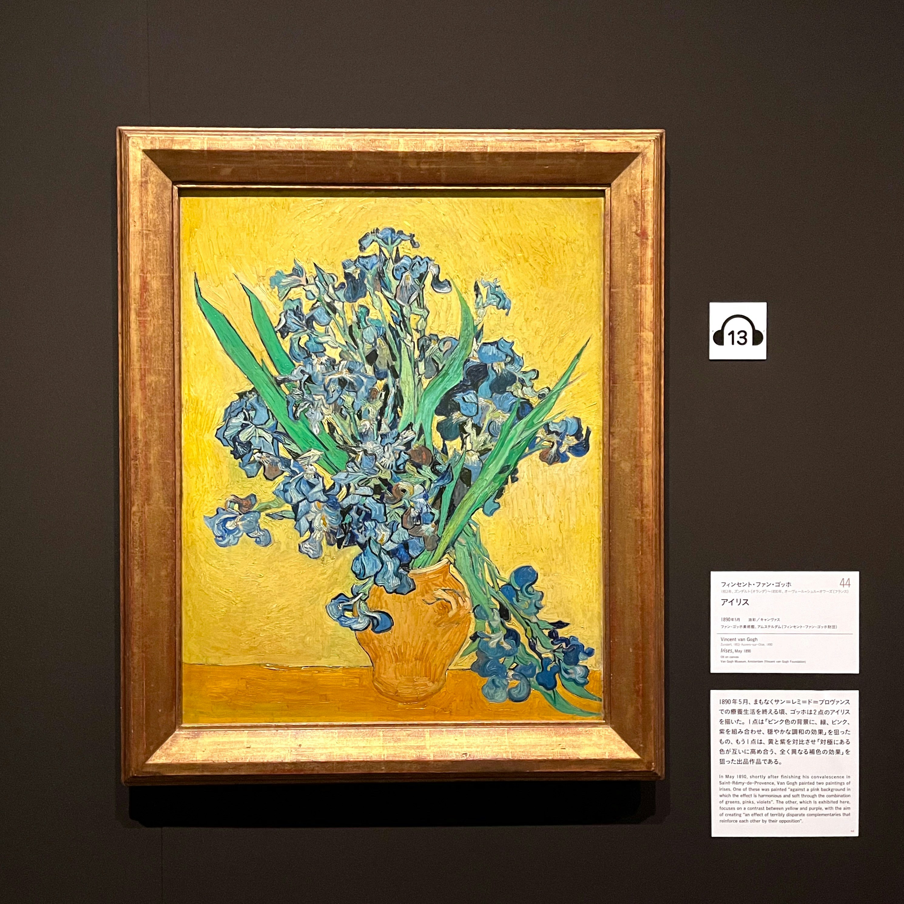 《アイリス》は背景の黄色と花弁の紫(青に見えるが近年の研究で描かれた当時は紫であった可能性が指摘されている)を対比させる色彩の試みだったと言えるが、注目したいのはその構図だ。画面右に垂れた花を配置しているのは、隣に展示されている《ひまわり》と共通しており、この2作にゴッホの共通した試みがあったことがうかがえる。この2作の並びを堪能できる貴重な機会だ。