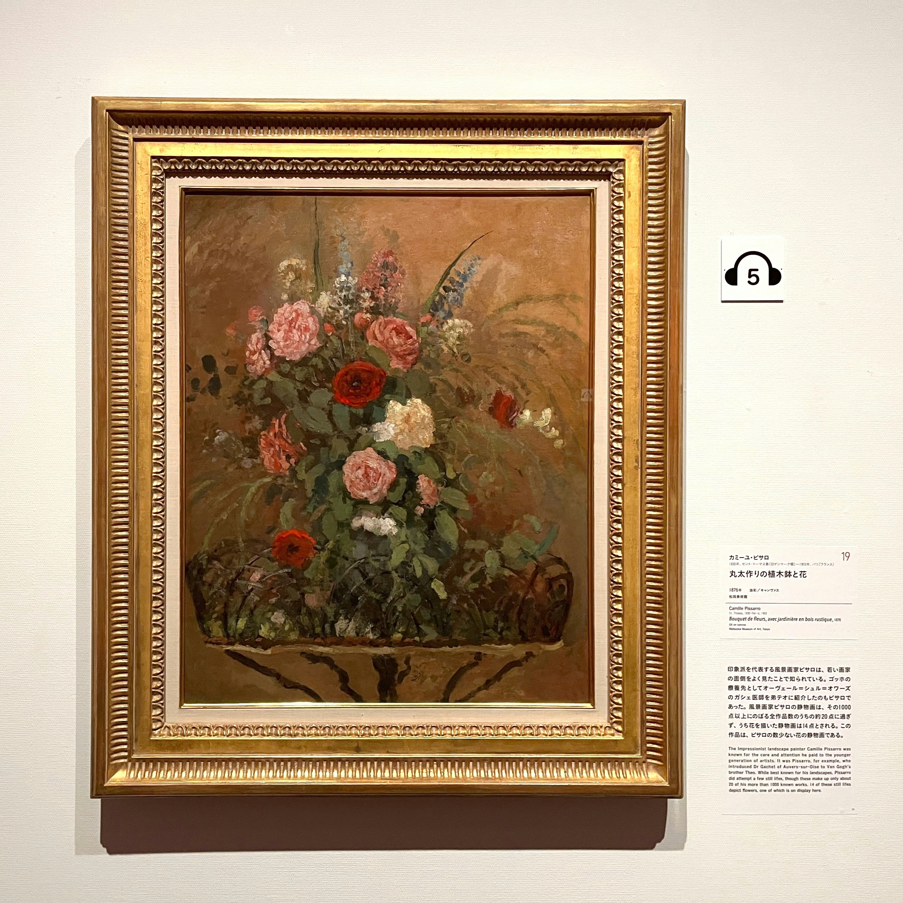 1886〜87年においてゴッホは、花の絵を重点的に描く。《青い花瓶にいけた花》(1887)は、捕色を意識した点描の背景から印象派や新印象派の影響が見て取れる。カミーユ・ピサロやピエール=オーギュスト・ルノワールの花をモチーフとした静物画も展示されているので、ぜひ会場で見比べてもらいたい。