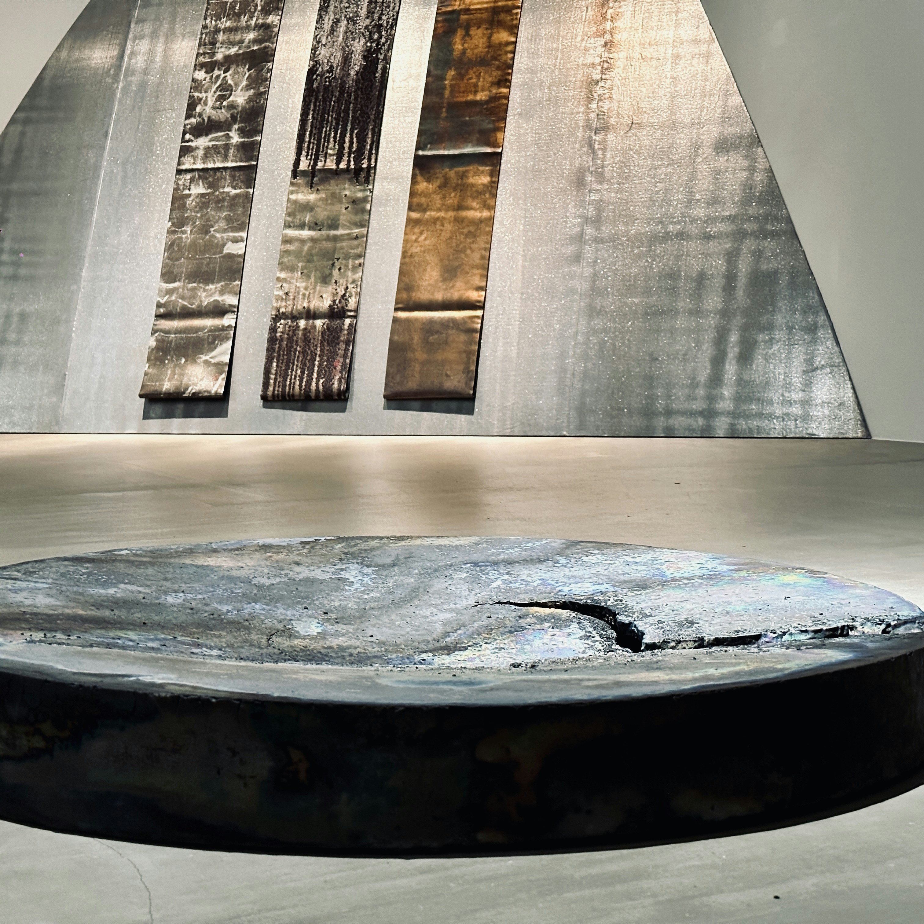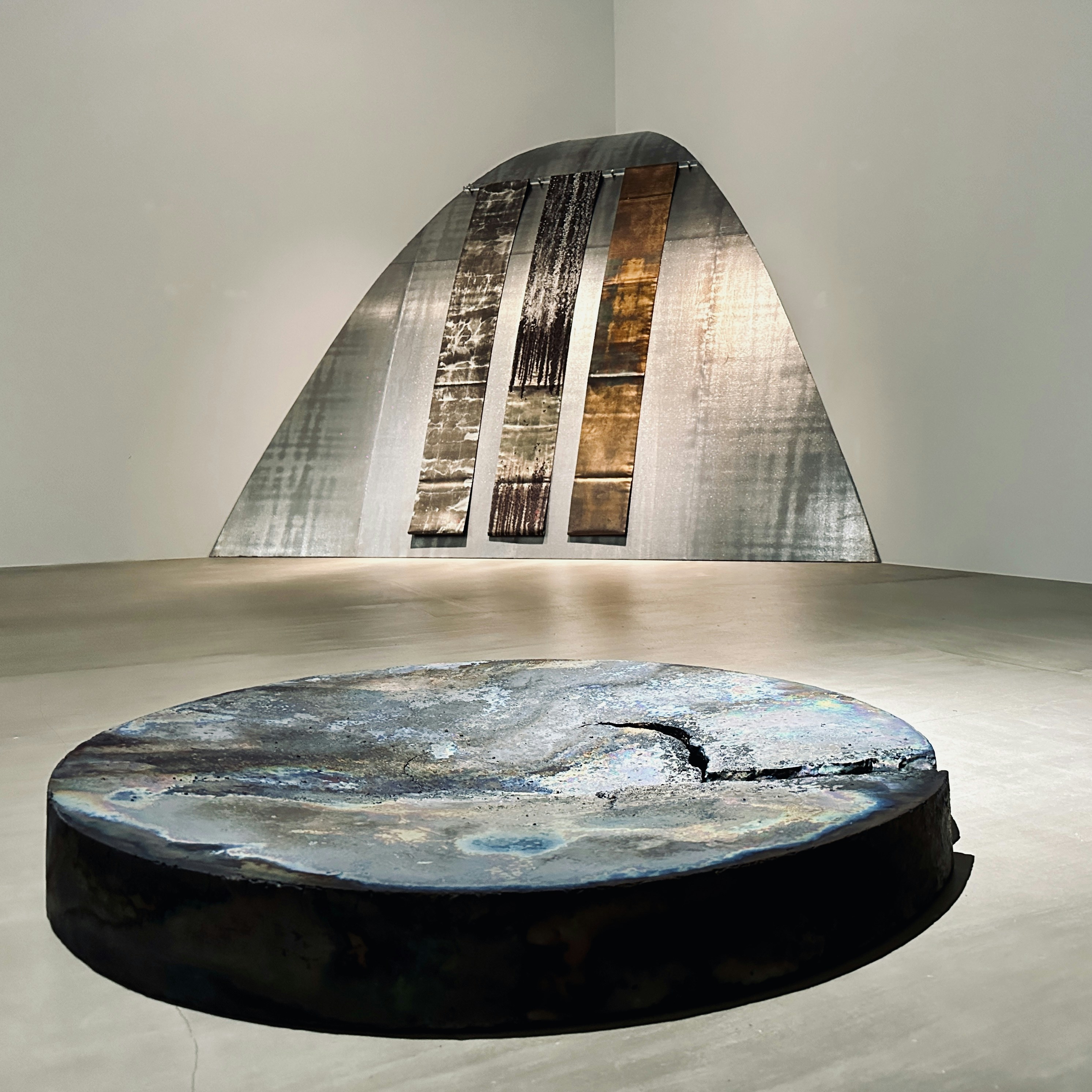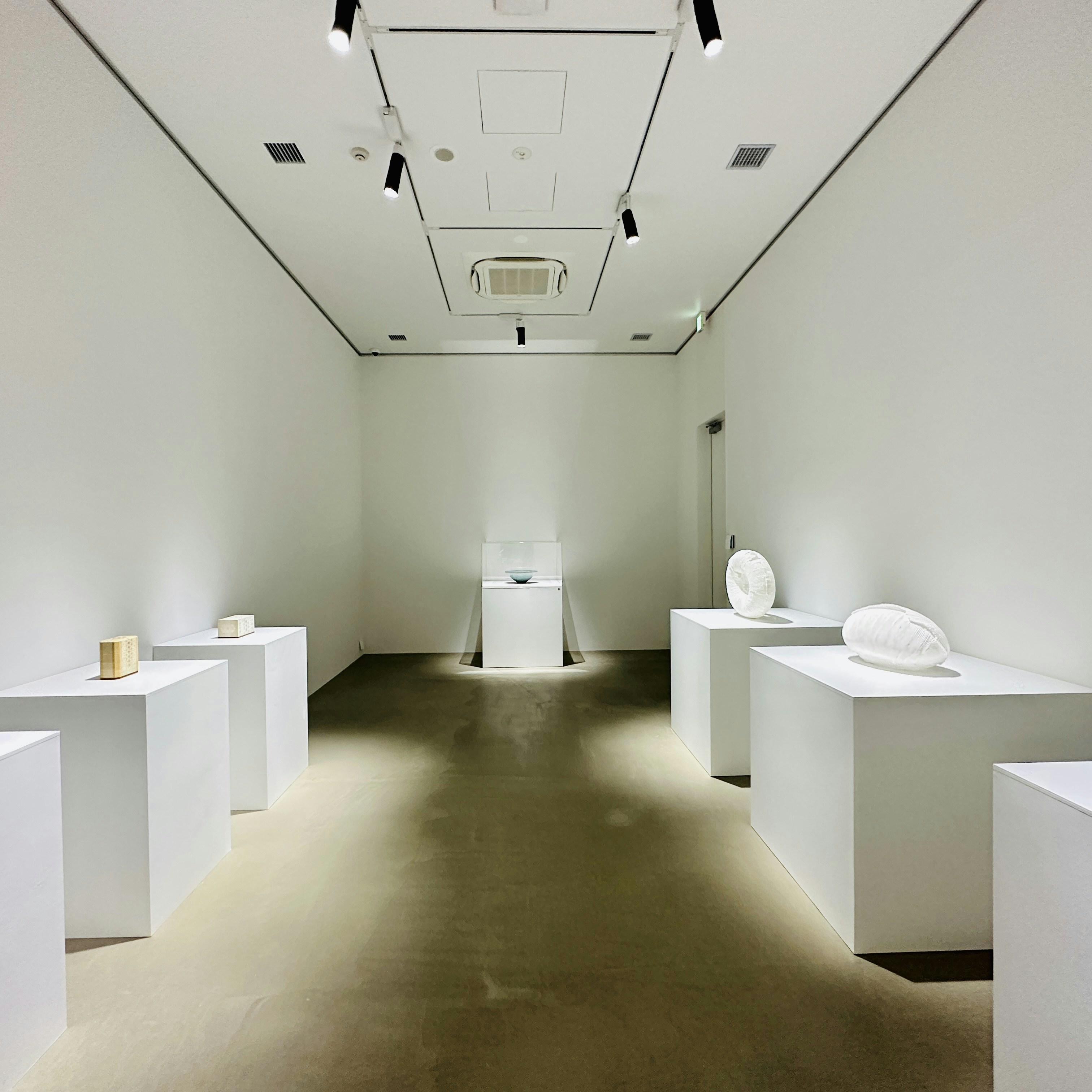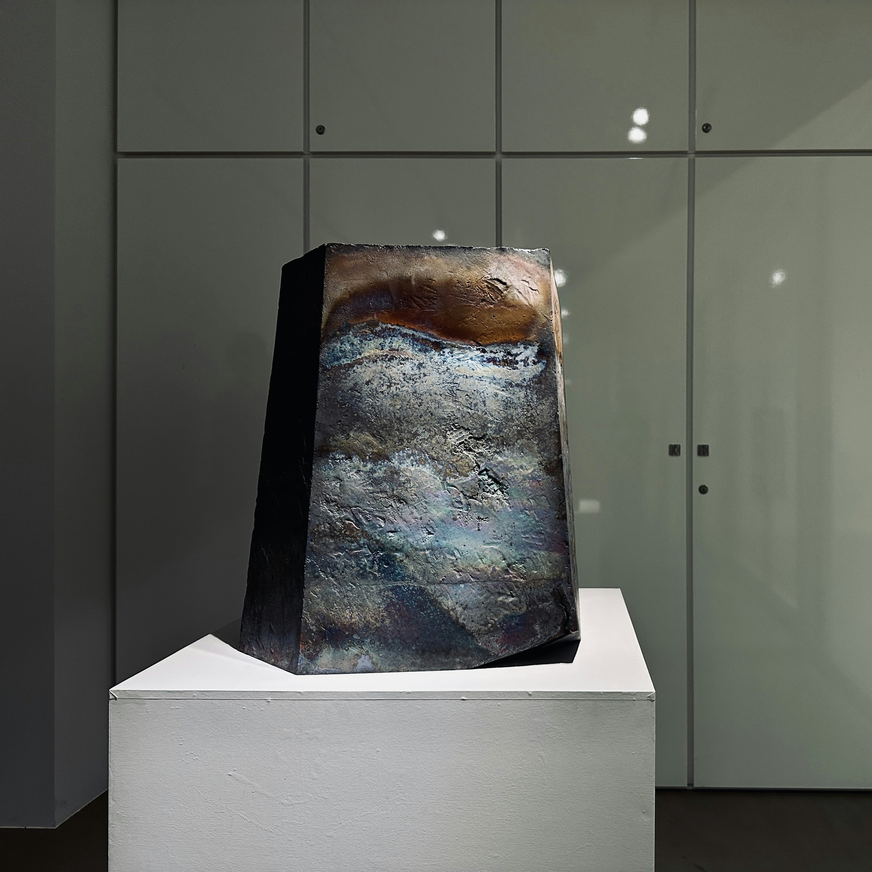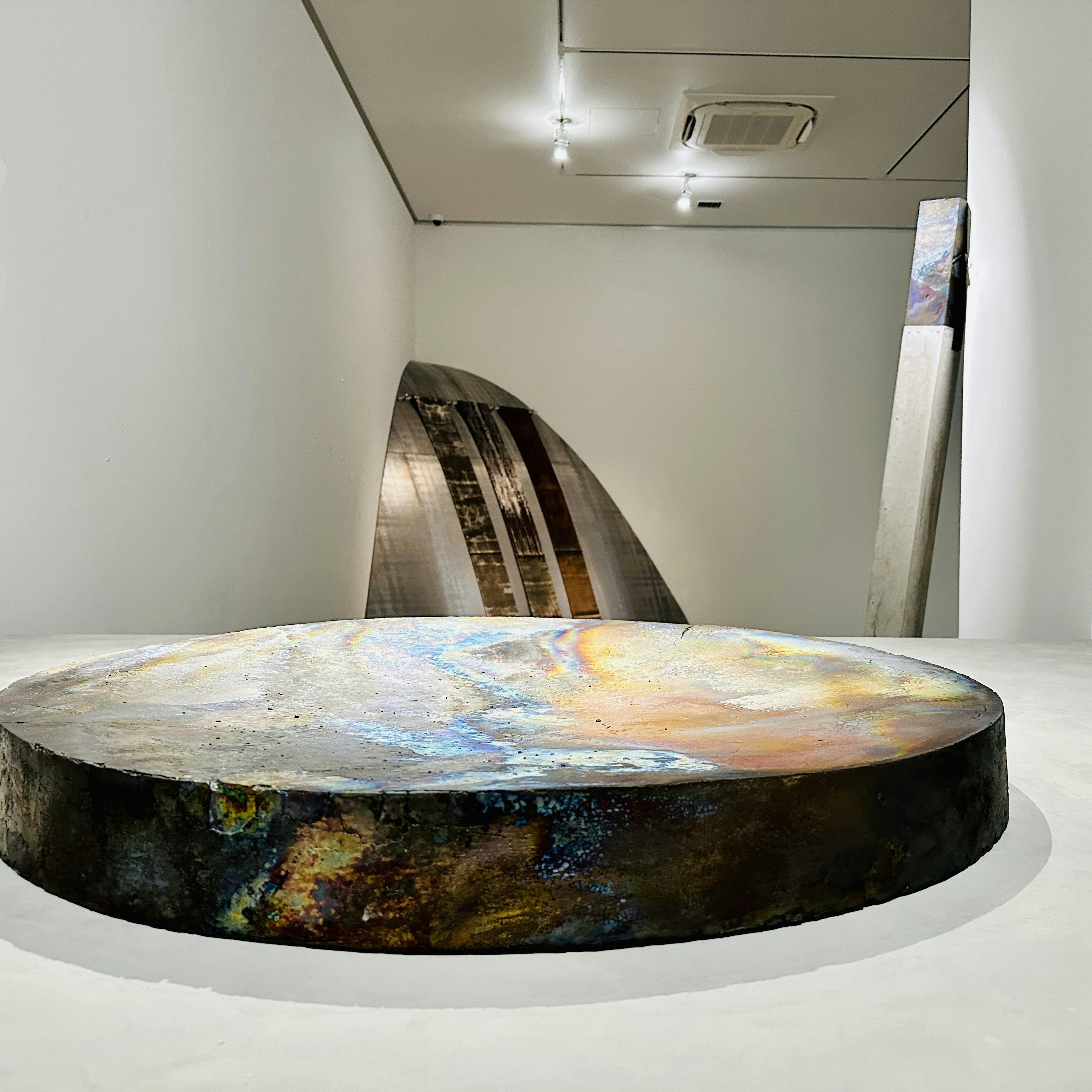 また橋本知成は今年、和歌山県立近代美術館で開催された個展「なつやすみの美術館 13 feat. 橋本知成」でも大きな注目を集めた作家だ。陶土を素材に使用しながらも、表面に金属や鉱物のような光を湛えた橋本の作品群。水面に揺蕩う光のように床置きされた作品は、本展コンセプトを象徴するかのようだ。