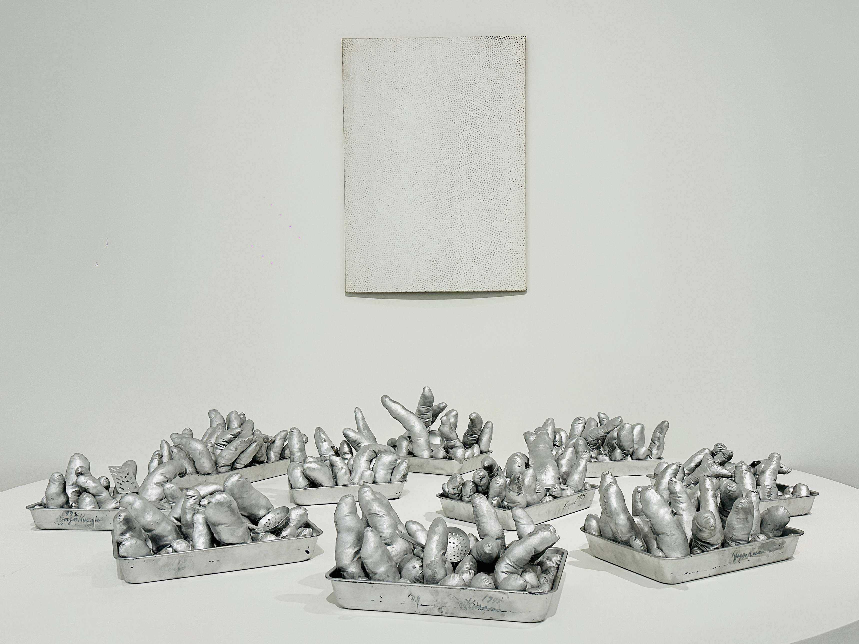 展示風景より、手前から《希死》(1975-76)、《無限の網(1)》(1958) © YAYOI KUSAMA