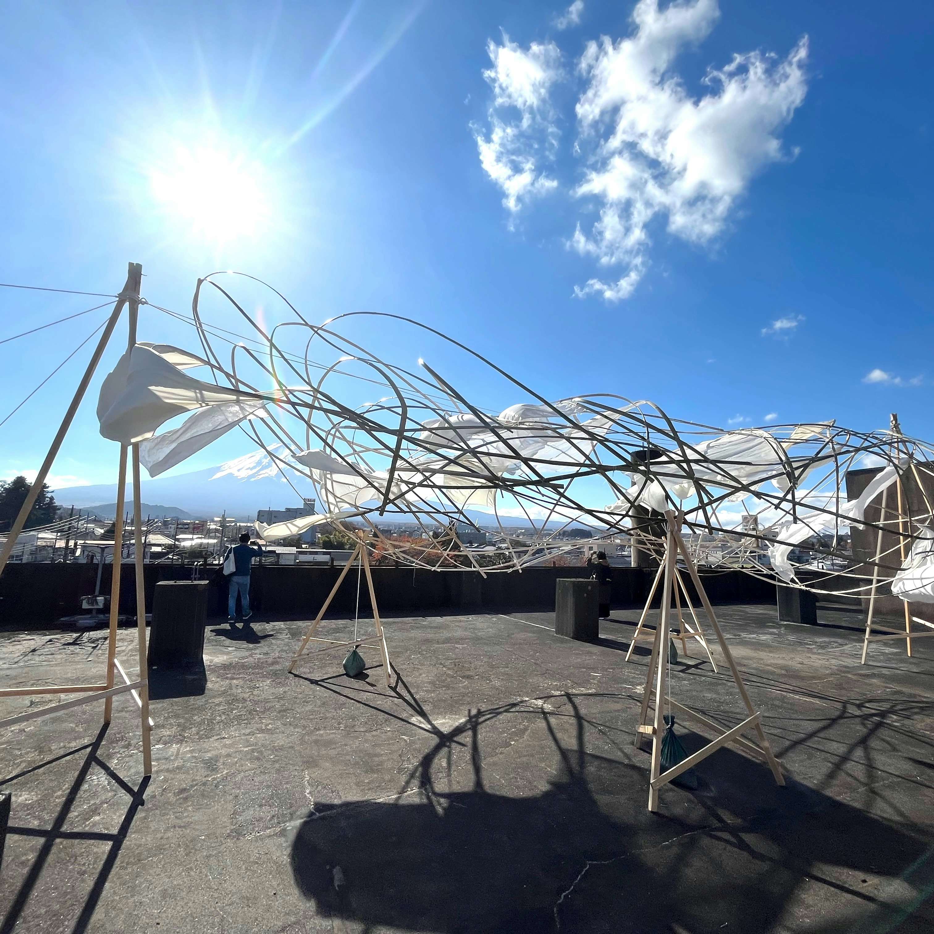 香港を拠点とするジャファ・ラムは、リサーチで観光客が富士山の写真を撮っている姿を見て、地元の産業や人々に目が向けられていないと感じたそうだ。富士山は信仰の対象だが、この雲を想起させる作品で富士山を隠してみることで、この土地の産業や職人に目を向けてほしいという思いを作品 《あなたの山を探して》に込めた。
