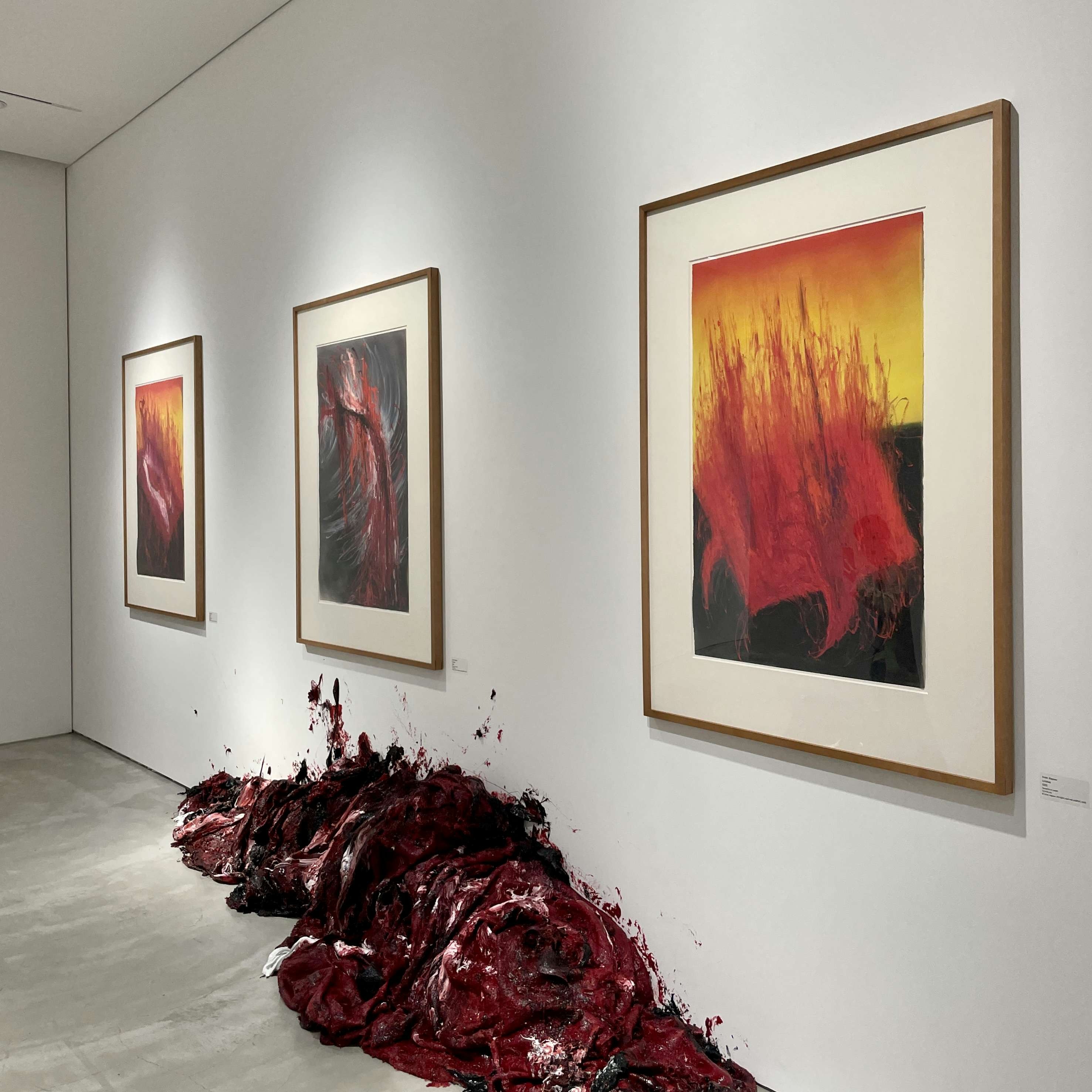 展覧会では、カオティックな状態を表す、赤い色の顔料を大量に使用した2021〜22年の絵画作品と、カプーアが来日したスタッフに遠隔指示して制作した巨大な立体作品が展示されている。
