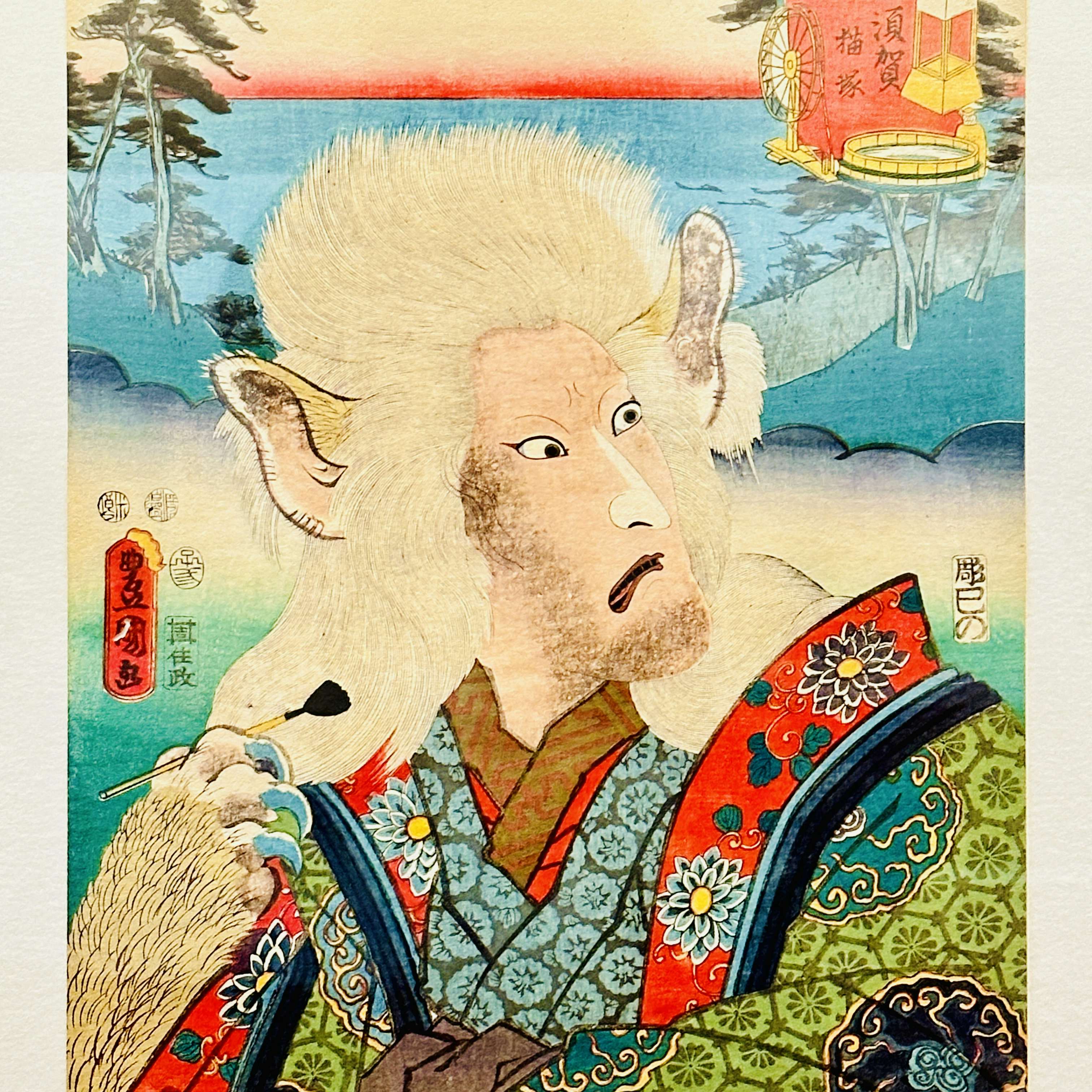 本展では浮世絵版画の「線」も主役だ。木板を彫るなかで、線を彫る技術があってこそ浮世絵版画の美しさは際立つ。なかでも技量が試されるのが、「毛割(けわり)」という髪の毛の生え際の部分だ。例えば歌川国貞(三代豊国)《東海道五十三次之内 白須賀 猫塚》は1ミリ幅のなかに3本程度の髪の毛(それも長い髪の毛)が彫られており、非常に高い技術が見て取れる。ぜひ会場で目を凝らしてほしい。執拗なまでにこだわり抜いて彫られた毛割からは、当時の美意識が伺える。