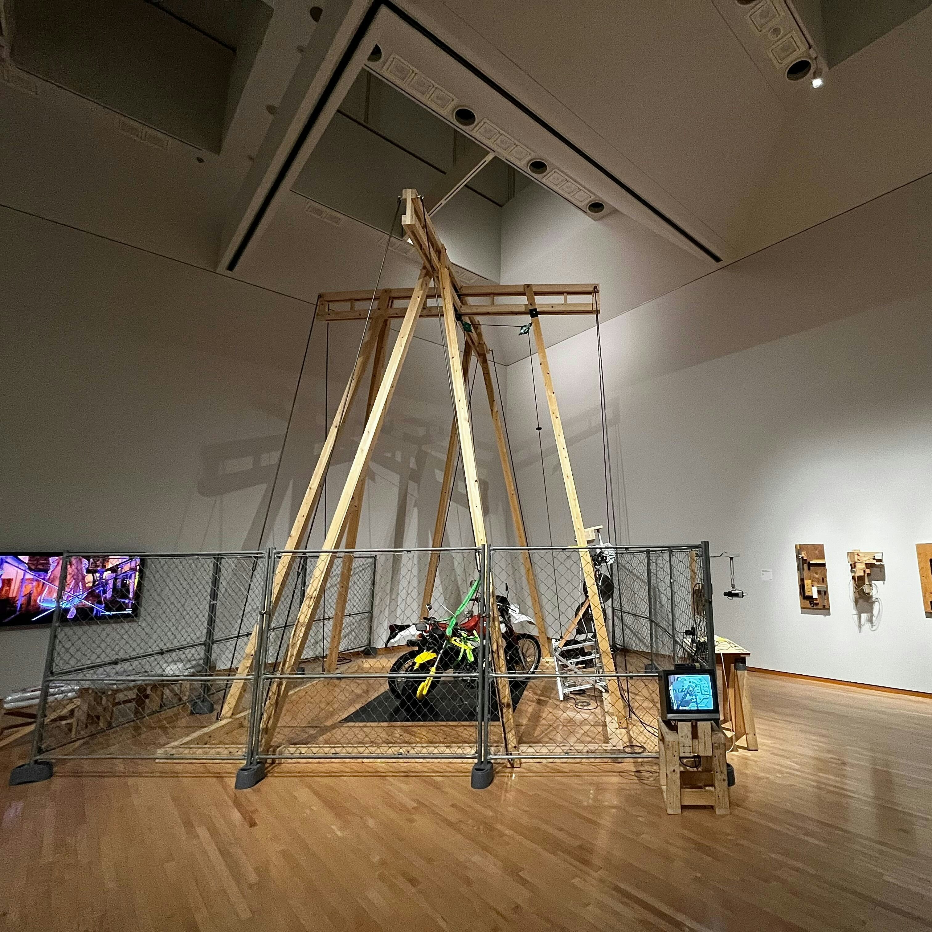 やんツーは個人の作品も発表している。会場には「発電」をテーマとした大型重力発電装置のインスタレーションが展示されており、ボタンを押すことでバイクが持ち上がり、鑑賞者の目の前で発電が行われるというものだ。屋外に設置されたソーラーパネルと合わせて発生した電力で、周囲に展示されている作品を動かしており、美術館のなかで自給自足での展示を実現している。発電された電力でスマートフォンを充電できるなど、お裾分けもしてもらえるのも嬉しいポイントだ。