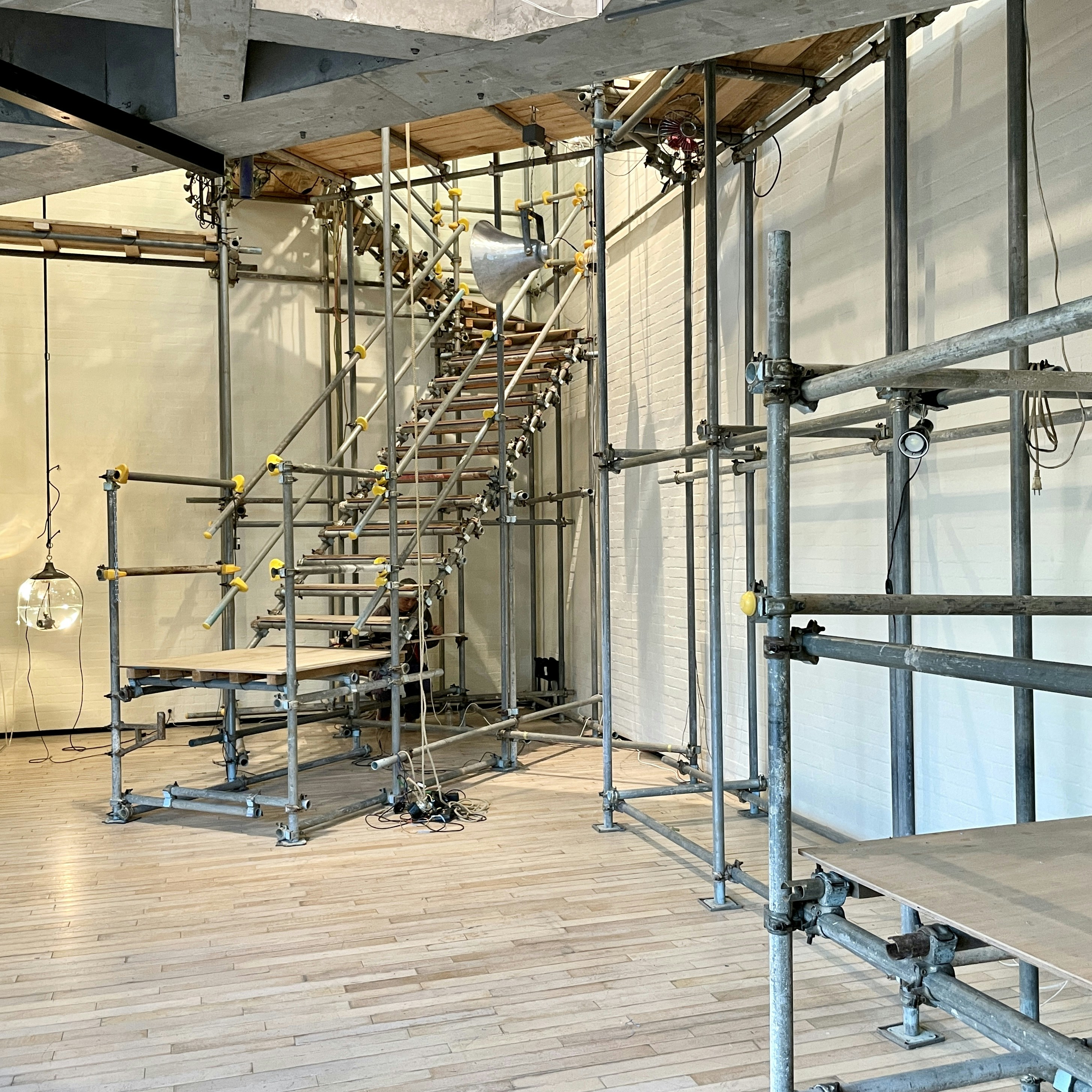 3階に着くと、展示室のガラスを通して2階展示室の吹き抜け空間に工事現場で使われる足場が組まれているのが見える。88年に設置された同館の建築計画を知らせる標識を持つキャストによるパフォーマンスを見たのち、鑑賞者は展示室の横のドアから足場へと誘われる。足場でつくられた“道”を通り抜けると、2階の展示室に到着。道の突き当たりには埠頭のようなスペースがあり、「船」と呼ばれる四角い足場による空間へとつながっている。