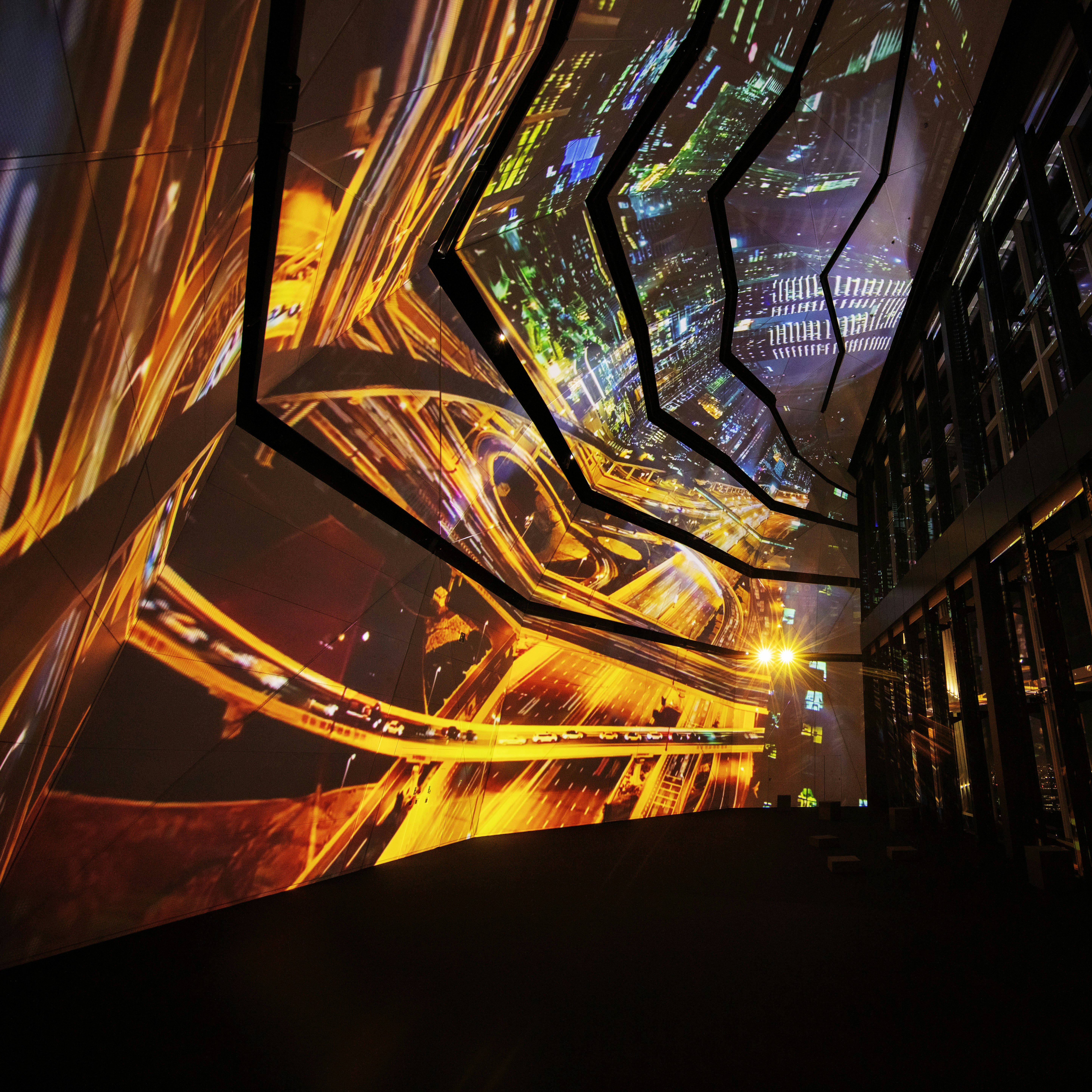 TOKYO NODEの特徴でもあるドーム型空間では、その形状を生かしたダイナミックな映像を鑑賞することができる。金魚や都市の光、空など次々と変わりゆく景色はまるで夢のなかのようだ。クッションに身を預けることで、よりいっそう没入感ある体験を味わうことができるだろう。