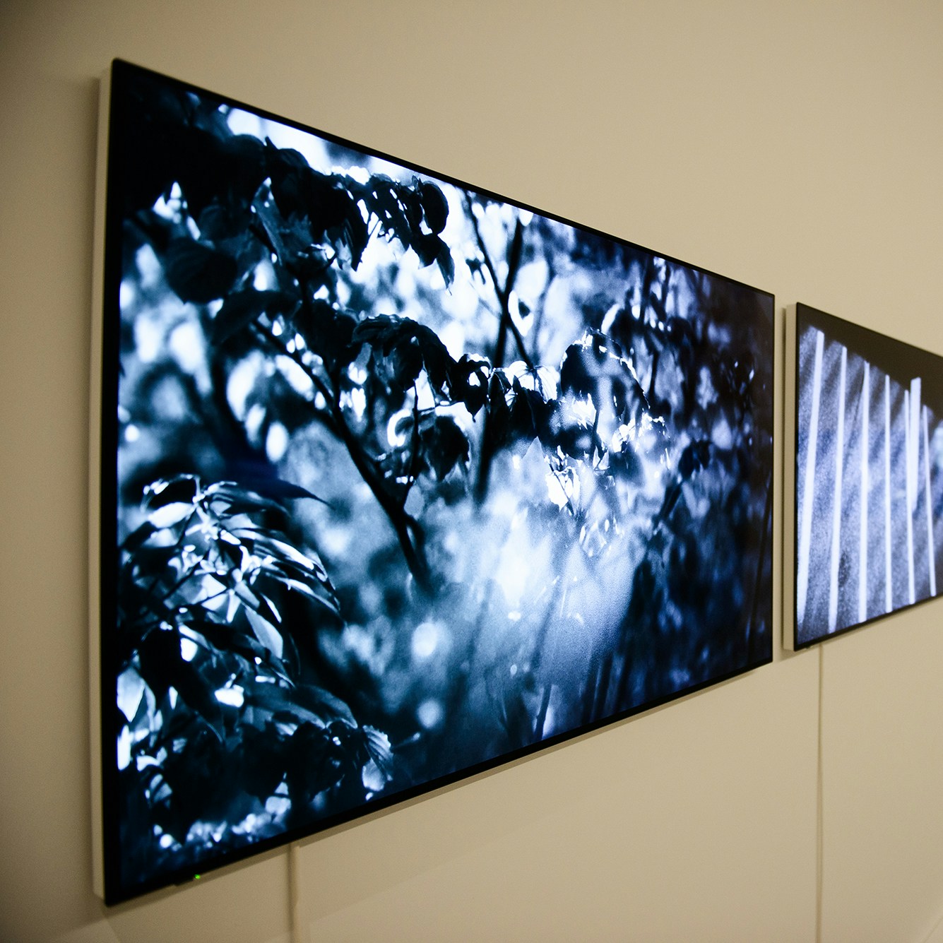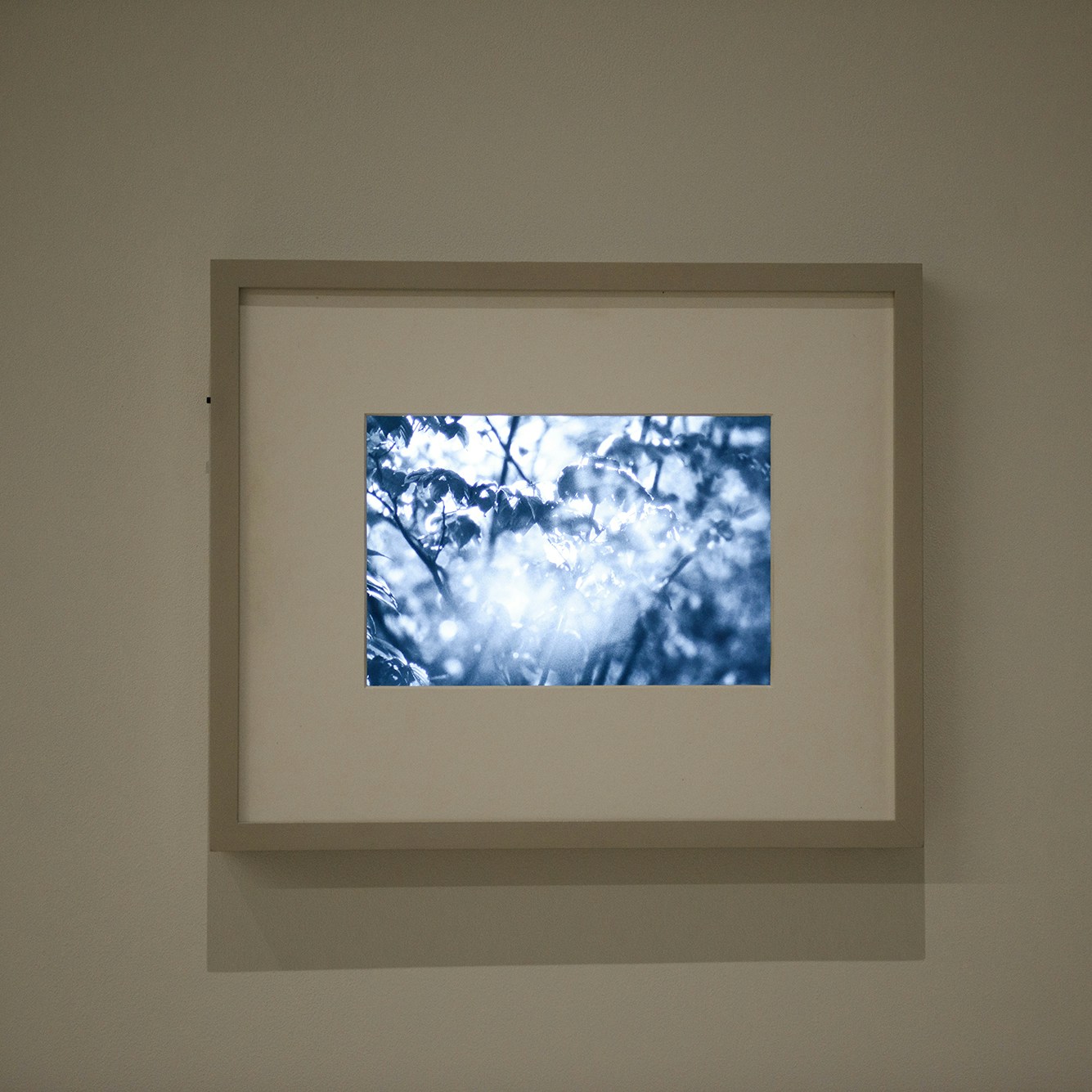 光と影が抽象的な画面を描きながら移ろい、時間を忘れて見入ってしまう12点の映像作品。あわせて12点の写真作品も展示されており、そこには、共同脚本およびプロデューサーとして映画に携わった高崎卓馬が手がけた4点の詩が添えられている。いずれも「風が吹く」の1行から始まり、木漏れ日の移ろいが自身とどのように関係しているのかを端的に綴っている。