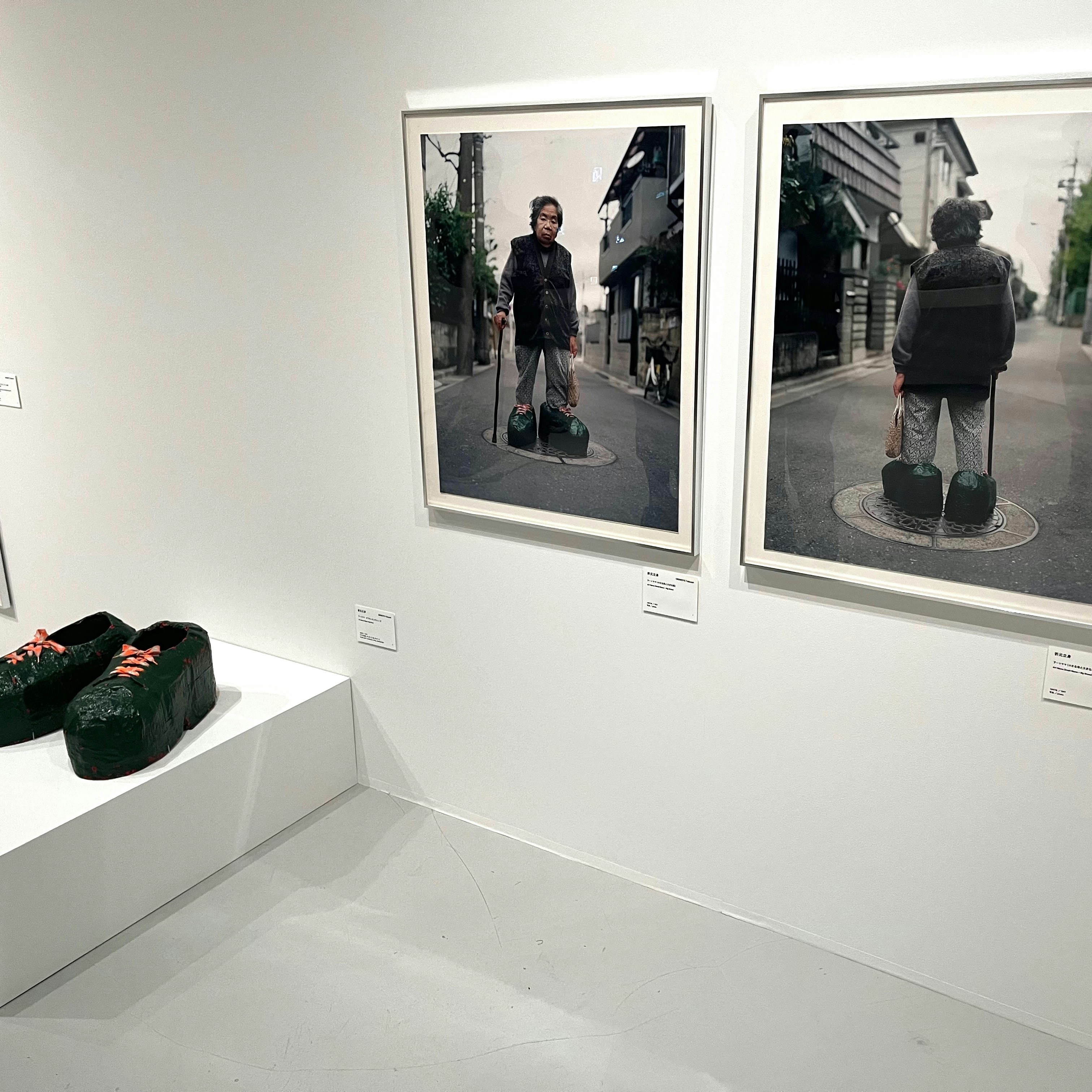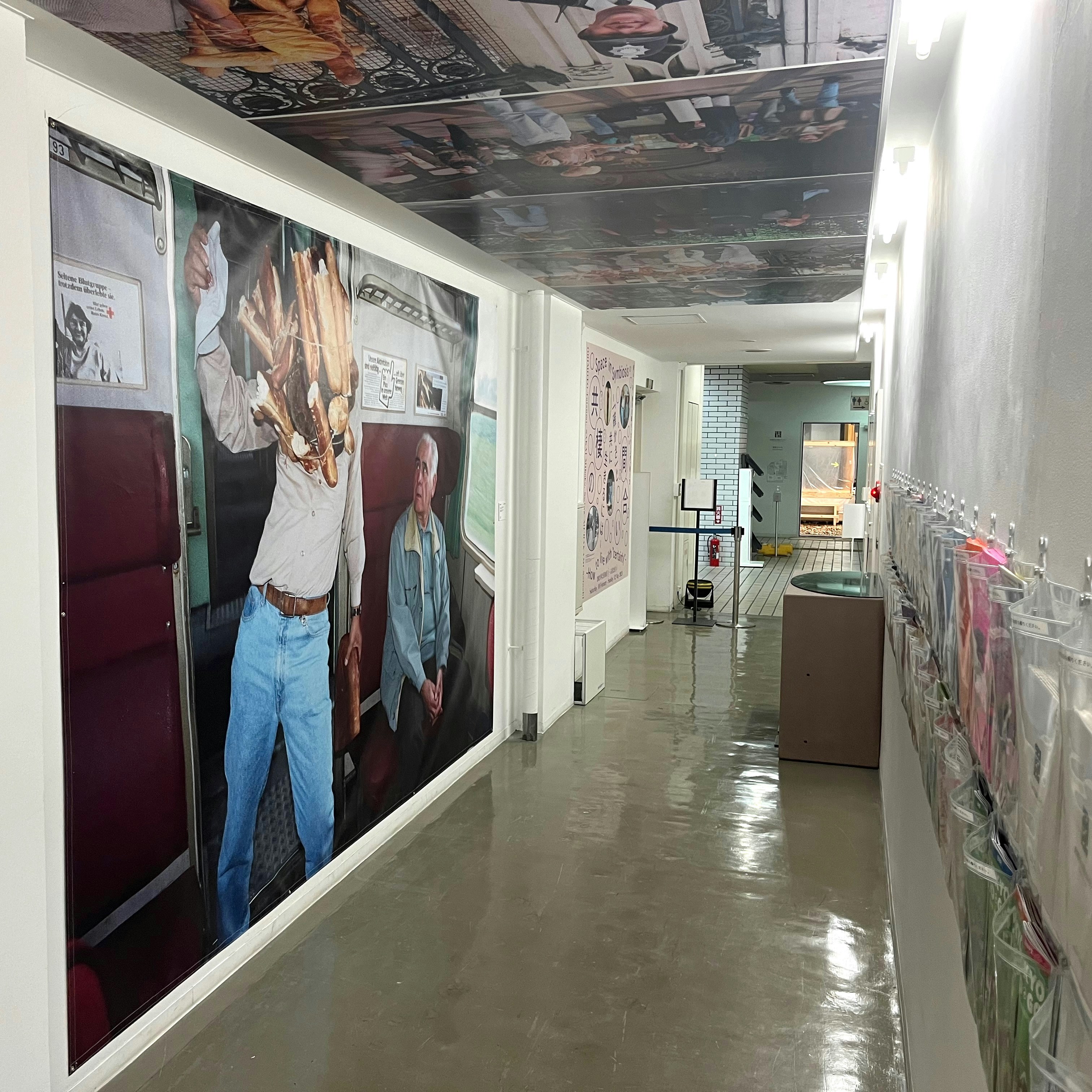 折元立身は1946 年川崎市生まれ。顔中をフランスパンで埋め尽くした「パン⼈間」や、認知症を患った⺟の世話をしながら作品にした「アート・ママ」シリーズ等で注⽬され、国際展や世界各地の美術館で個展やパフォーマンスを⾏ってきた。展示室へと向かう廊下と天井には、この折元の《パン人間》のパフォーマンスの写真が展示されている。