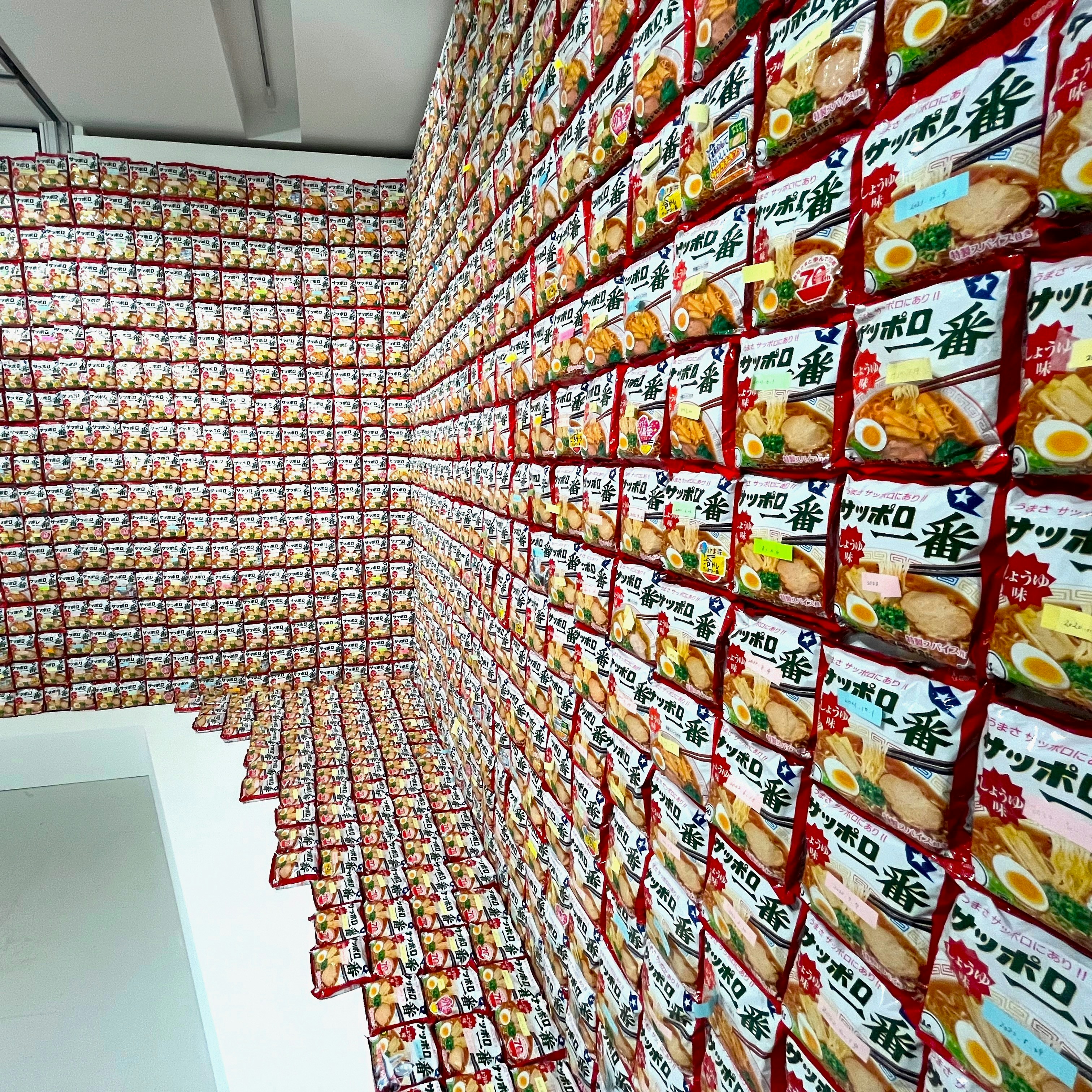 折元の展示の隣には、壁面いっぱいに約1500個にのぼる即席麺の「サッポロ一番」が貼りつけられている。これは滋賀県のアートセンター/福祉施設「やまなみ工房」の酒井美穂子がつくり出したものだ。