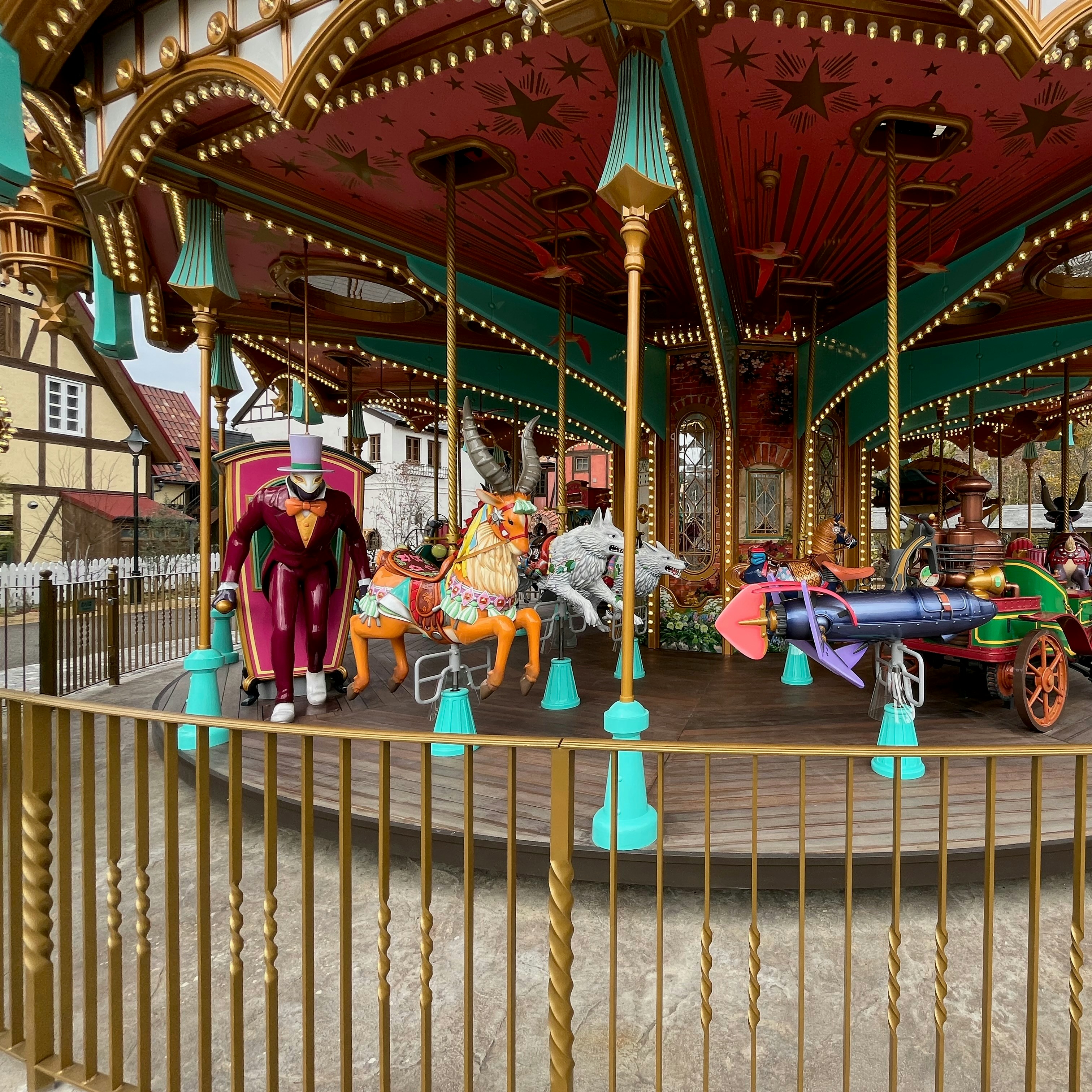 「年に一度、村にやってくる移動遊園地」をイメージしたメリーゴーランド。乗り物はどれも『魔女の宅急便』「ハウルの動く城」『もののけ姫』(1997)といった作品に登場するキャラクターや動物をモチーフとしたもので、見ているだけで楽しくなる。