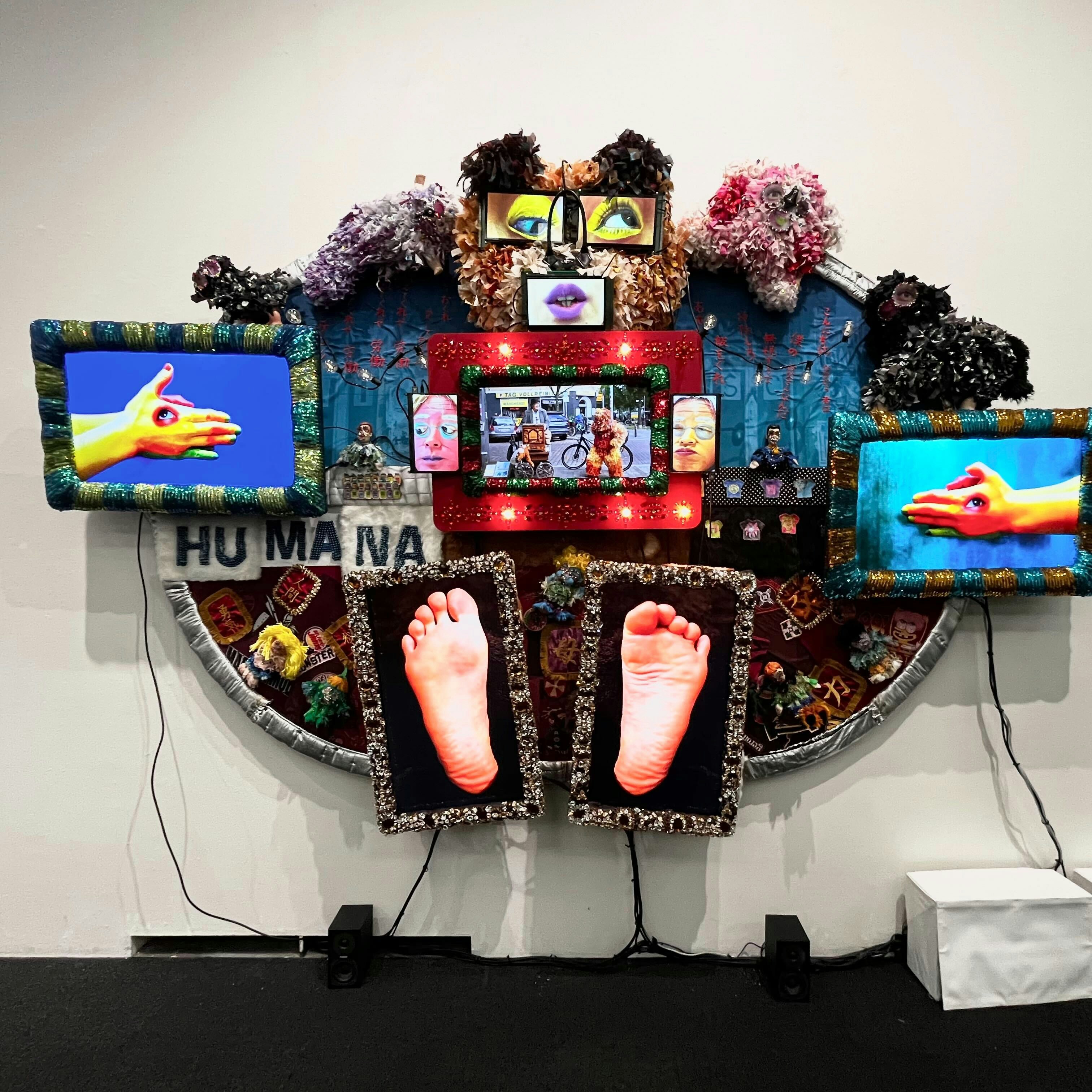 片山は、自らの身体を模した手縫いのオブジェや、ペインティング、コラージュのほか、それらの作品を用いて細部まで演出を施したセルフポートレイトなど多彩な作品を制作する作家だ。本作では、自身の手の画像をプリントした布地にオブジェを縫い付けることで、片山からたくさんの足が広がっているイメージをつくりあげた。普段義足を使用する作家にとって手が足の代わりとなることを示しつつも、その広がりは自由な選択肢があることも示しているのではないだろうか。