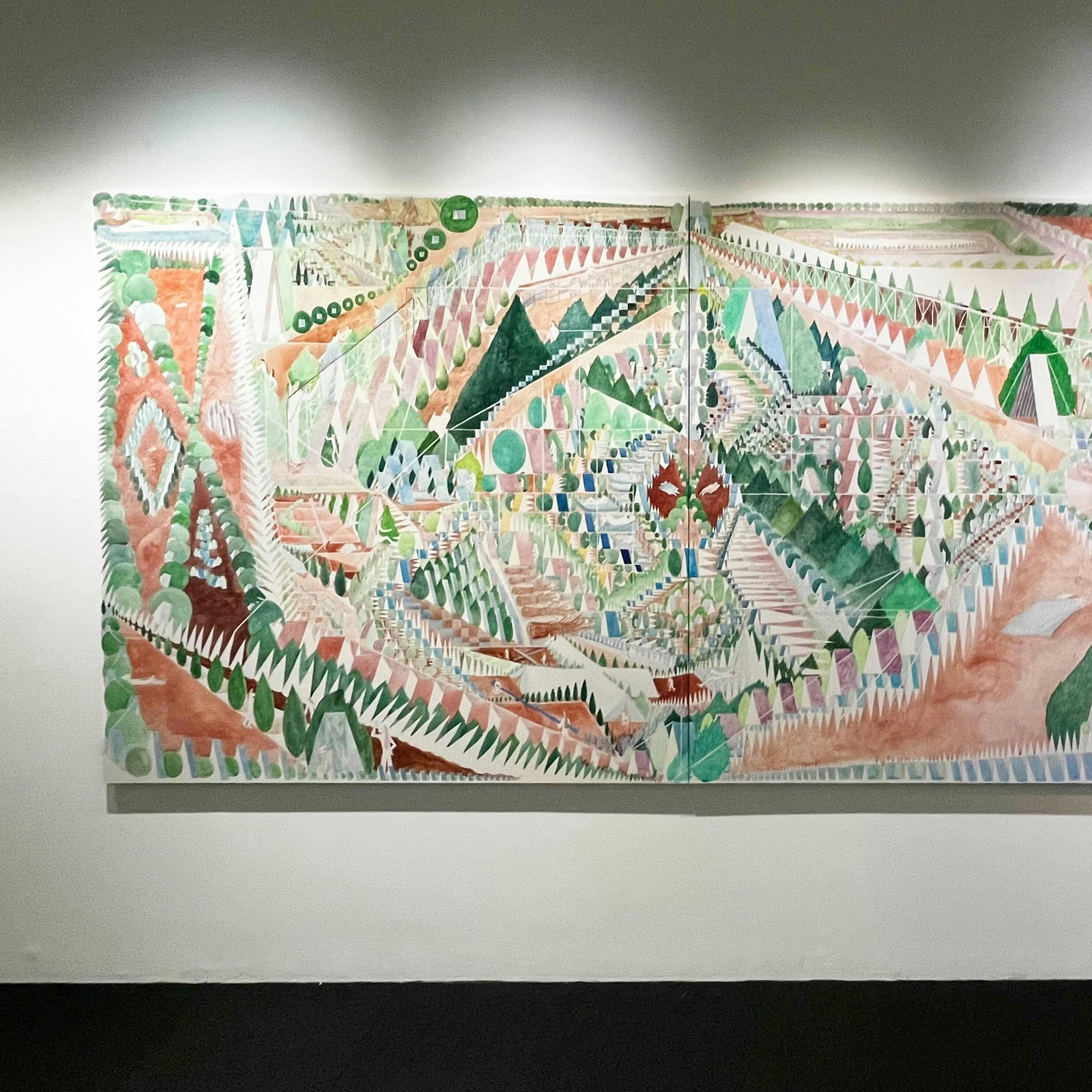 今回の受賞作となった大東による《風景の拍子》は、現在作家が住んでいる秋田県の新屋の風景を描いたものだ。ひと気のない街や辺境地を歩き、夜の暗がりのなかで踊り、その風景を描くという実践を繰り返して描かれた本作は、ありふれた風景のなかに記憶や痕跡、時間といった見えないものが可視化されている。大東は開幕式において「当たり前の日常を過ごすことがかけがえのないことだ、と痛感する事柄が増えている。この当たり前の日常を、たくさんの人に見てもらえる機会があることを嬉しく思う」とコメントした。