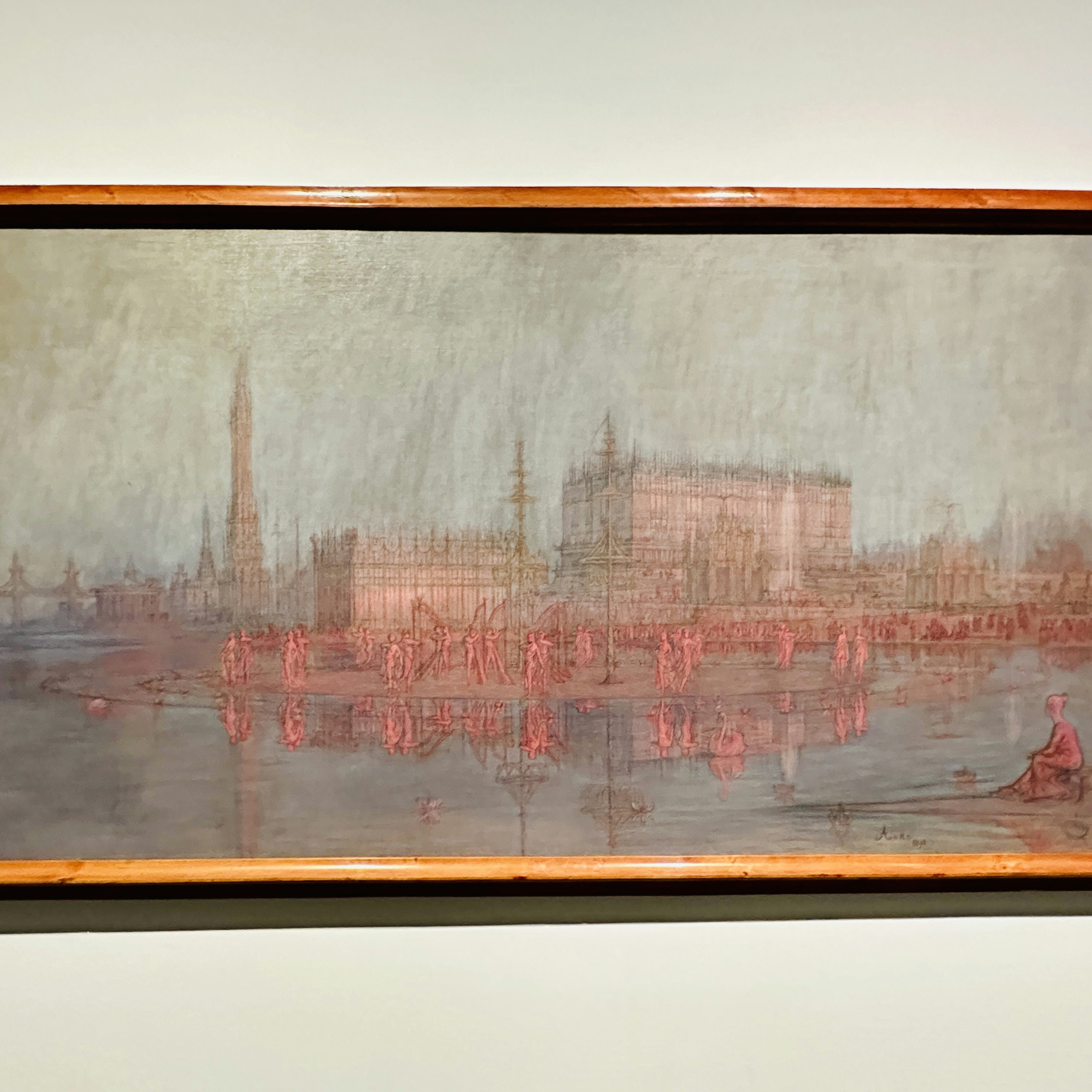 なかでも注目したいのは、J.A.Gアッケによる《金属の街の夏至祭》だろう。スウェーデンの世紀末美術のなかで、もっとも謎めいた絵画のひとつとされるこの作品。ゴシック風の建築が並ぶ街を背景に、前景にはステージのような丸い島と池が広がる。そこで踊る複数の人々はすべて赤く描かれている。スウェーデンの伝統行事である夏至祭を取り入れたものだが、その文学的な典拠は不明だという。