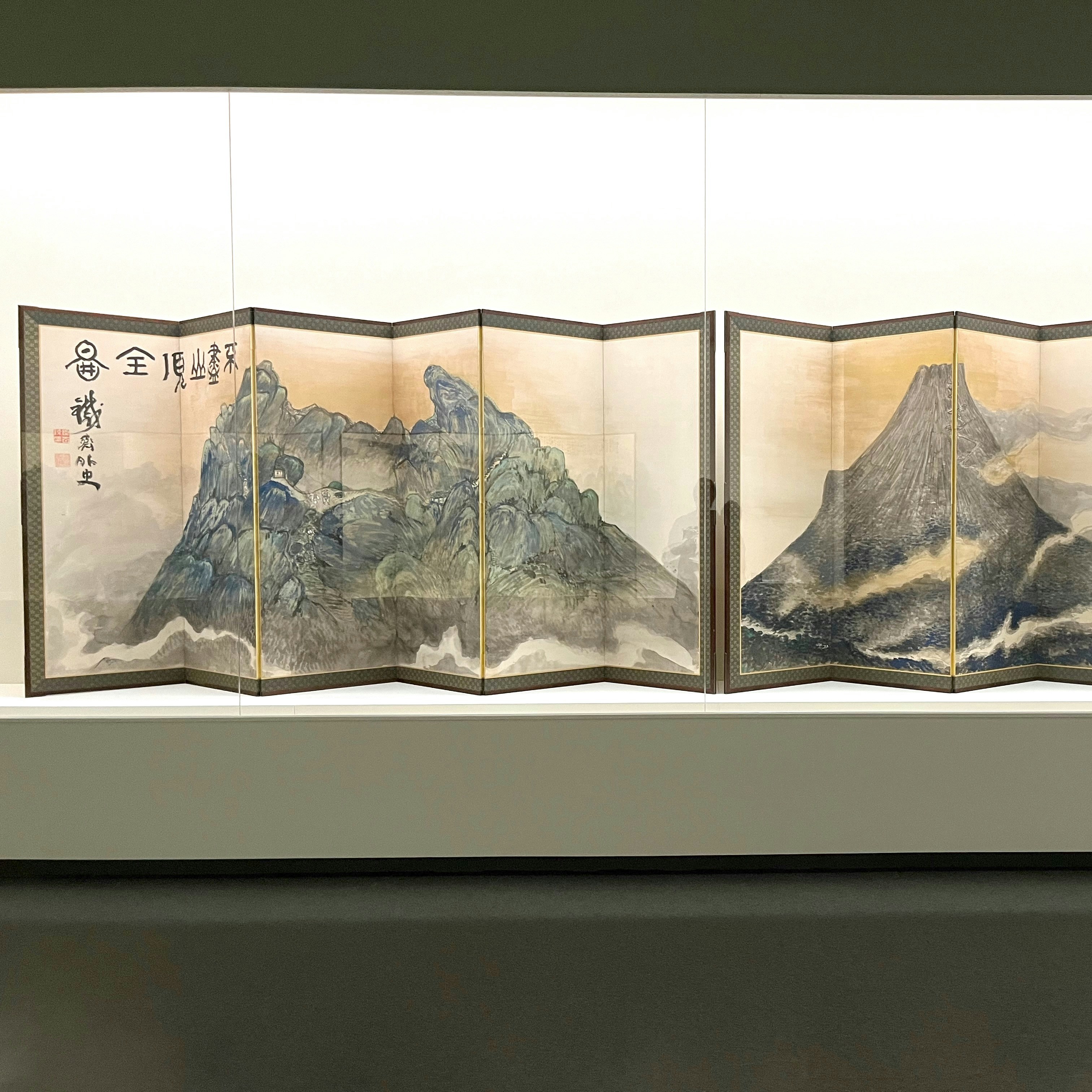 本章でもとくに多くの人の目を引く作品と言えるのが《富士山図》(1898)だ。生涯において幾度も富士山を描いた鉄斎だが、本作はとくに異彩を放っているとされる。右隻に富士の山容を、左隻に火口をクローズアップするという独特の構図とともに、江戸期の文人である池大雅、高芙蓉、韓大年が連れ立って富士山、立山、白山の三霊峰に登った逸話を賛として記している。