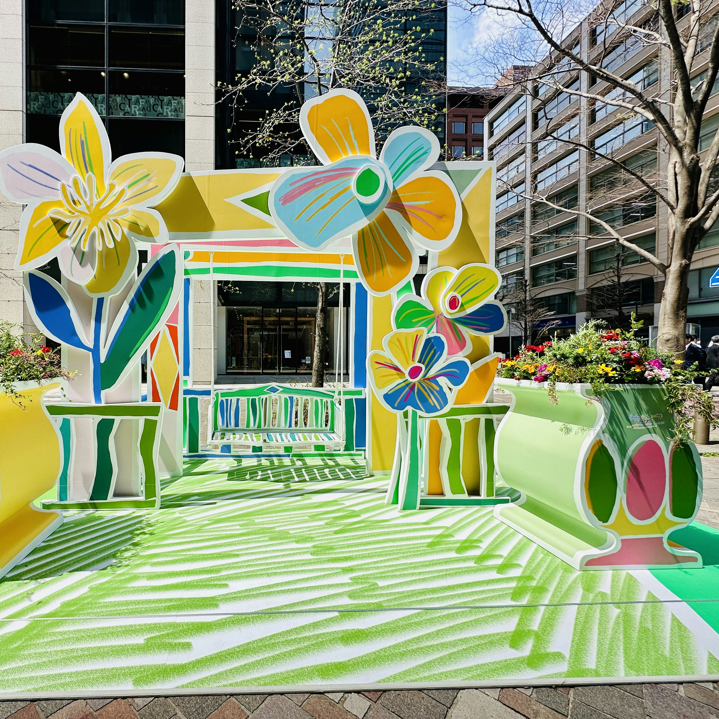 このプロジェクトでは、丸の内仲通りを舞台に、開いたスケッチブックの中を散歩しているような世界が展開。ナヴェの特徴である鮮やかな色彩とエネルギッシュな線で描かれたパステル画が、大型の彫刻作品やアーチ、ベンチ、パーゴラなどのオブジェとなり、立体的な没入型インスタレーションとして広がっている。