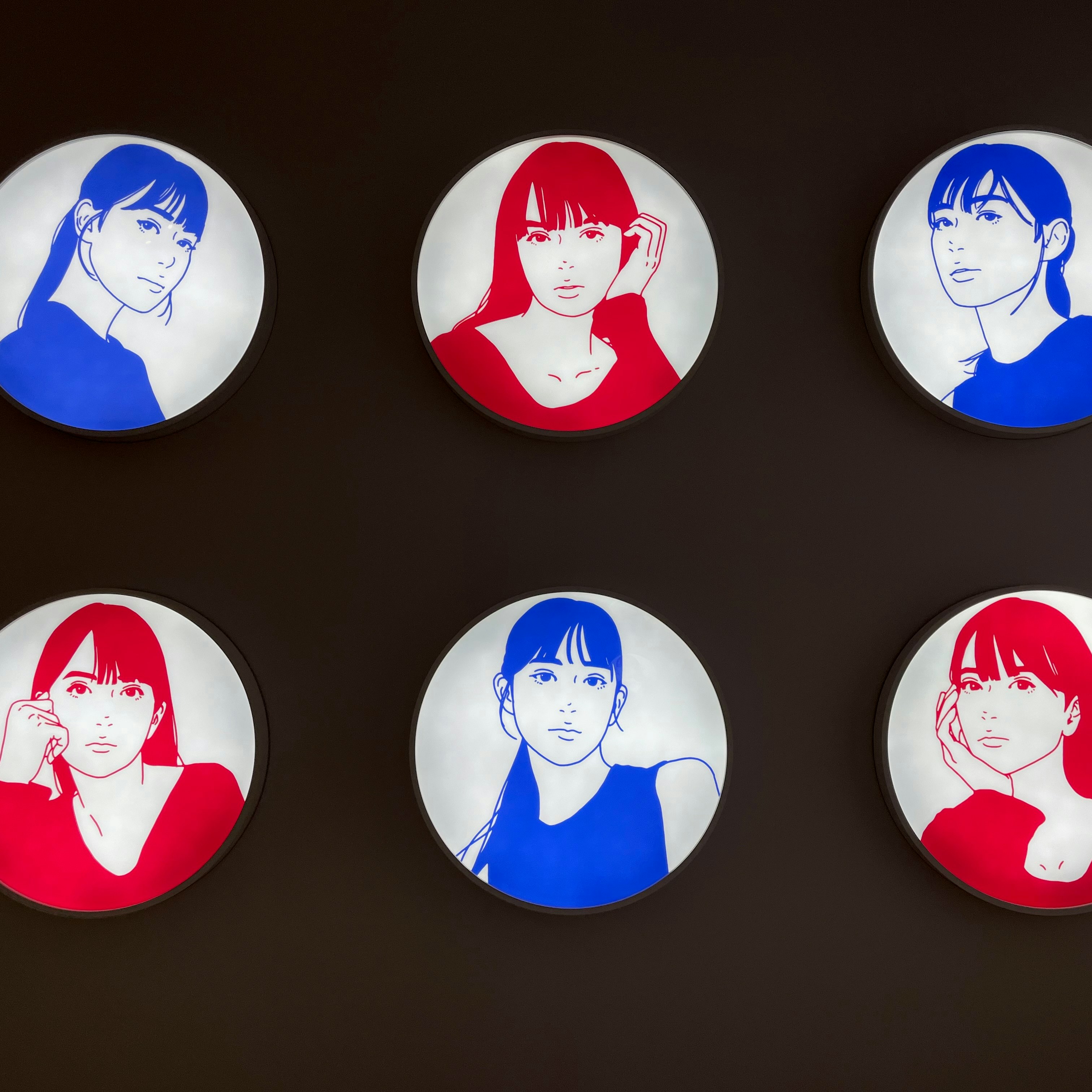 このゾーンでは、KYNEの名を世に知らしめたポートレート調の作品をはじめ、雑誌『カーサ ブルータス』(マガジンハウス)の表紙絵の原画、アディダスや渋谷の「MIYASHITA PARK」、そして村上隆とコラボレーションした作品など、近年のカルチャーの流行を象徴するような作品が並ぶ。