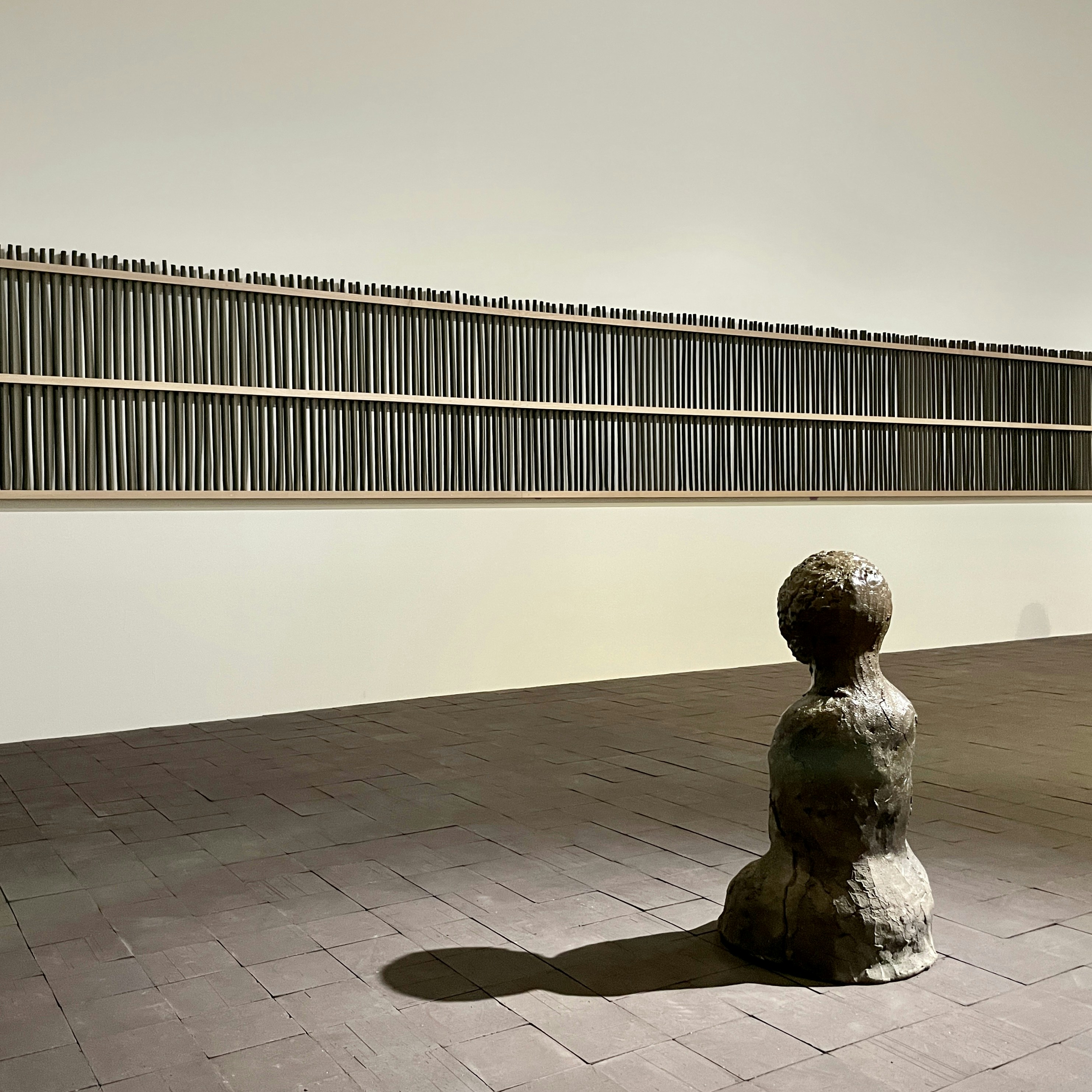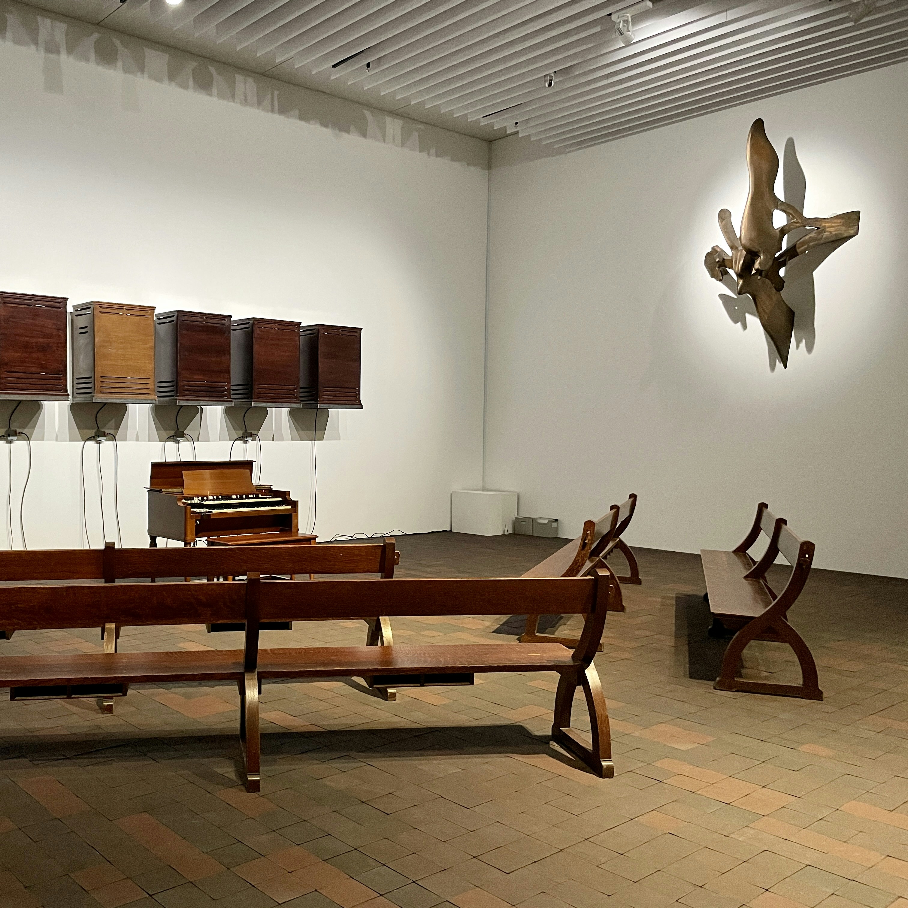 次の展示室に入ると、床板のきしみに気づくかもしれない。ここに敷かれているのは、常滑市の製陶所で本展のために制作された1万4000個の煉瓦からなるゲイツの新作《散歩道》(2024)だ。鑑賞者の動きによって緊張感が生み出され、寺社仏閣のような神聖な雰囲気が醸し出されている。こうした空間では、京都の香老舗・松栄堂の調香師とともにつくった香の彫刻《黒人仏教徒の香りの実践》(2024)や、7つのスピーカーと1台のオルガンで構成されるインスタレーション《ヘブンリー・コード》(2022)なども展示されており、会期中にはこのインスタレーションを演奏するパフォーマンスも行われるという。