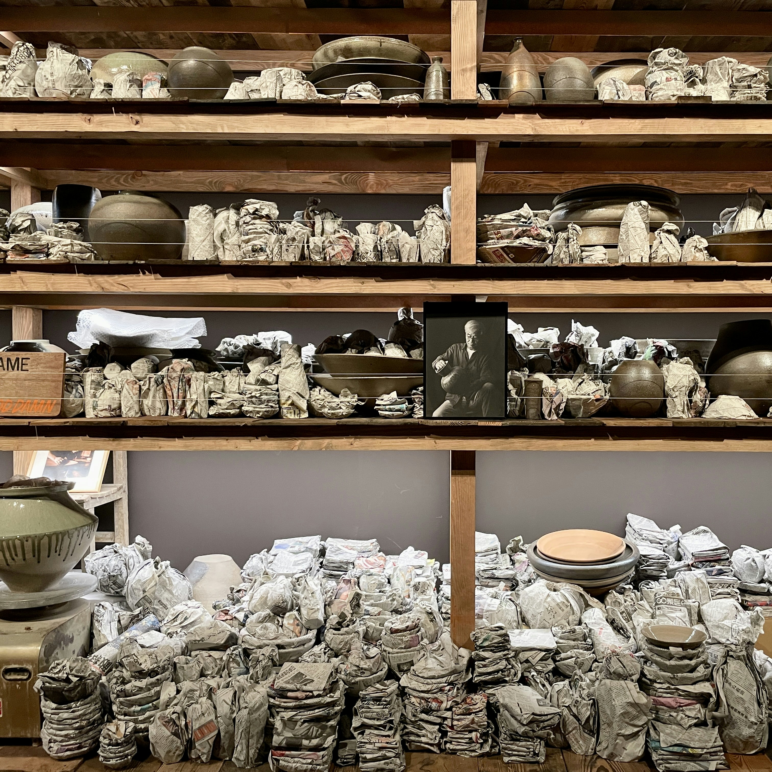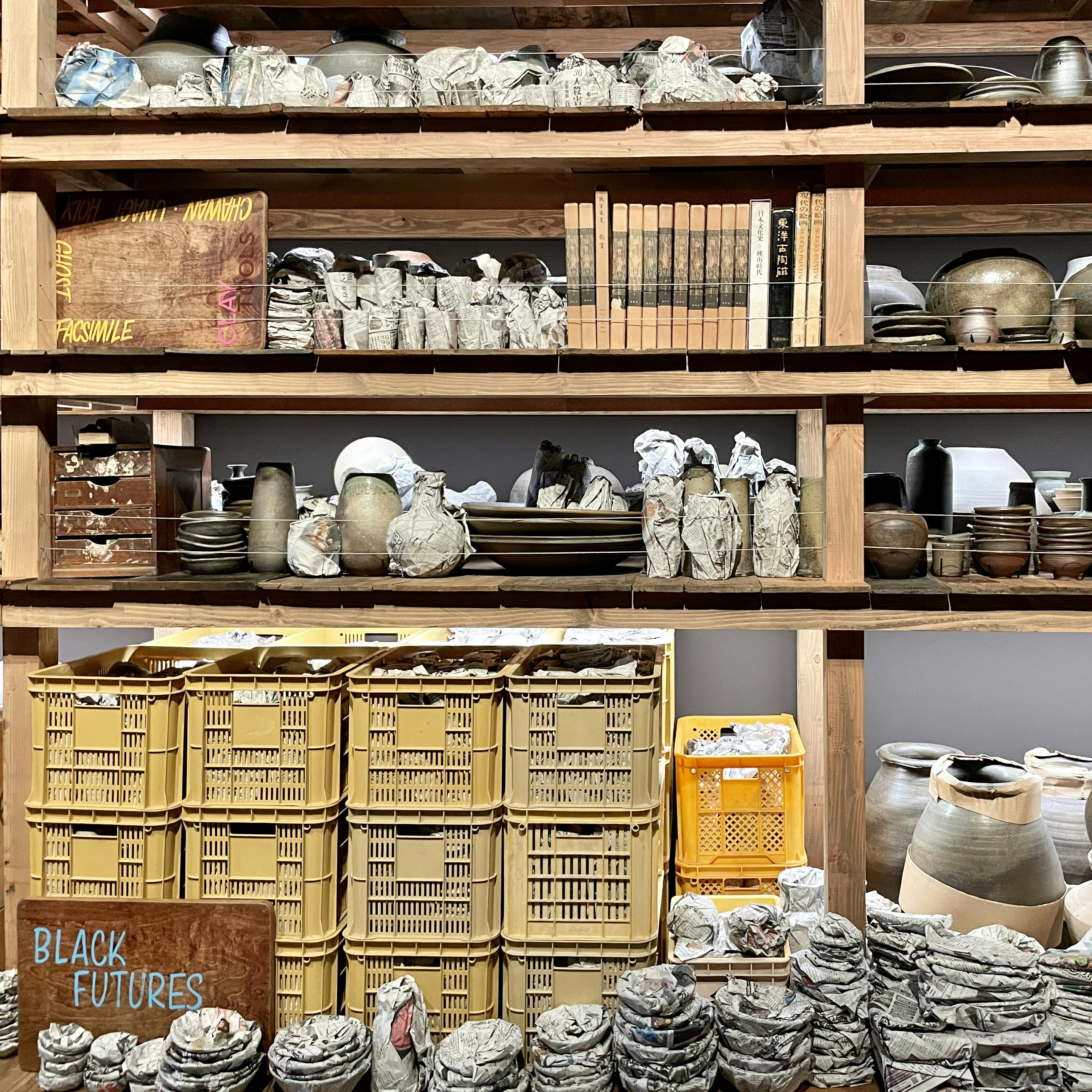 まず同章で大きな存在感を放つ大型インスタレーションのひとつは、常滑出身の陶芸家・小出芳弘(1941〜2022)による約2万点の陶芸作品で構成される作品。ゲイツは、ひとりの陶芸家としての生涯をも表すこれらの作品を引き受けて、作品を梱包し、目録を作成し、美術館で展示することで作品に新たな意義を与えた。