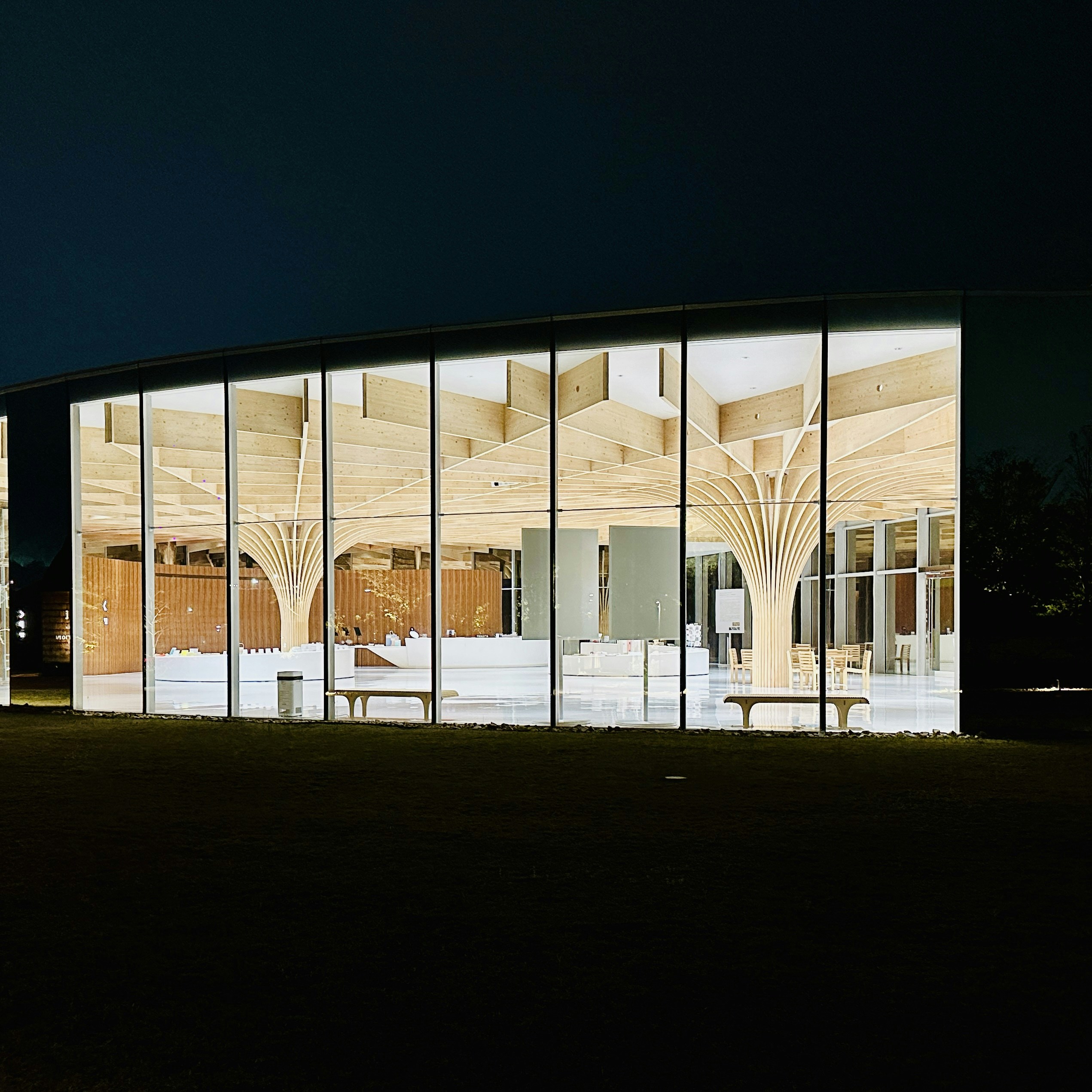 ショップやカフェがあるエントランスはこの美術館の象徴的なスペースと言える。内部で存在感を放つのは、36本の木材を1本にまとめた巨大な2つの柱。柱は大樹のように放射状に大きく広がっており、空間をより広大なものに感じさせる。