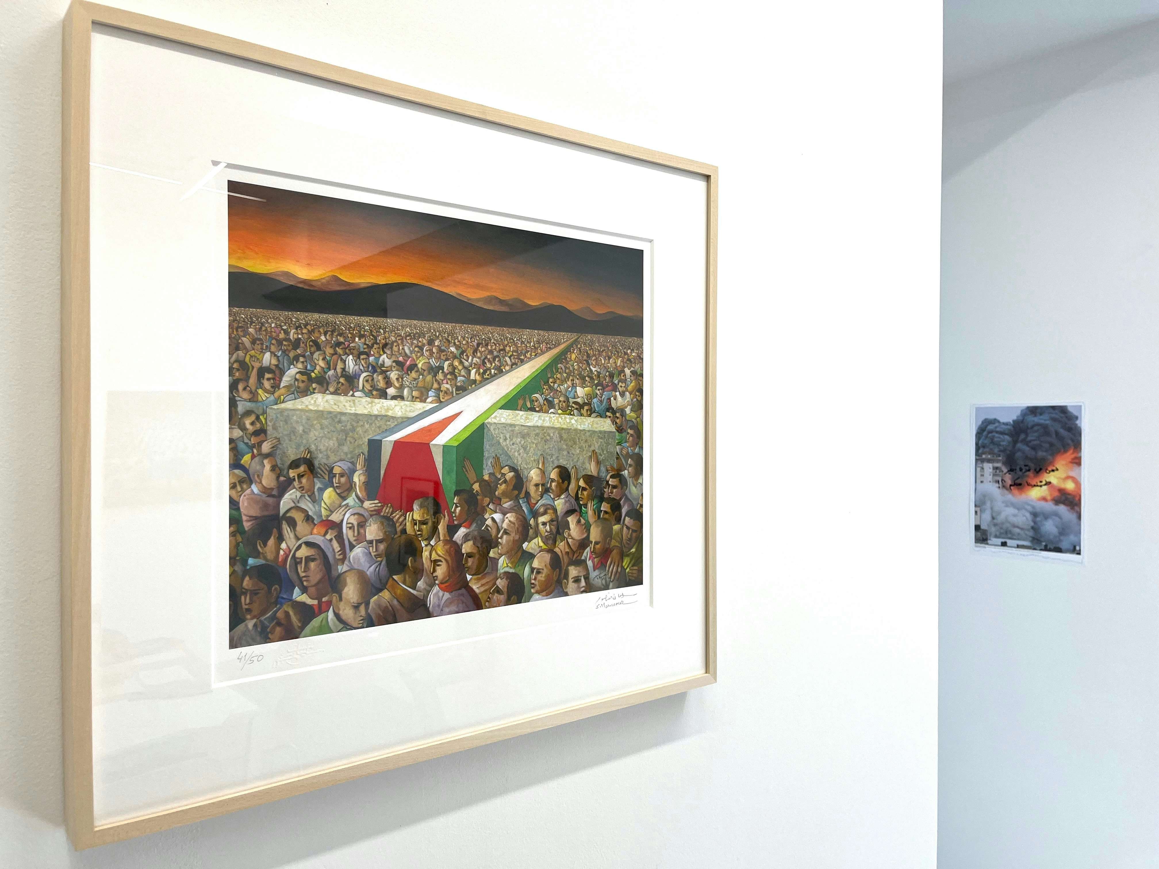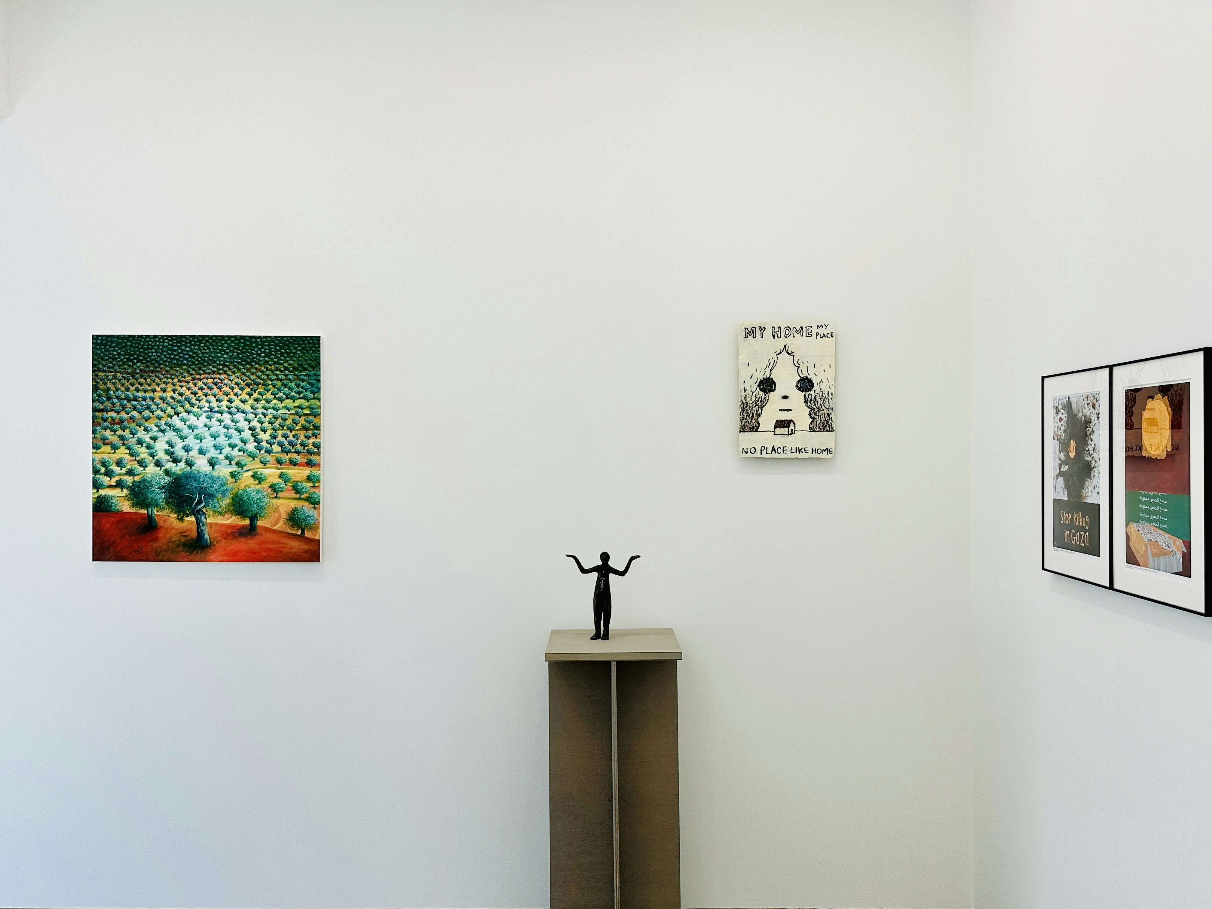 展示風景より、左からスライマーン・マンスール《Yaffa》(1979)、ヘンク・フィシュ《The wall》(2014)、「Posters for Gaza」シリーズのTayseer Barakat「Not Everything is Forgotten」