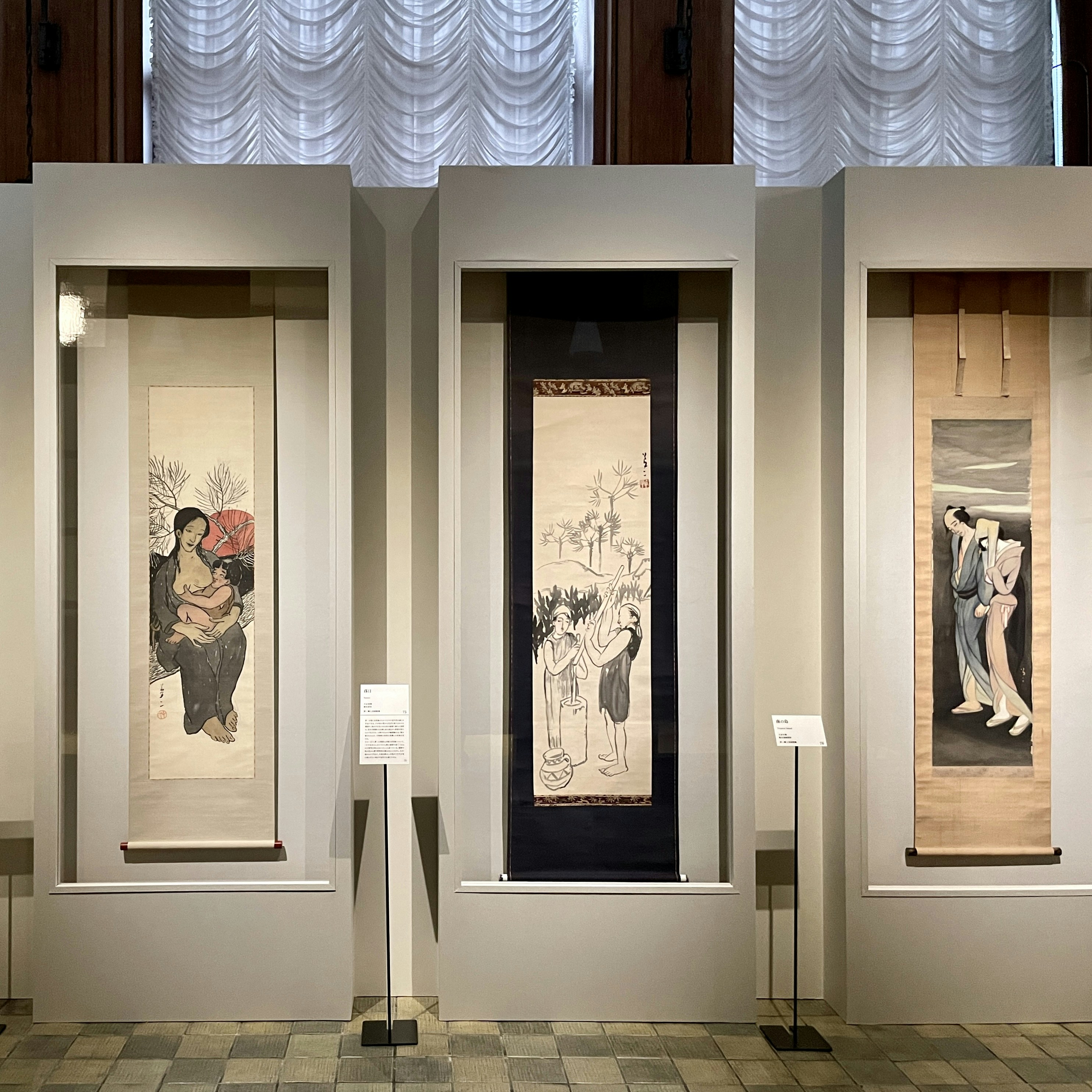 また、同じフロアに展示された軸装の《加茂川》(1914)と油彩画の《女》(1918)は、夢二郷土美術館創設者で初代館長の松田基が1951年に梅田の古書店で出会い、初めて購入した夢二の作品。この出会いを機に夢二の里帰りを念じた本格的な作品収集を開始し、15年後の夢二郷土美術館の創設に至った。