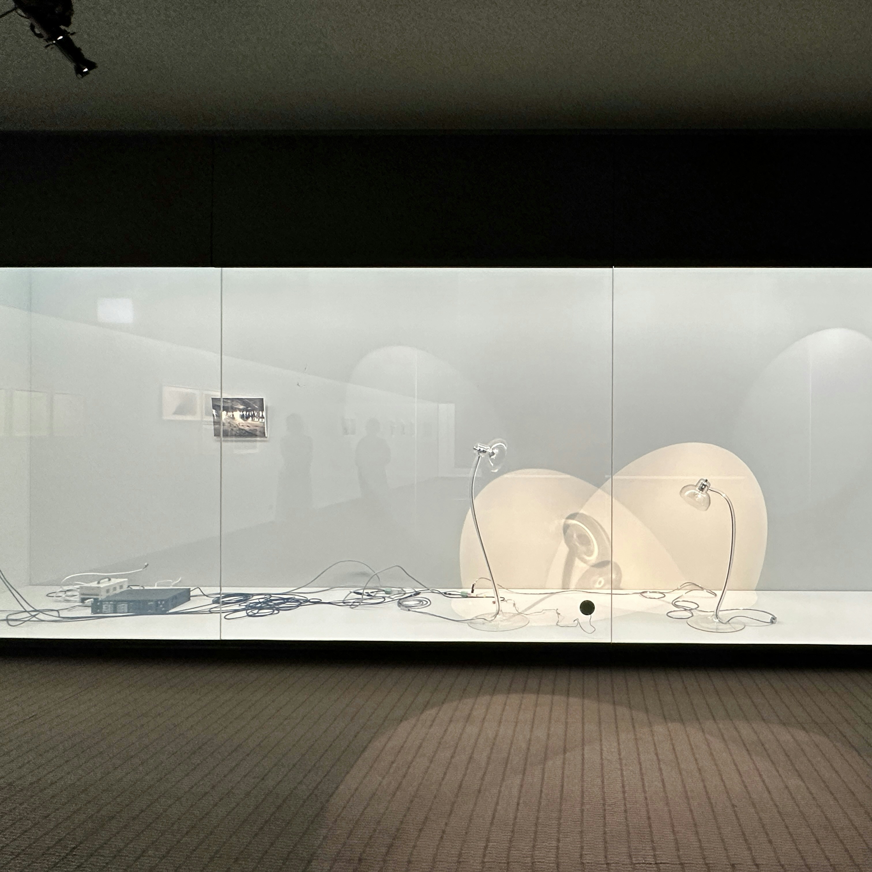 展示風景より、ガラスケースの中にある2つのガラスランプはそれぞれ《幸せな結末》(2014-15)