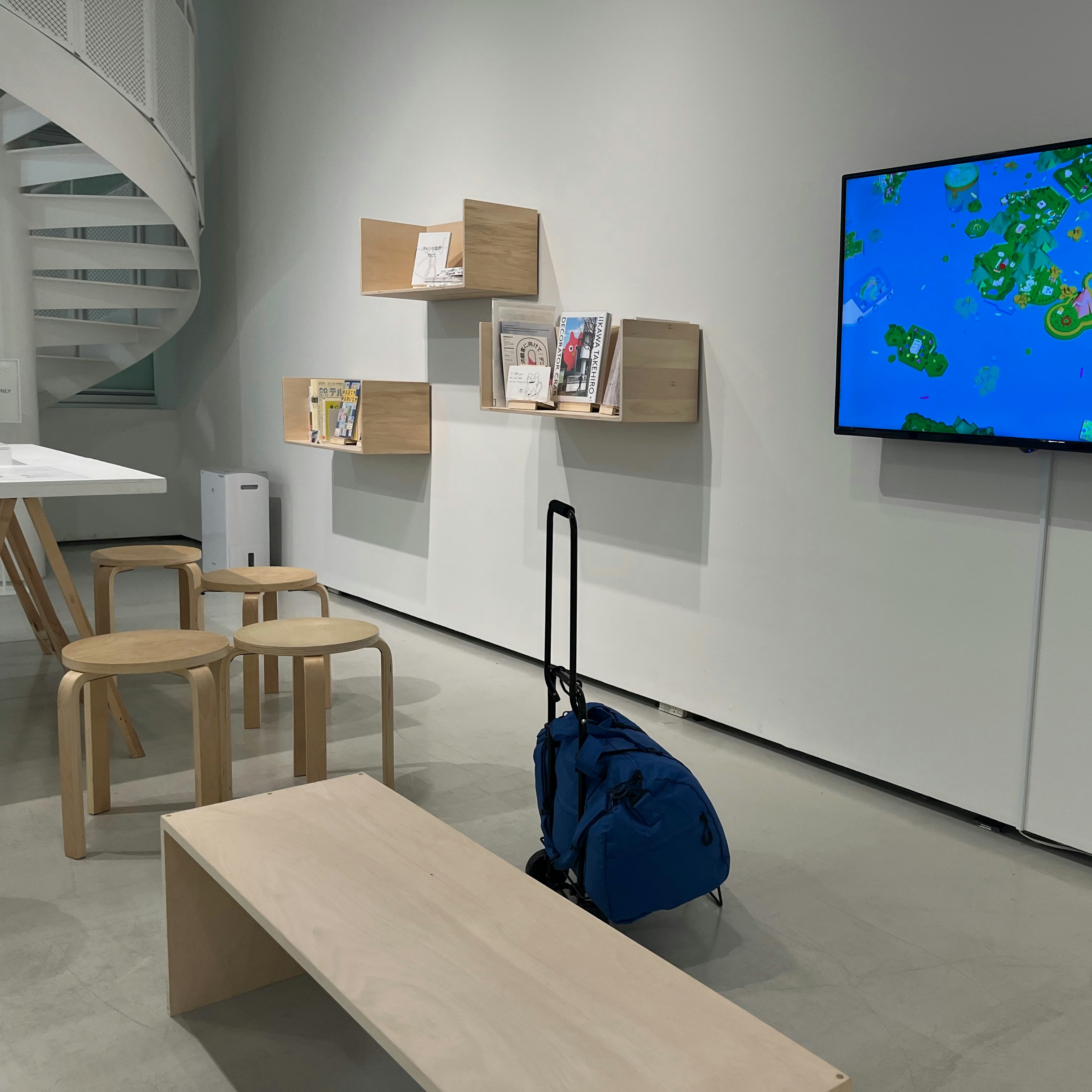 展示室1では、飯川、ユ、原田、土谷の作品を展示している。まず目につくのは、誰かの忘れ物であるかのように放置された、複数のキャリーカートに取り付けられたバッグだろう。これは飯川の作品《デコレータークラブ─新しい観客》(2024)だ。