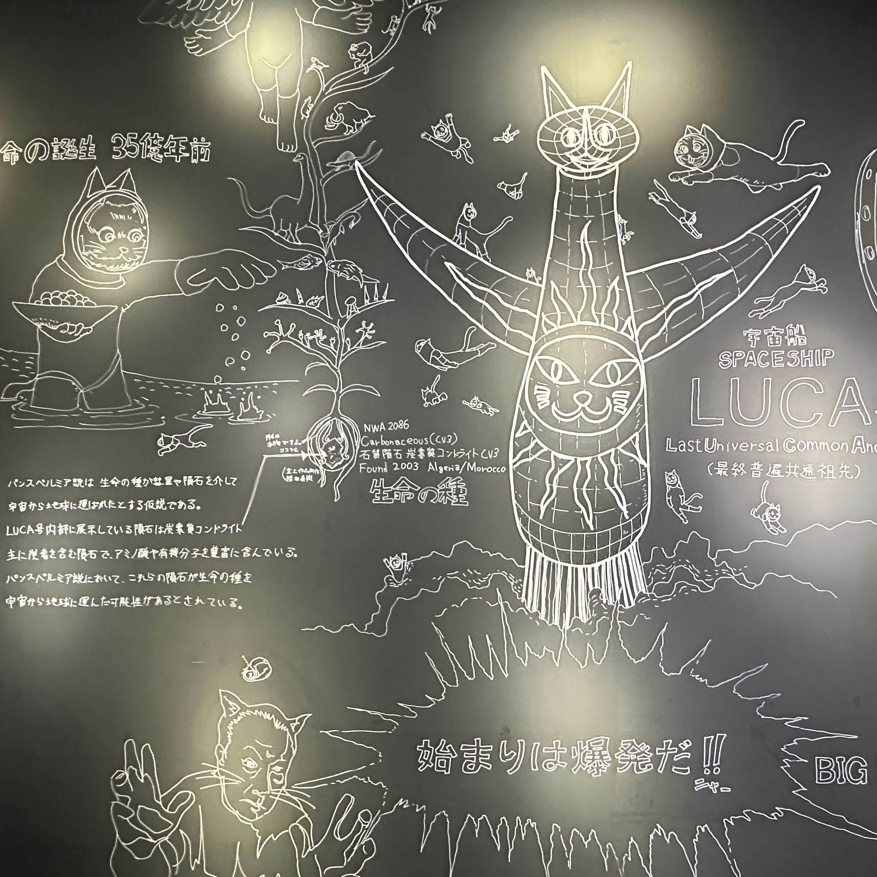 展示の中心となるのは、《BIG CAT BANG》。これは、宇宙船「LUCA号」(LUCAとはLast Universal Common Ancestor=最終普遍共通祖先の意味)に乗って地球に到達した「SHIP'S CAT/宇宙猫」が、無機質だった地球に生命を着床し、役割を終えたあと、《太陽の塔》となりその痕跡を残している、というヤノベが構想した壮大なフィクションだ。