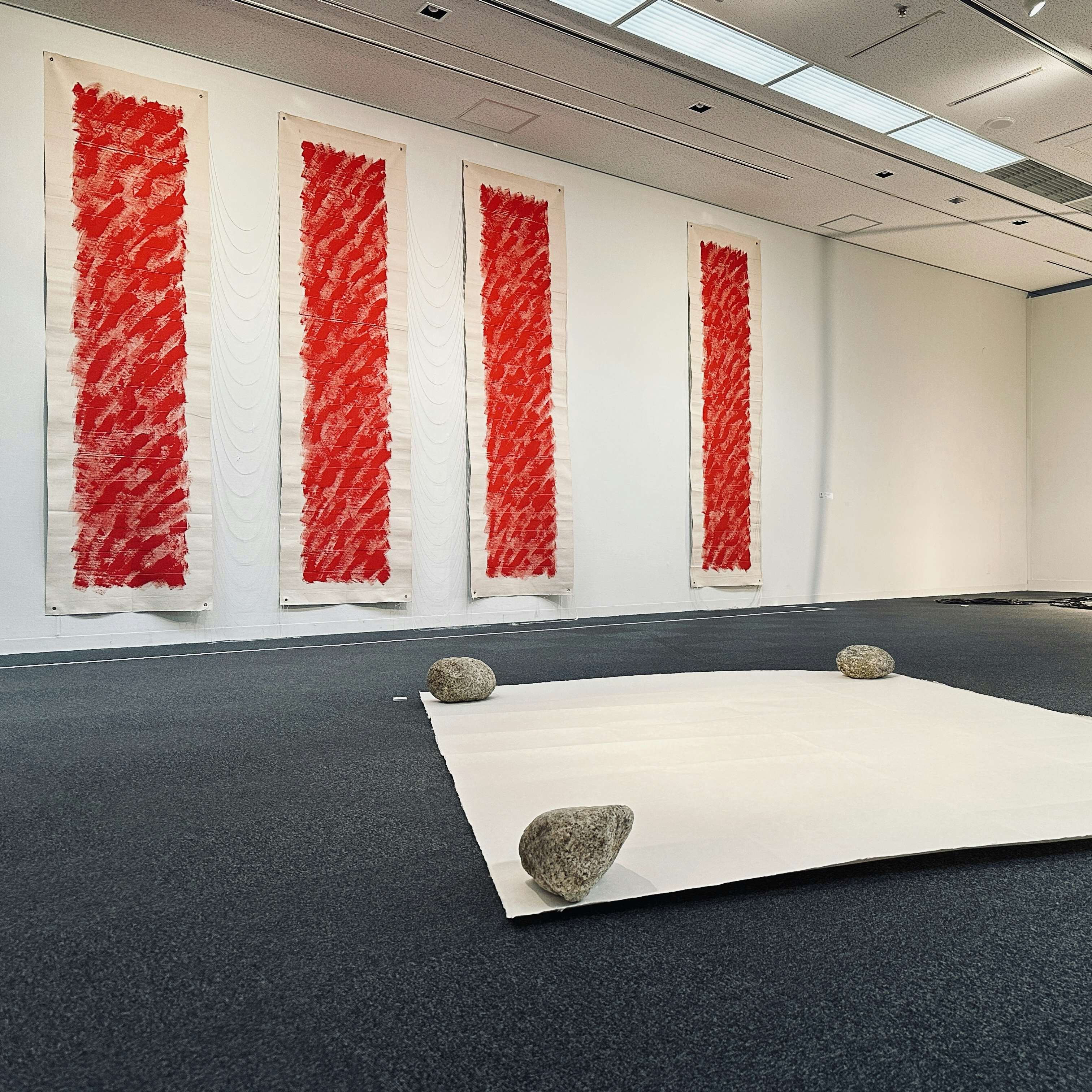現在、もの派は世界的に大きな注目を集めているが、その作品の特徴から、当時の作品の多くは現存していない。そこで本展では、吉田、そしてもの派の動向にとって重要な2作品(紙と石を用いた《Cut-off(Paper Weight)》と、木と石、ロープで構成した《Cut-off(Hnag)》(ともに1969))がThe Estate of Katsuro Yoshida協力のもと再制作され、第1章会場の中央に展示された。吉田の研究者である山本雅美(奈良県立美術館学芸員)は、《Cut-off(Paper Weight)》をこう評している。「本作品は、『新しい芸術とは何か』と問い続けてきた吉田の《位相ー大地》を経てたどり着いた1つの到達点である」(本展公式図録より。