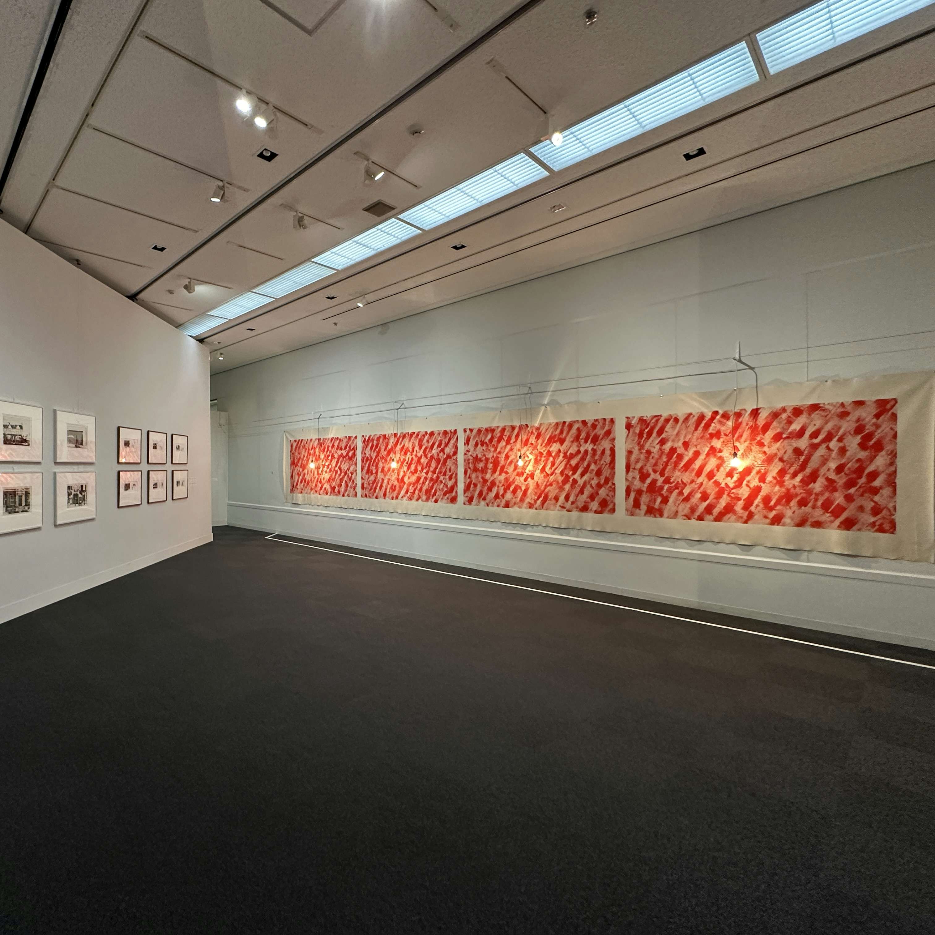 もの派の主要作家だった吉田だが、71年にはもの派の作風から離れ、赤い色彩や筆触といった絵画的な要素を取り入れた作品を発表する。その実践は、《赤・カンヴァス・糸など》(1971-74)、《赤・カンヴァス・電気など》(1971 / 94年再制作)などで見ることができる。