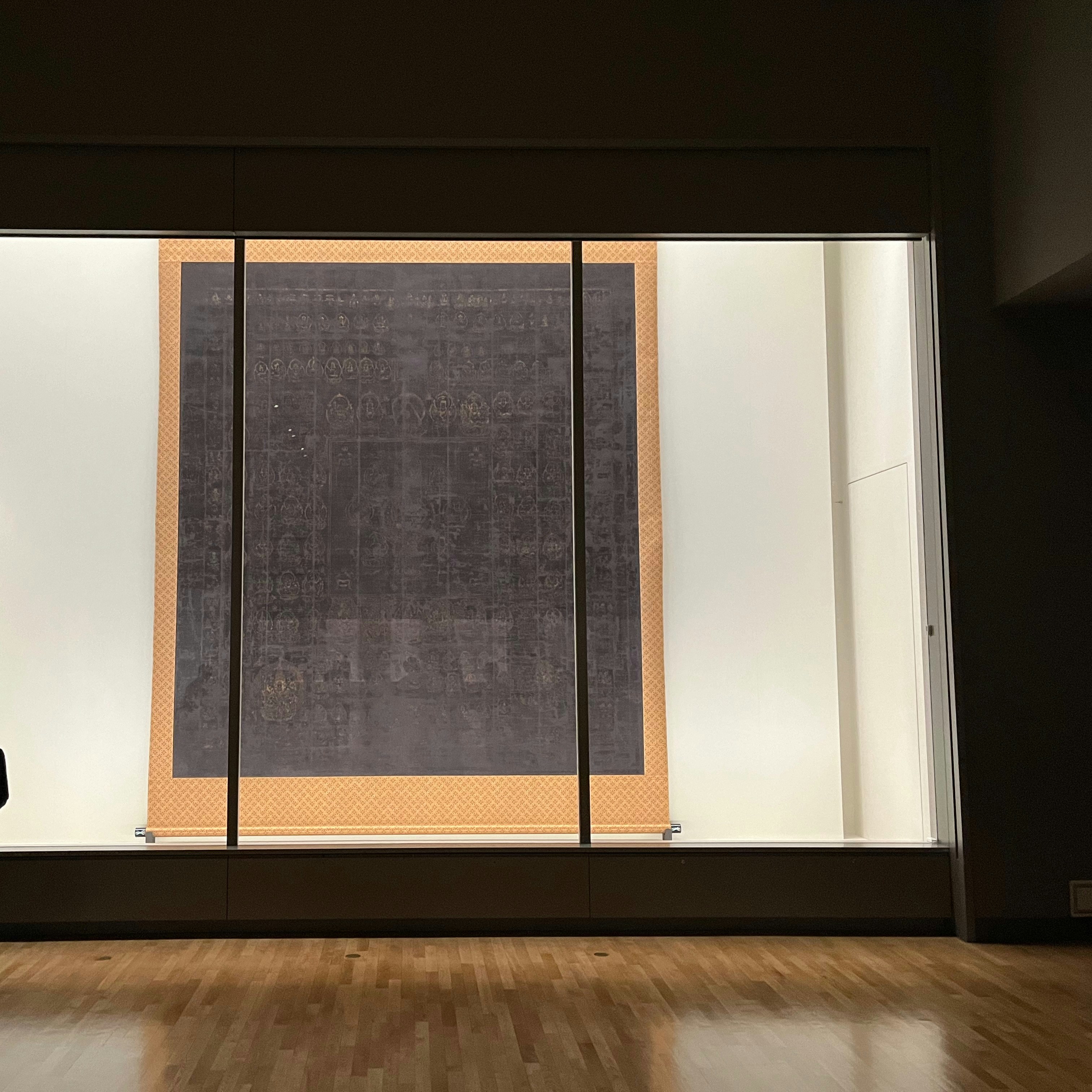 第2章「神護寺経と釈迦如来像──平安貴族の祈りと美意識」では、鳥羽天皇が発案したとされ、後白河法皇によって奉納された神護寺経などを展示することで、貴族の祈りの文化を紹介。第3章「神護寺の隆盛」では、神護寺に伝わる文書や荘園図などが展示されている。加えて第4章「古典として神護寺宝物」では、江戸時代以降も模本など密教を学ぼうとした人々が残した文物が並ぶ。