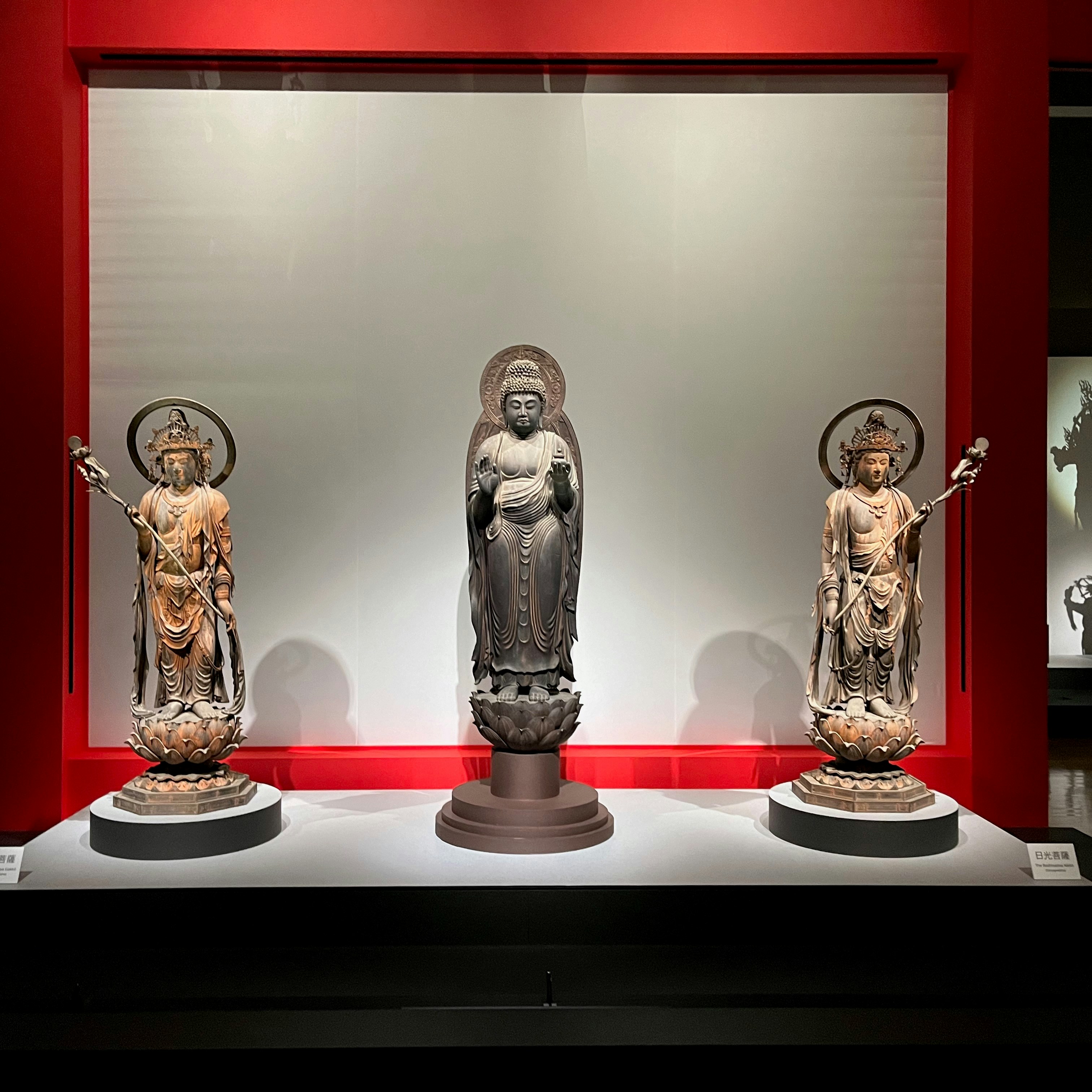 そして、第5章「神護寺の彫刻」では、神護寺に伝わる彫刻が一堂に紹介されている。本尊、《薬師如来立像》(平安時代、8〜9世紀)は合併して神護寺となる前につくられたとされる。威厳に満ちた表情や重厚な布ひだの表現などから、日本彫刻史上の最高傑作と言われる本像と、かつての空海と同じように対峙してみてほしい。さらに《薬師如来立像》の両隣には《日光菩薩立像》《月光菩薩立像》(平安時代、9世紀)が配置され、その細身の身体のしなやかな造形を楽しむことができる。