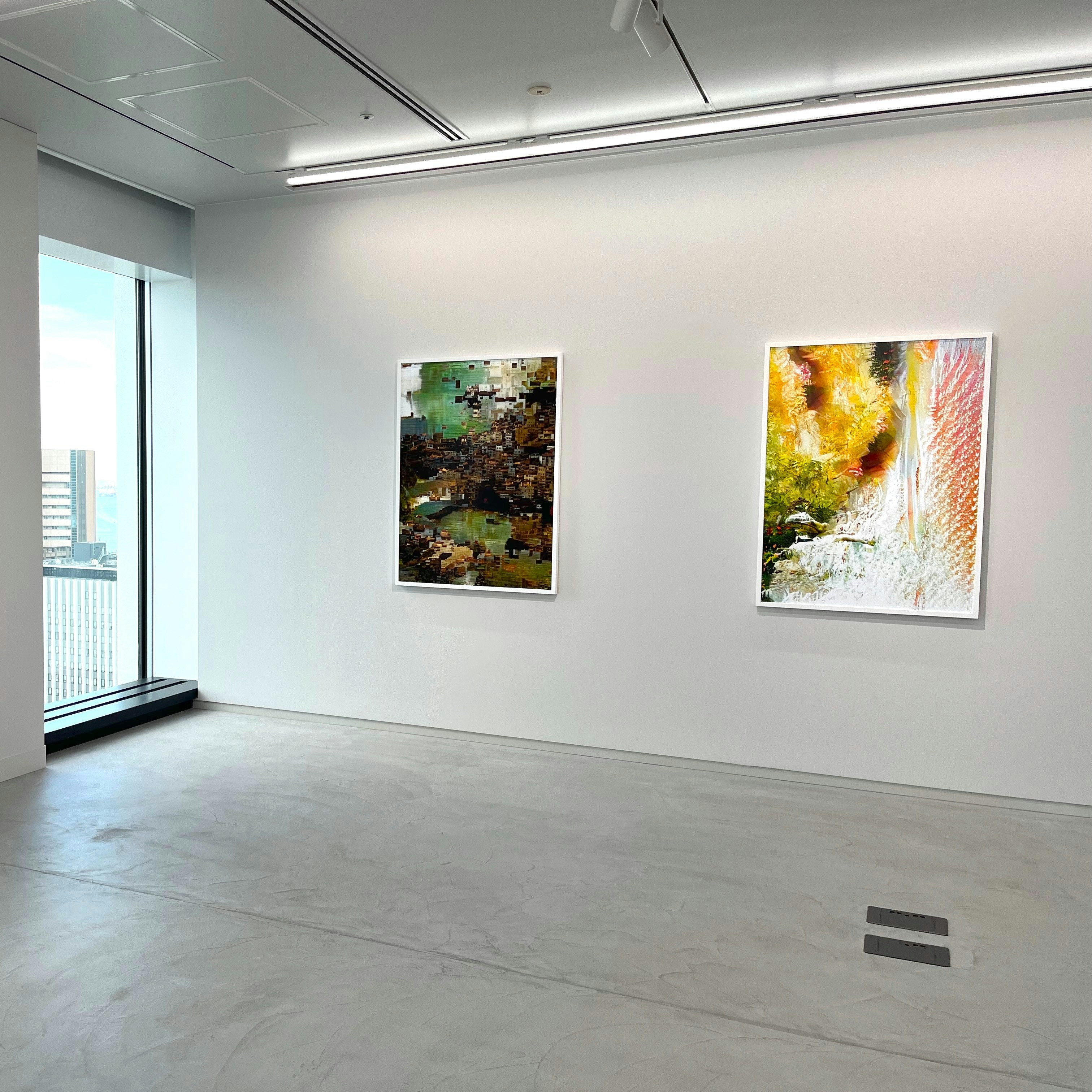 なぜ本展の作品は「風景画」なのか。それは本作の制作手法にある。まず苅部は、液晶テレビの受信部を接触不良にして任意の画像にグリッジを発生させ、それをデジタルカメラで撮影した。撮影した画像データに回転やトリミングなどを行い、生成AI搭載の画像編集ソフトに入れて風景写真として認識させることで、システムを錯乱させることで作品を生成。こうして、AIが風景ではない画像を風景として認識しようとすることで生まれる、AIの見た「風景画」が生まれた。